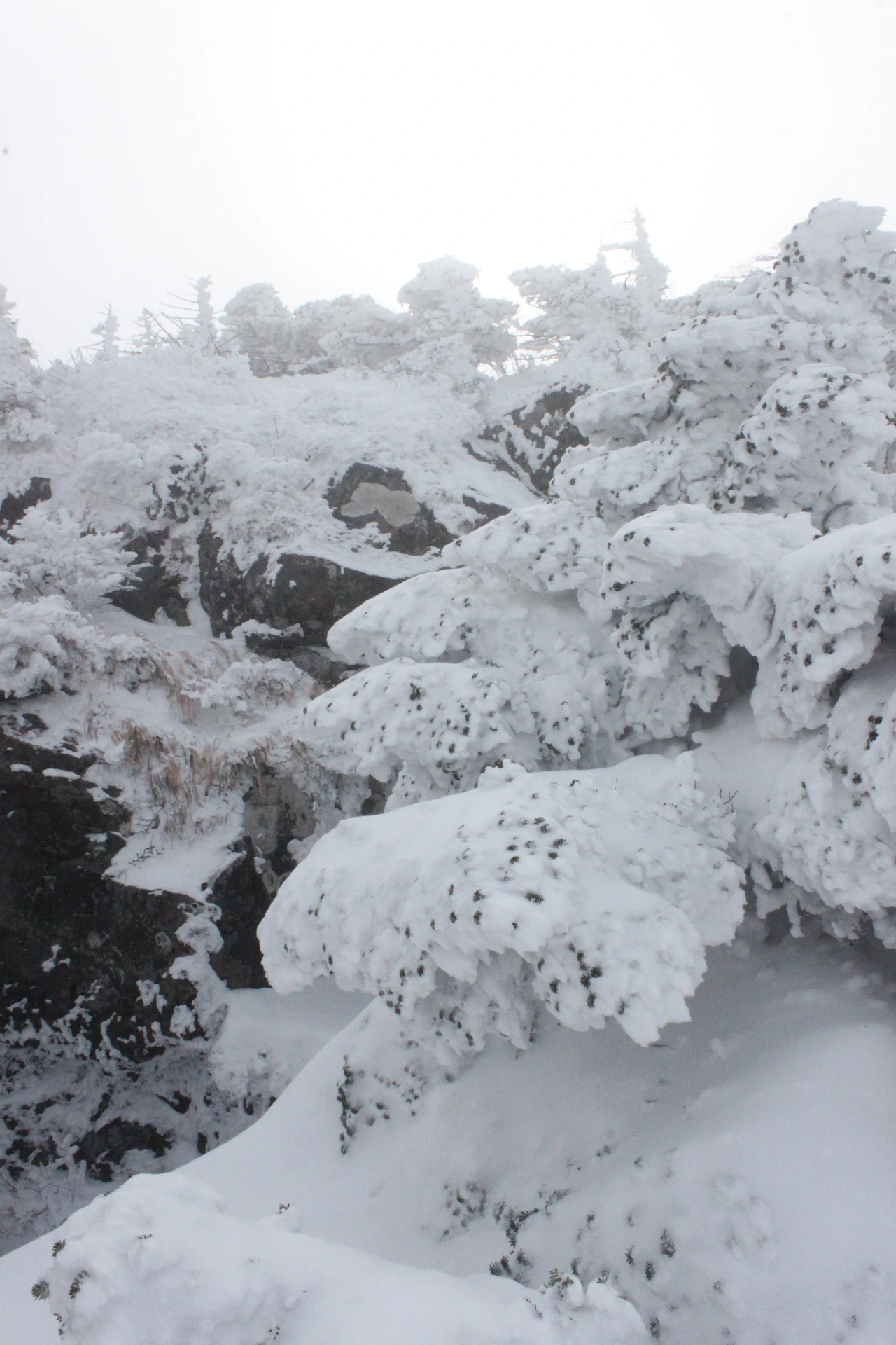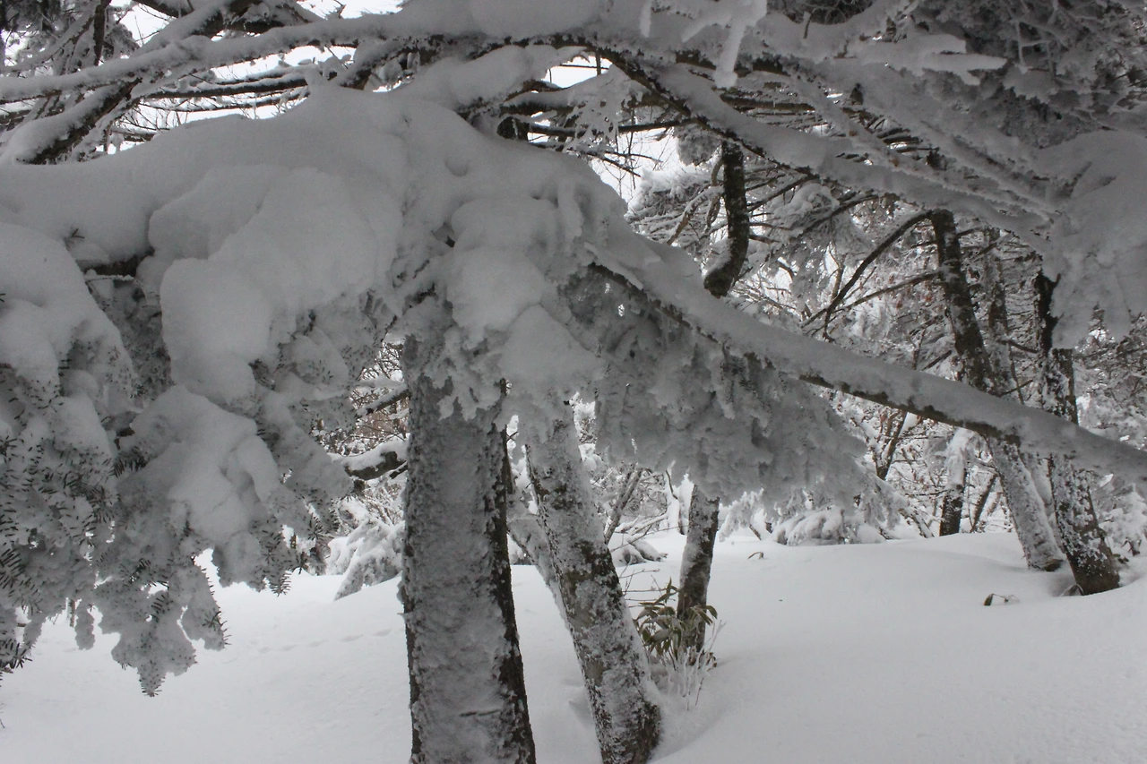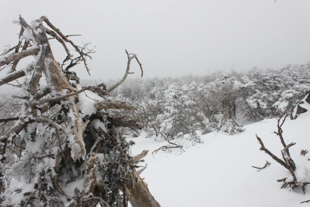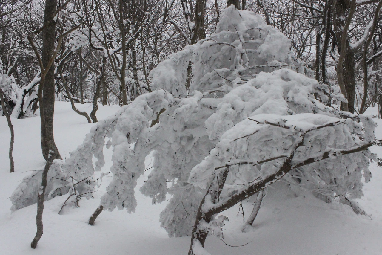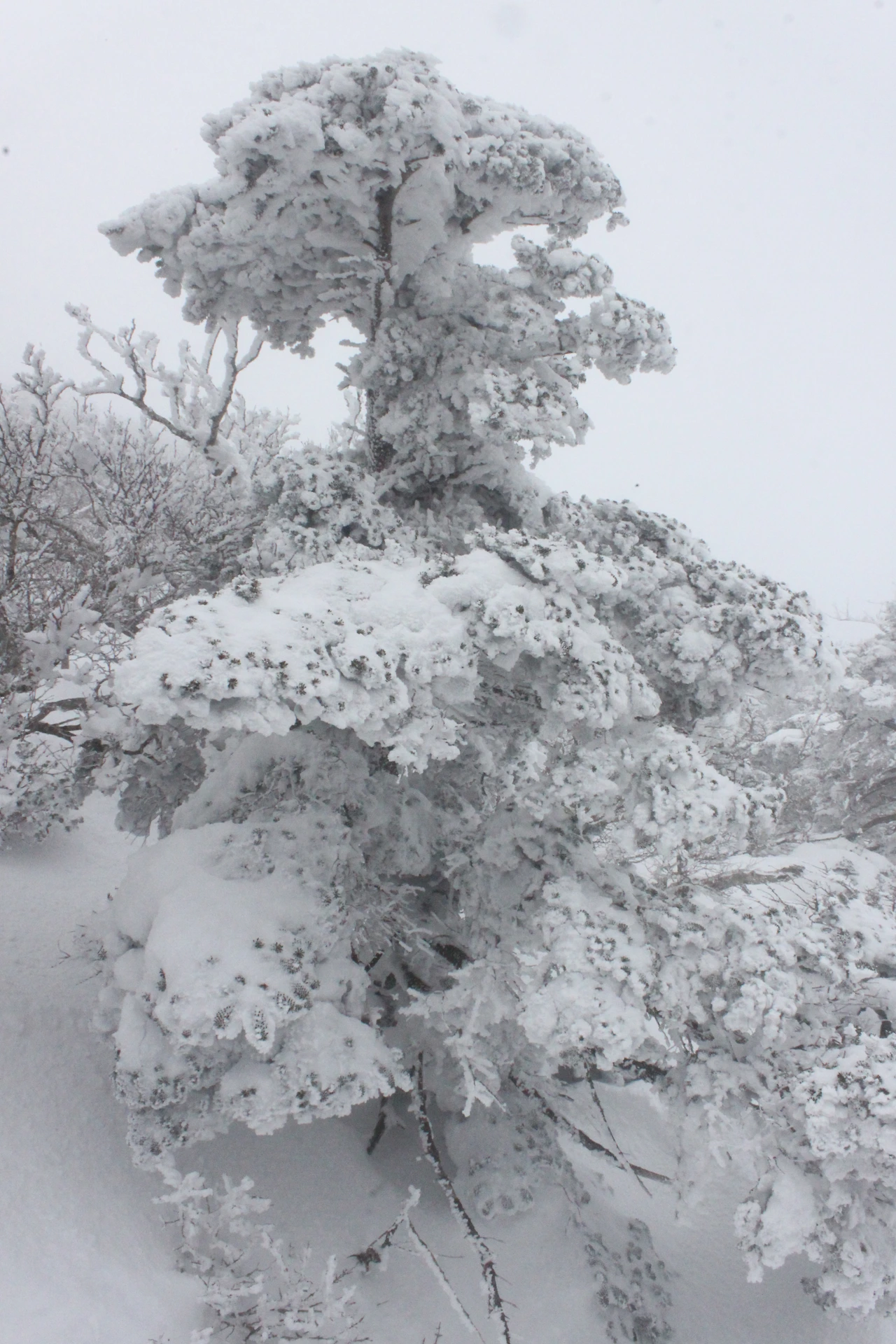 대피소를 통과해 경사가 점점 심해지는 길을 올라가다 보니 나무에 눈꽃이 마치 뼈대를 이룬 집처럼 그 하얀 속 뼈대들은 보여주어 마치 은은하고 찬란한 후광처럼 빛을 발한다.
