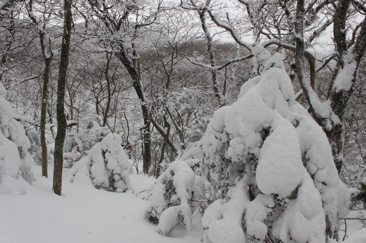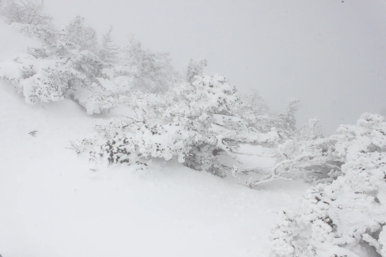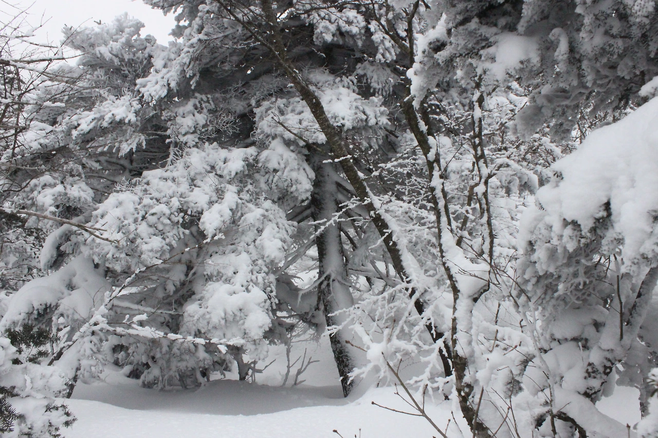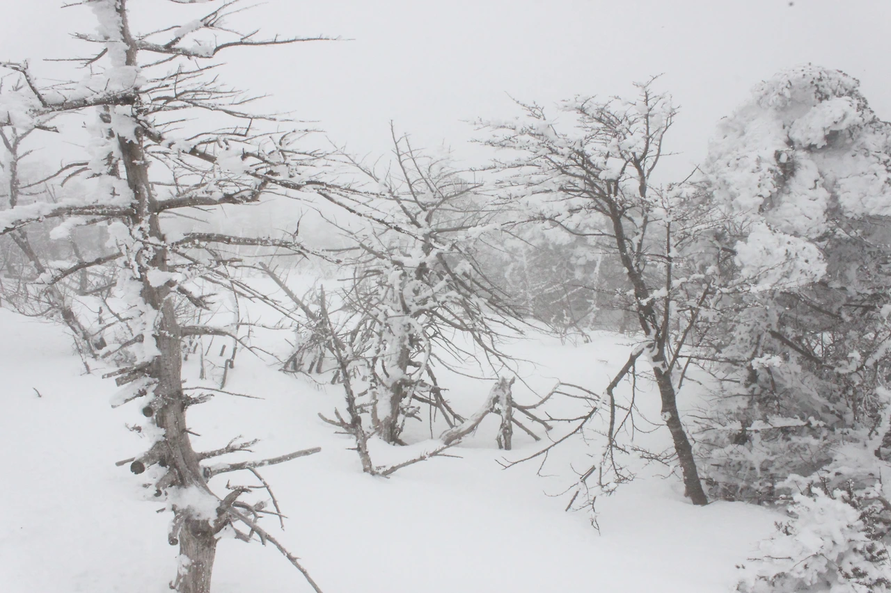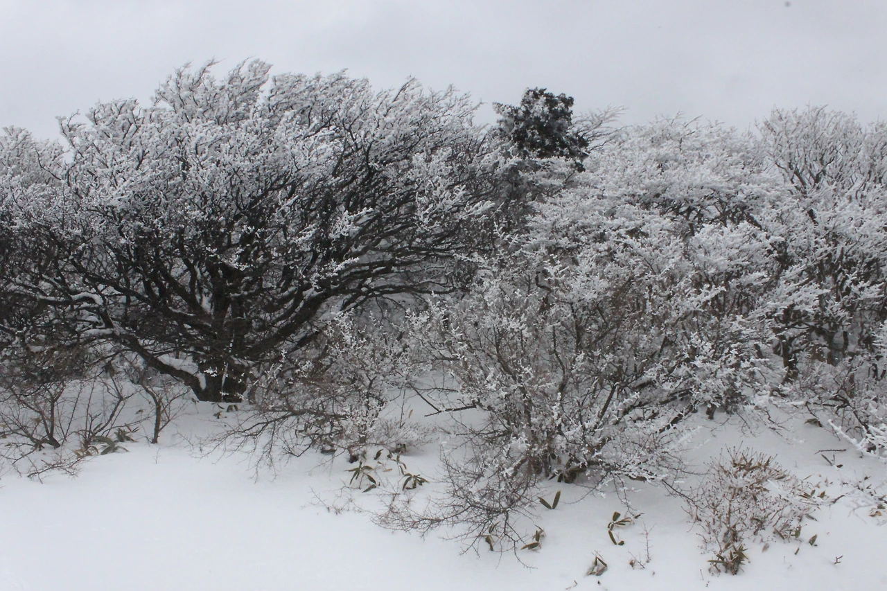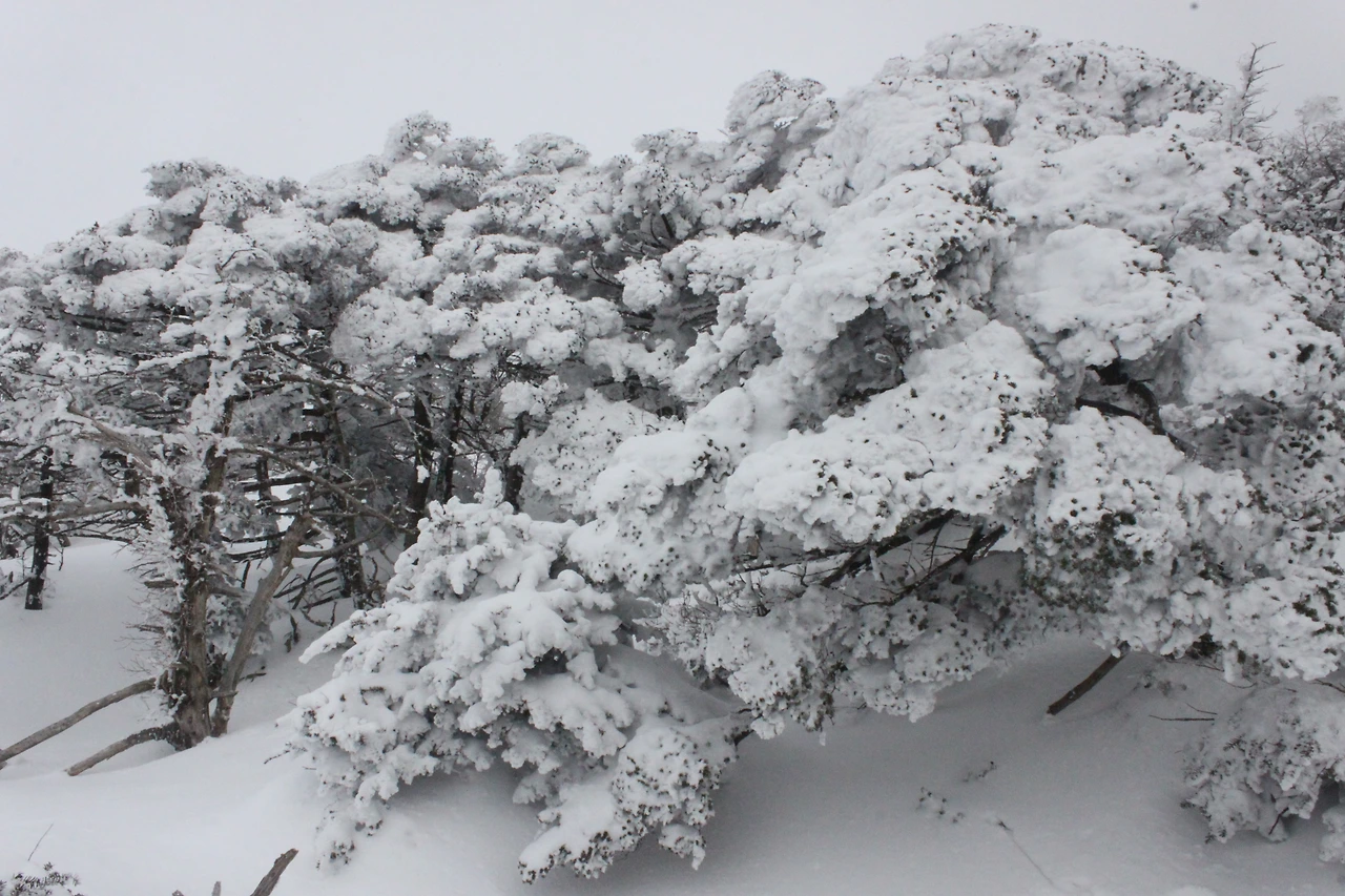 대피소를 통과해 경사가 점점 심해지는 길을 올라가다 보니 나무에 눈꽃이 마치 뼈대를 이룬 집처럼 그 하얀 속 뼈대들은 보여주어 마치 은은하고 찬란한 후광처럼 빛을 발한다.