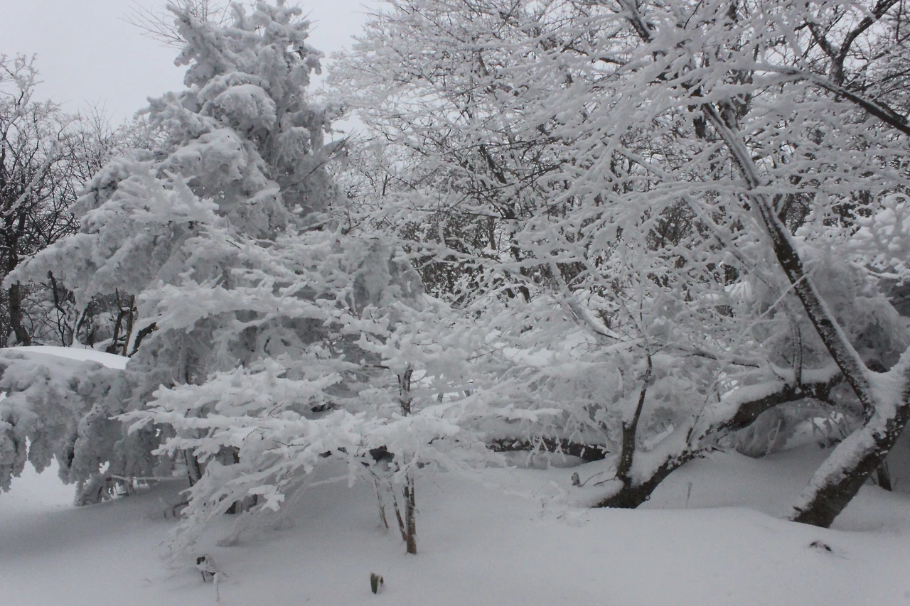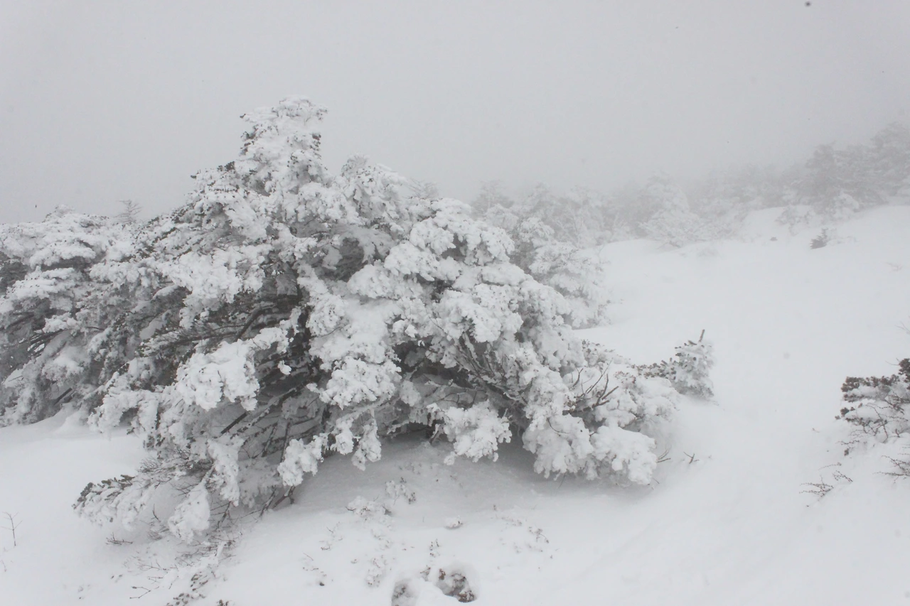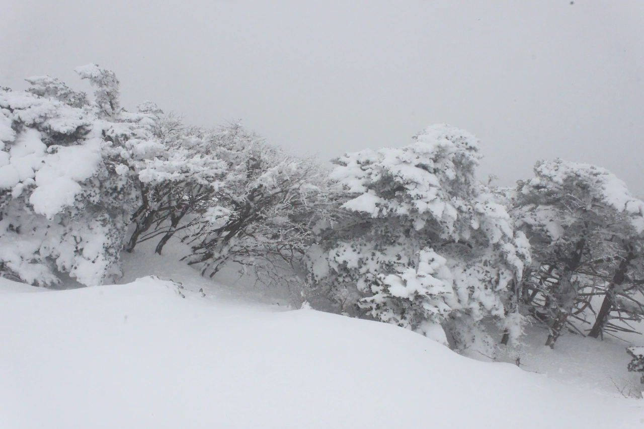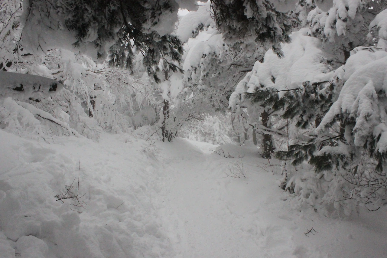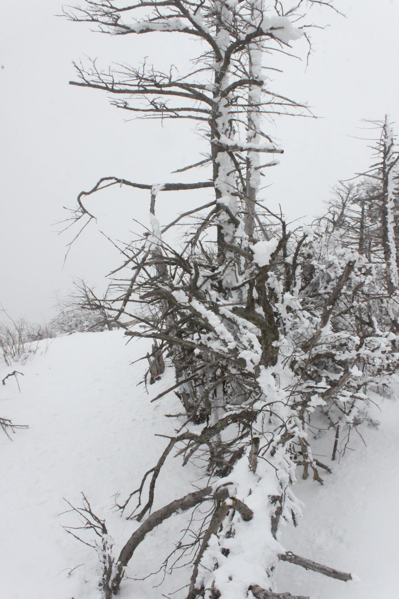 대피소를 통과해 경사가 점점 심해지는 길을 올라가다 보니 나무에 눈꽃이 마치 뼈대를 이룬 집처럼 그 하얀 속 뼈대들은 보여주어 마치 은은하고 찬란한 후광처럼 빛을 발한다.