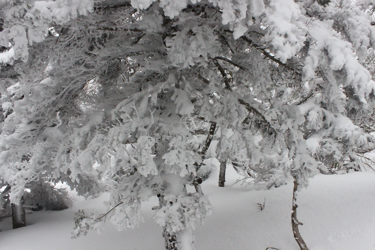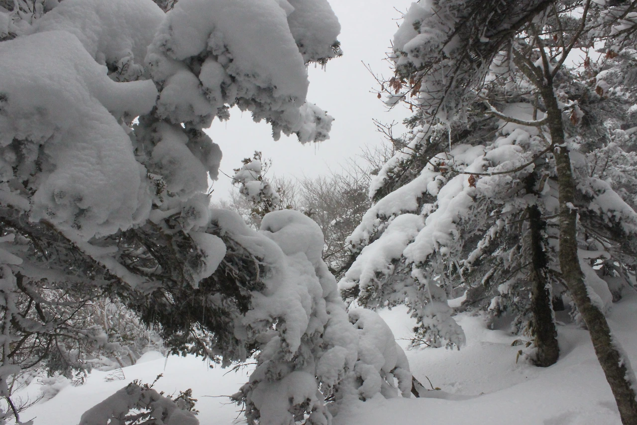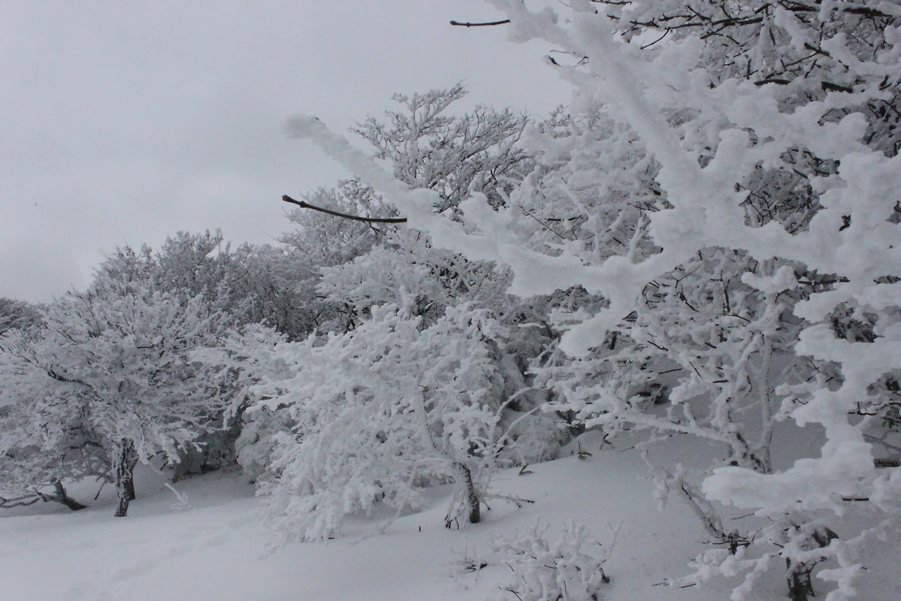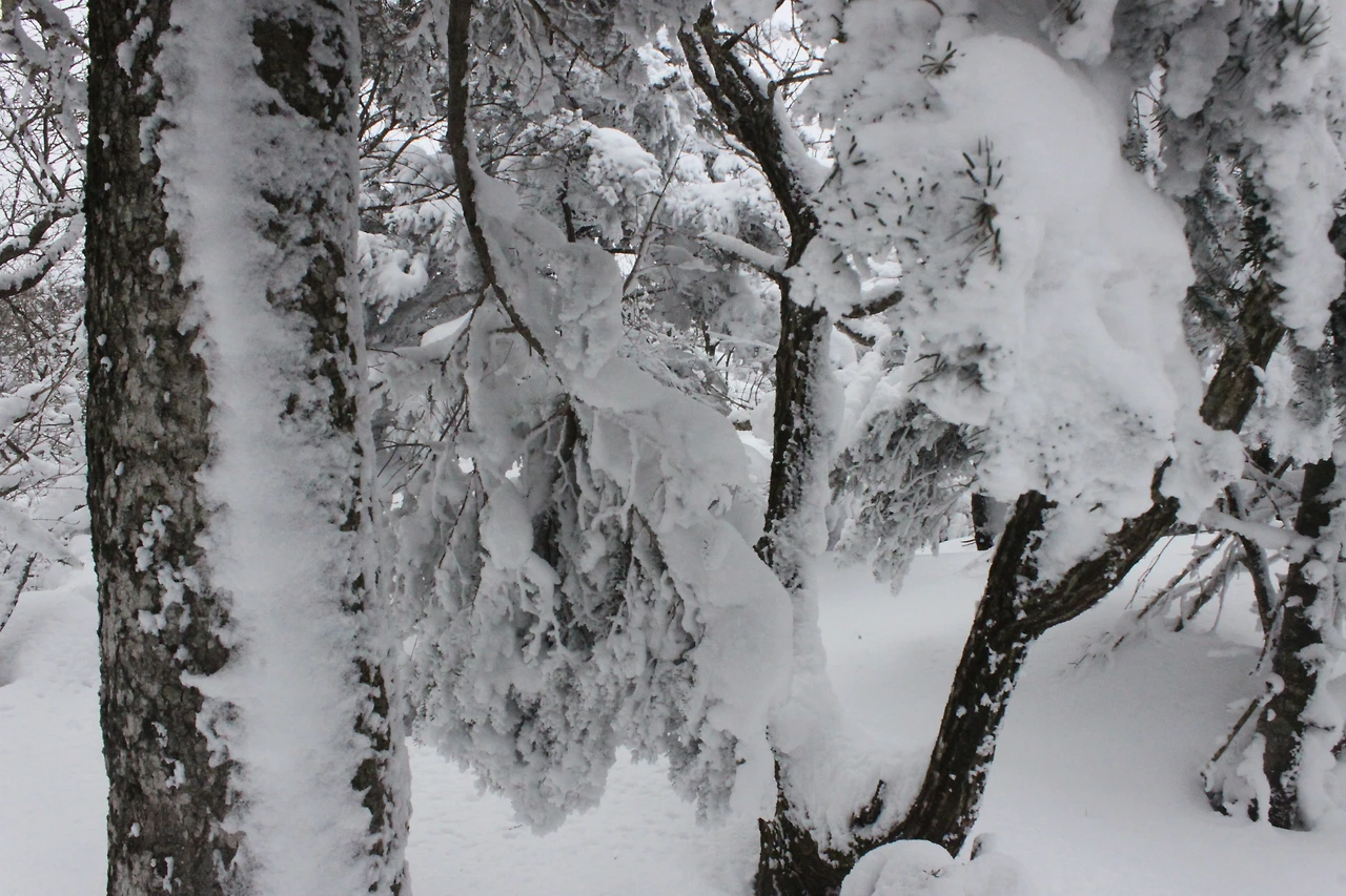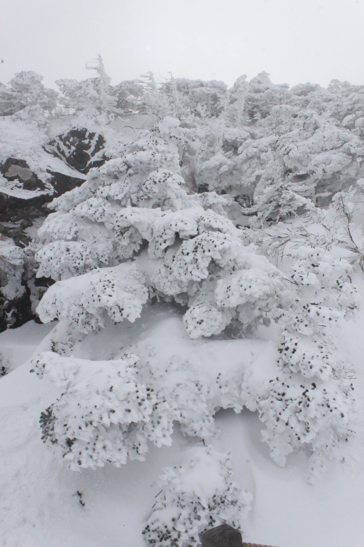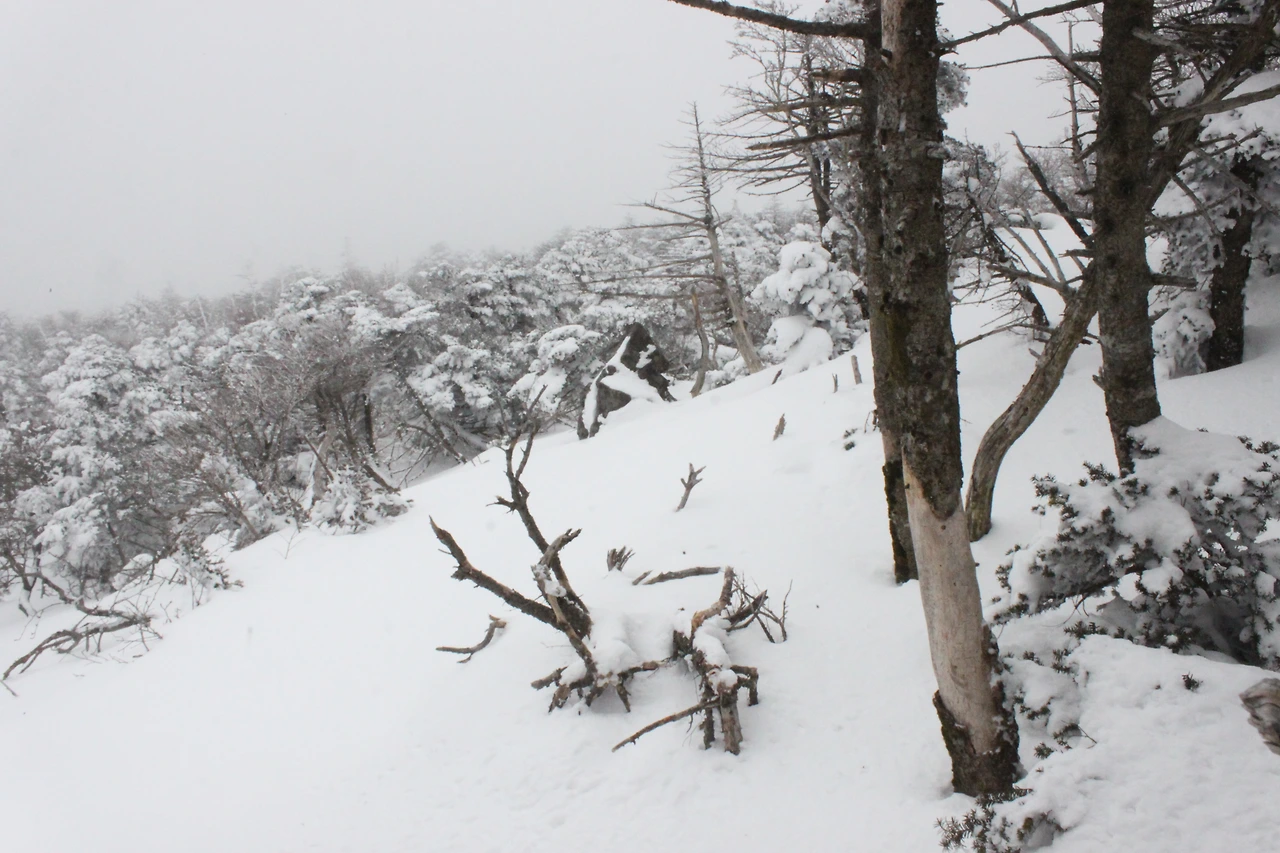 대피소를 통과해 경사가 점점 심해지는 길을 올라가다 보니 나무에 눈꽃이 마치 뼈대를 이룬 집처럼 그 하얀 속 뼈대들은 보여주어 마치 은은하고 찬란한 후광처럼 빛을 발한다.