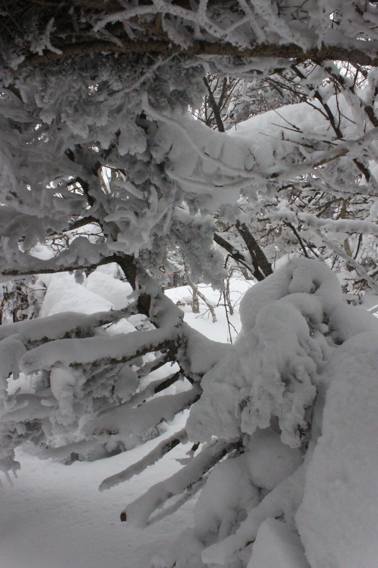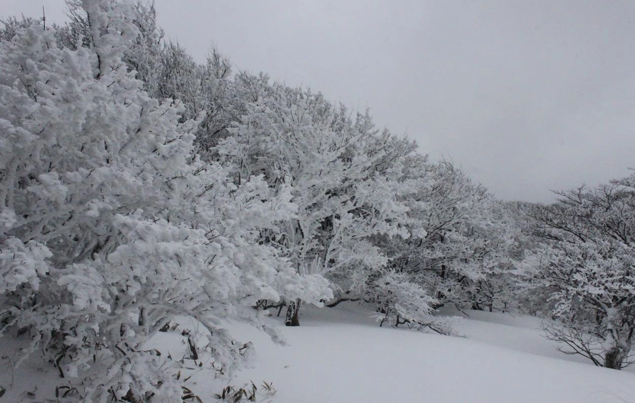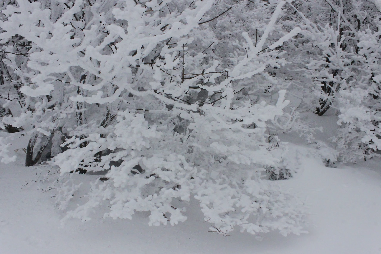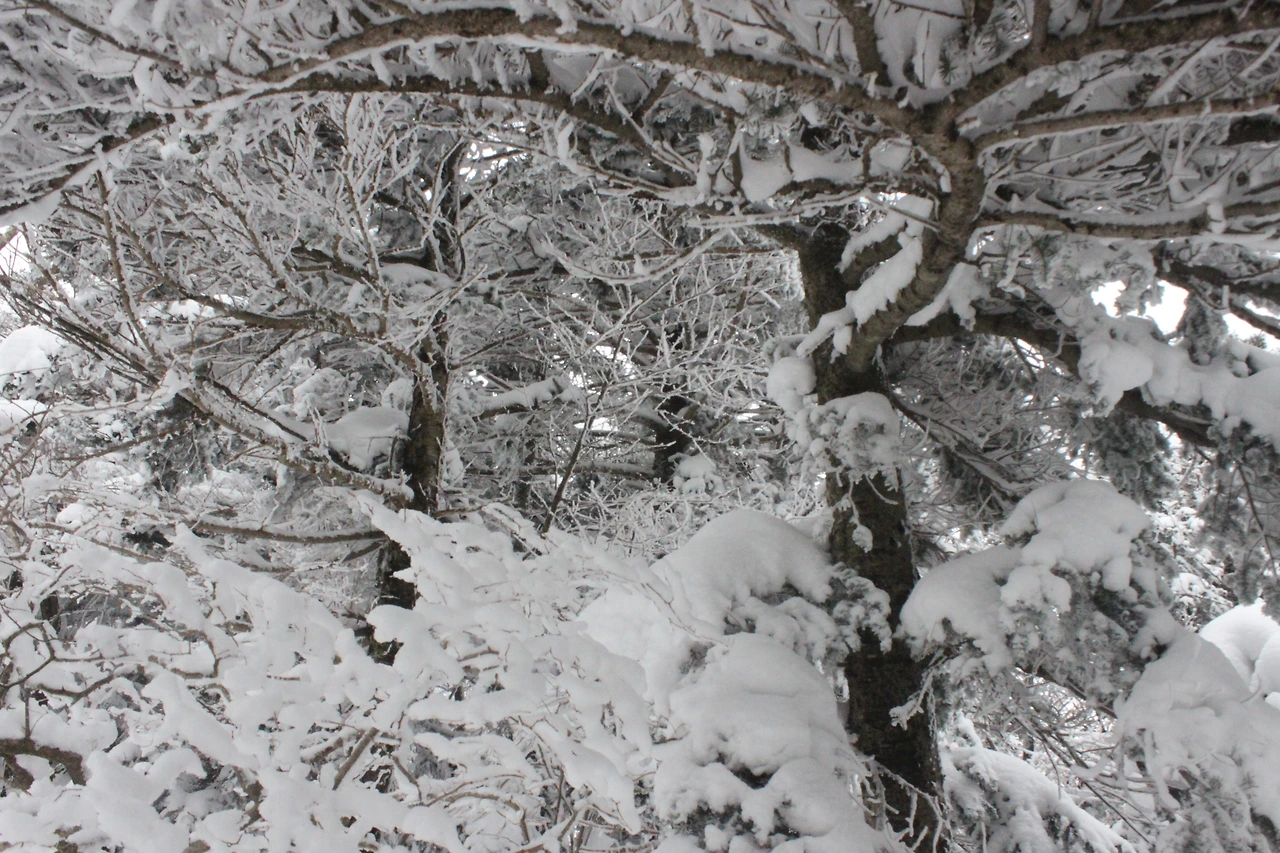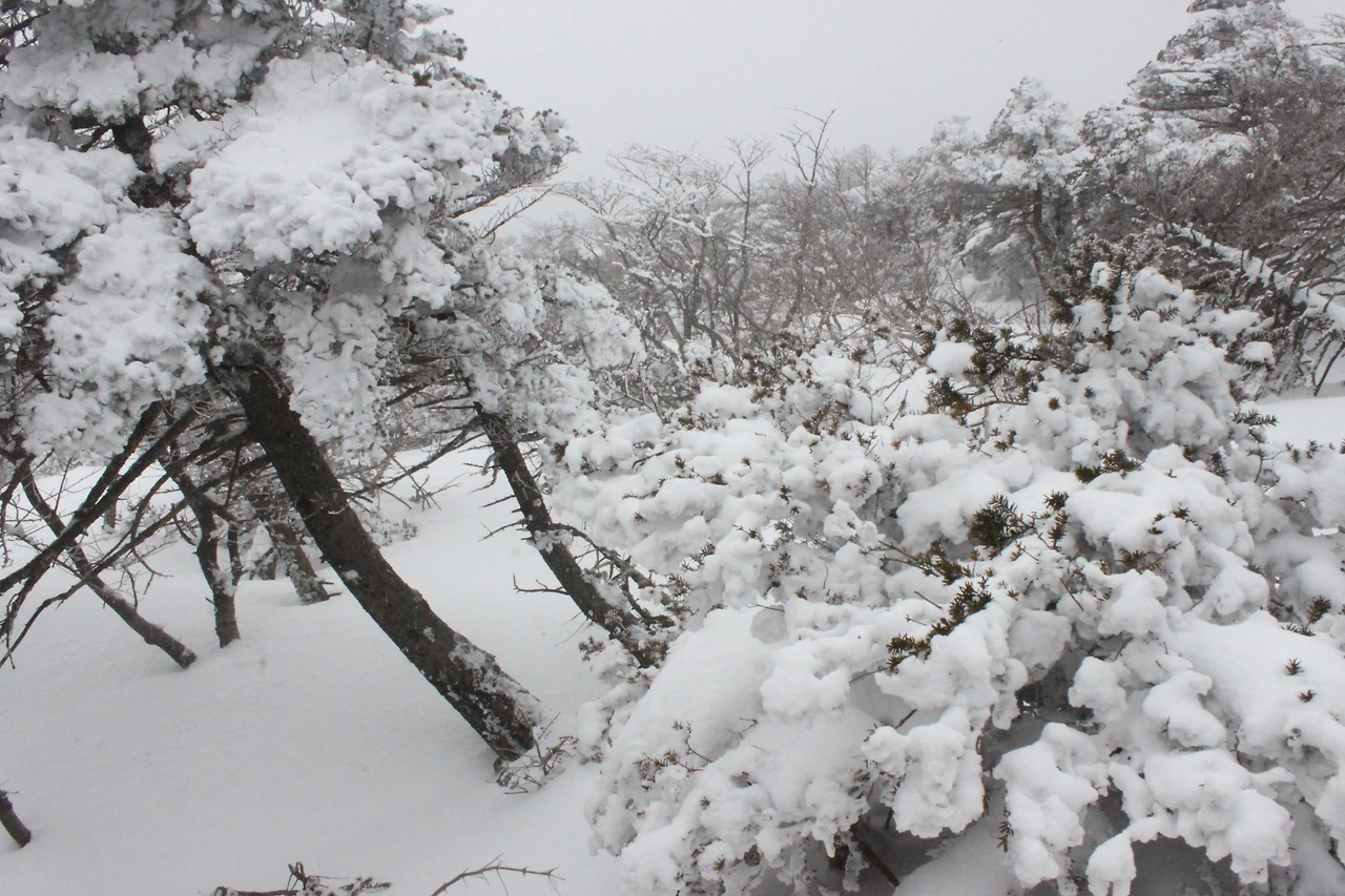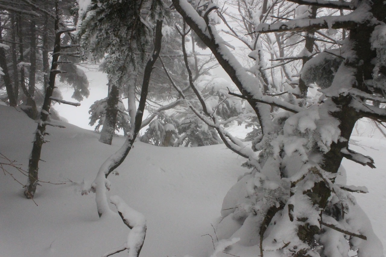 대피소를 통과해 경사가 점점 심해지는 길을 올라가다 보니 나무에 눈꽃이 마치 뼈대를 이룬 집처럼 그 하얀 속 뼈대들은 보여주어 마치 은은하고 찬란한 후광처럼 빛을 발한다.