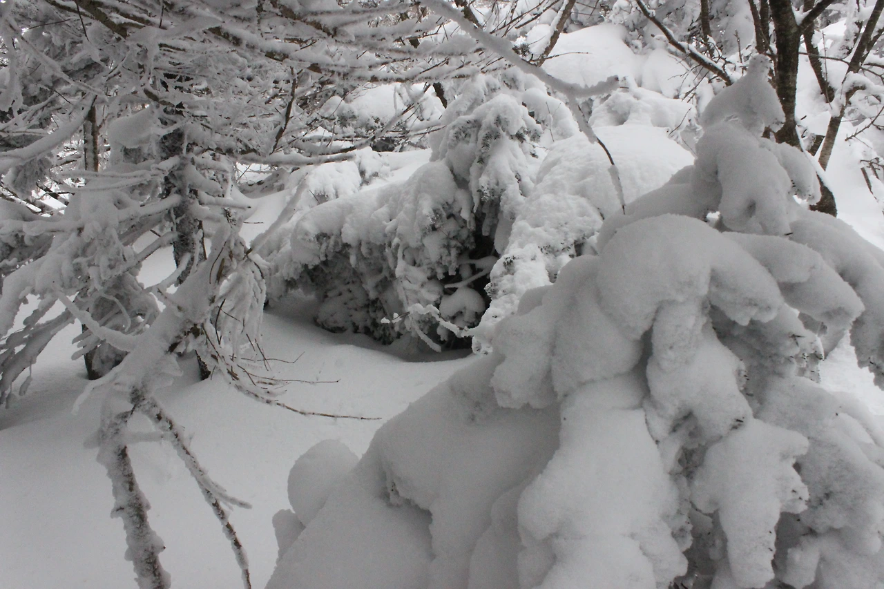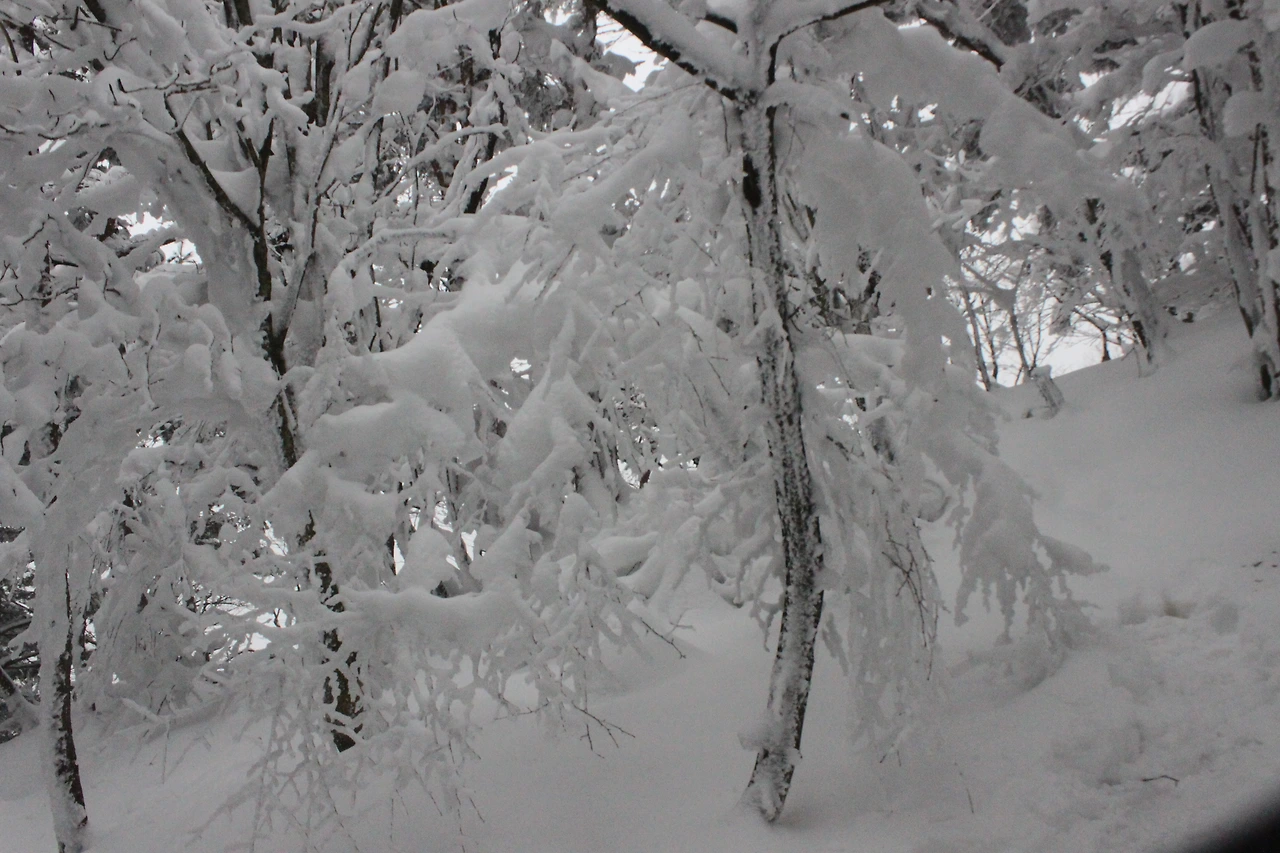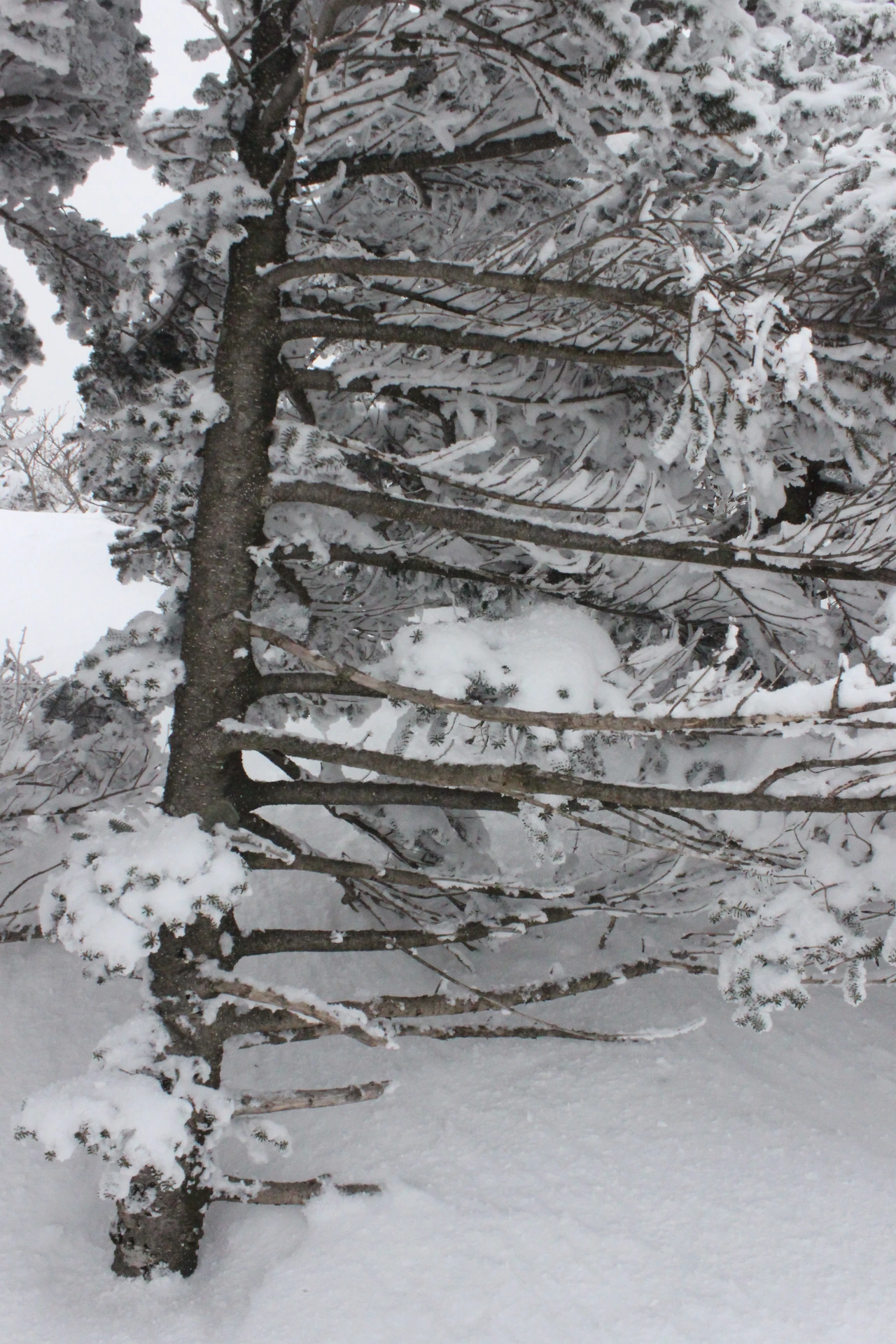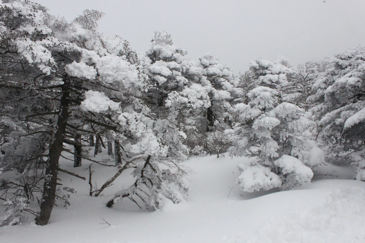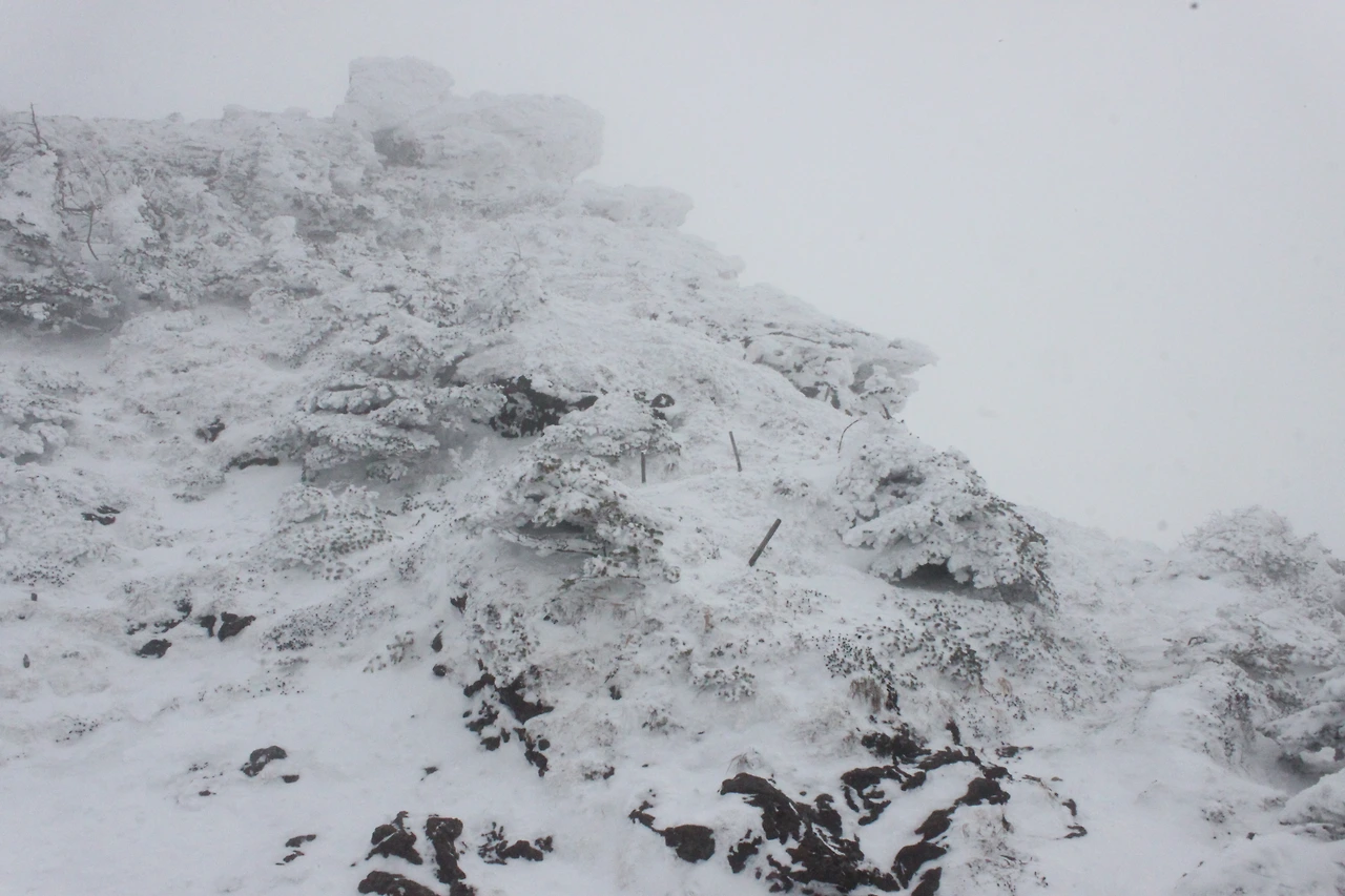 대피소를 통과해 경사가 점점 심해지는 길을 올라가다 보니 나무에 눈꽃이 마치 뼈대를 이룬 집처럼 그 하얀 속 뼈대들은 보여주어 마치 은은하고 찬란한 후광처럼 빛을 발한다.