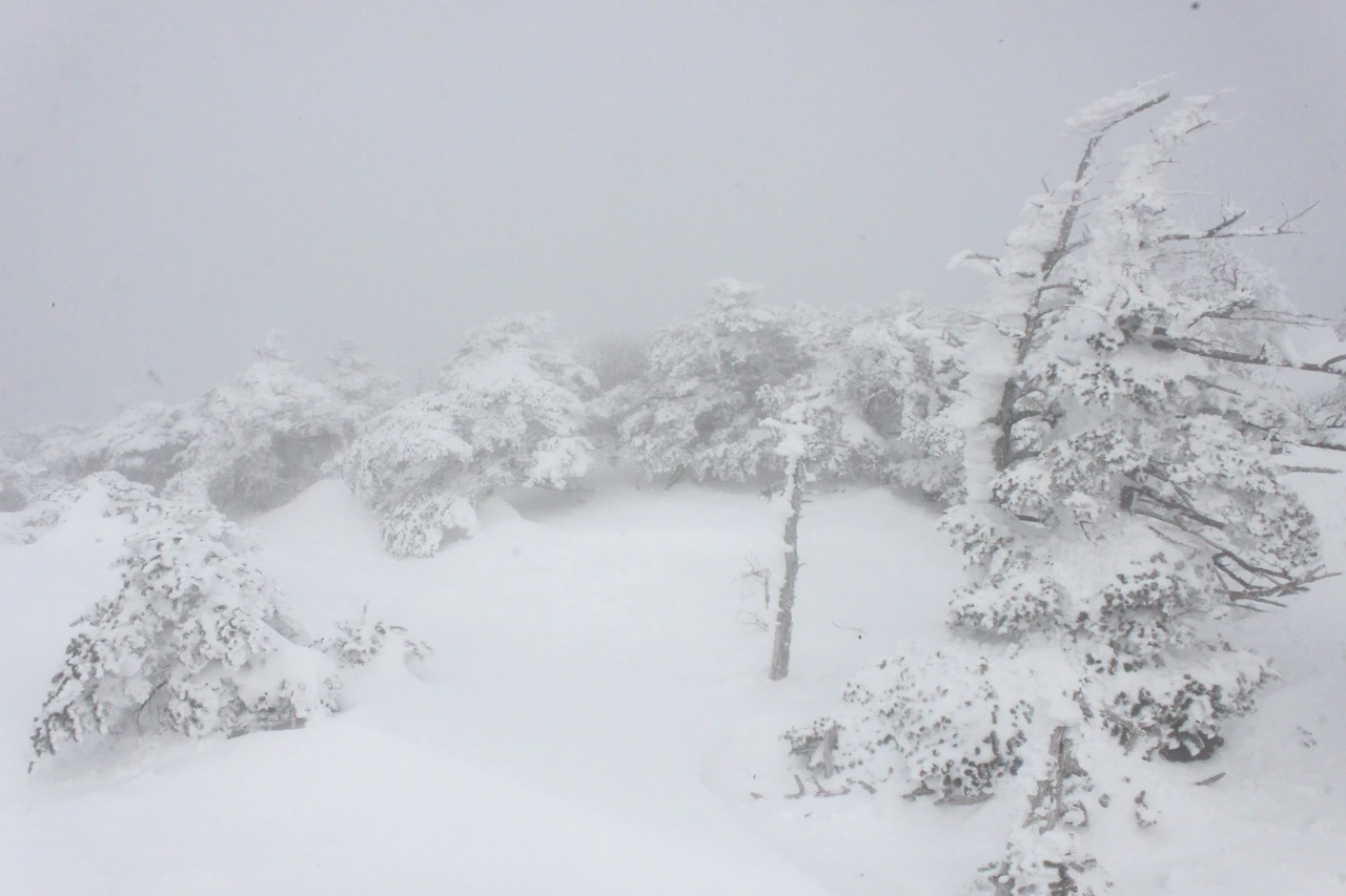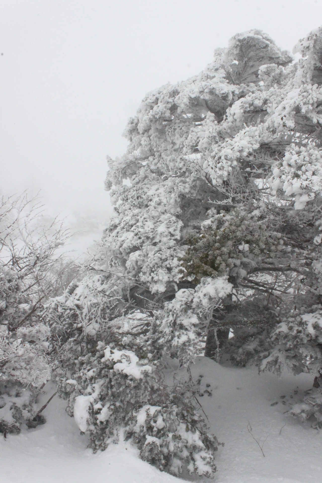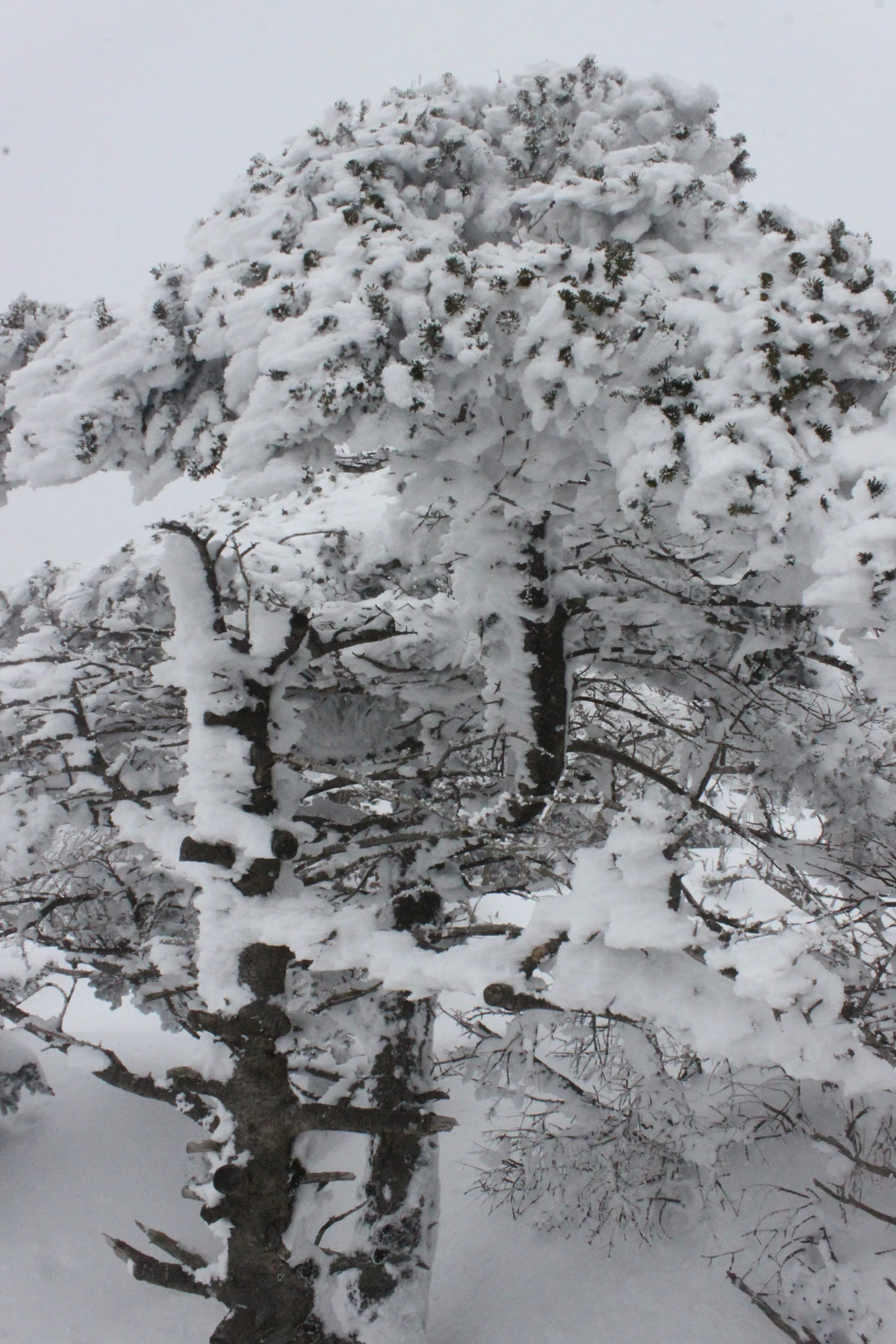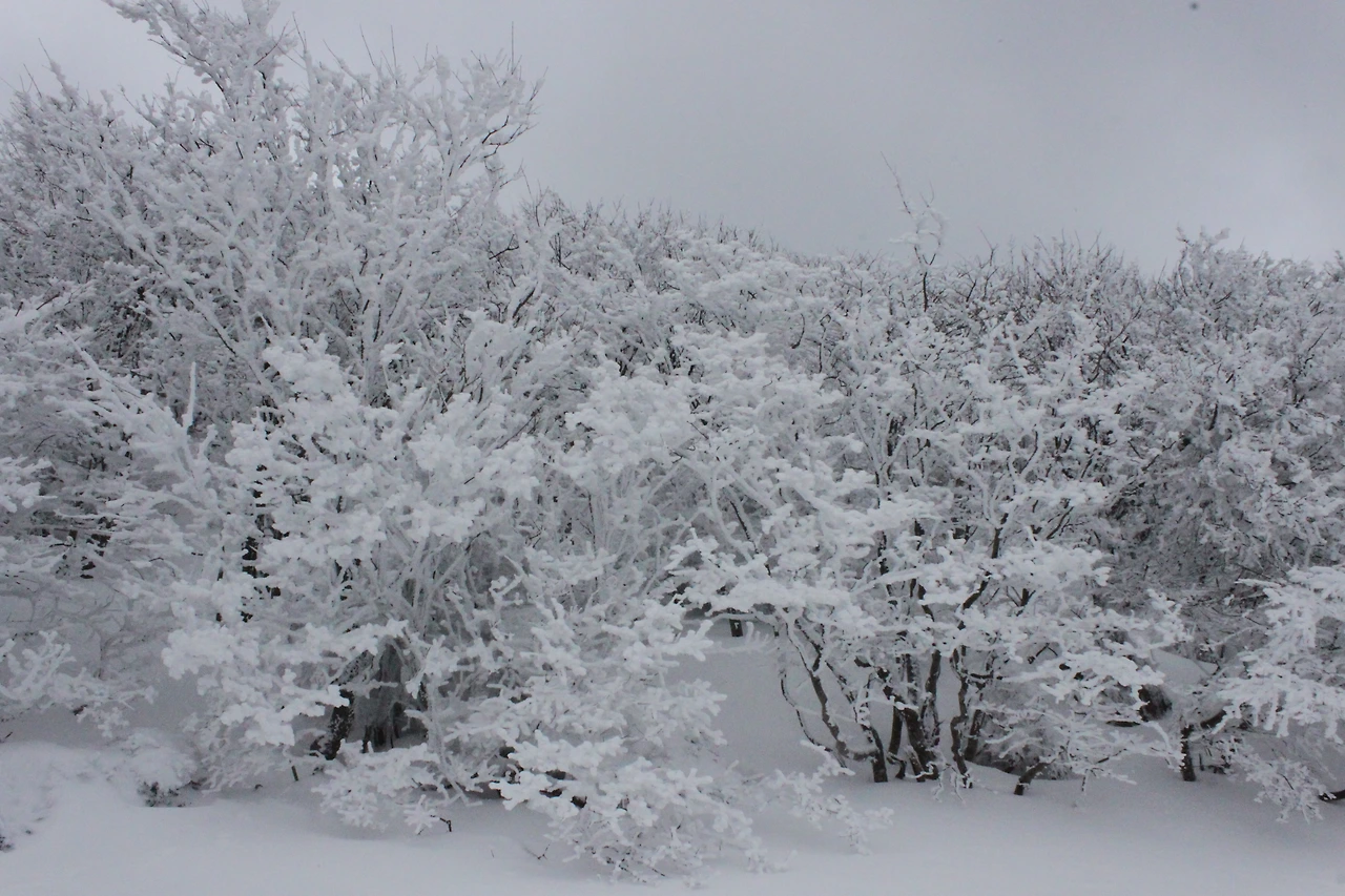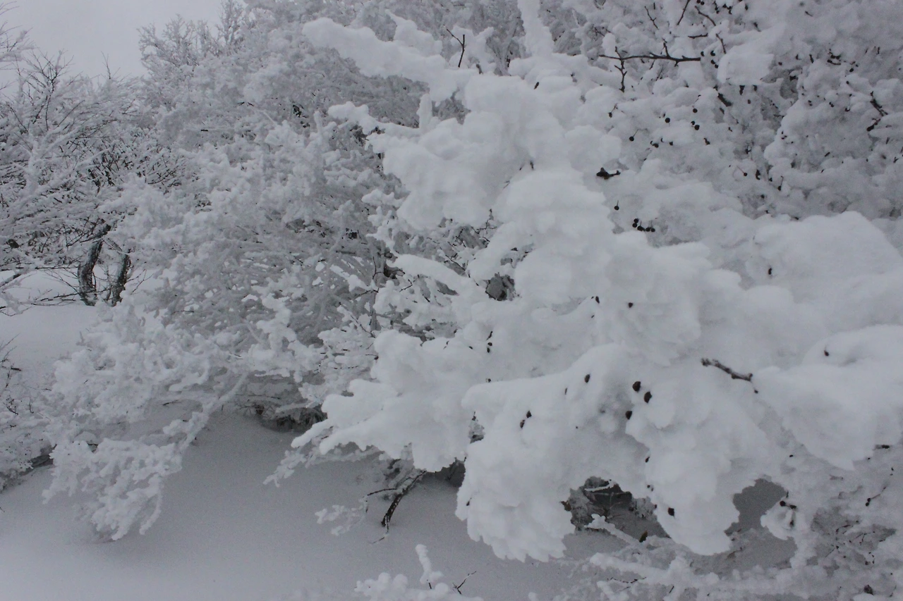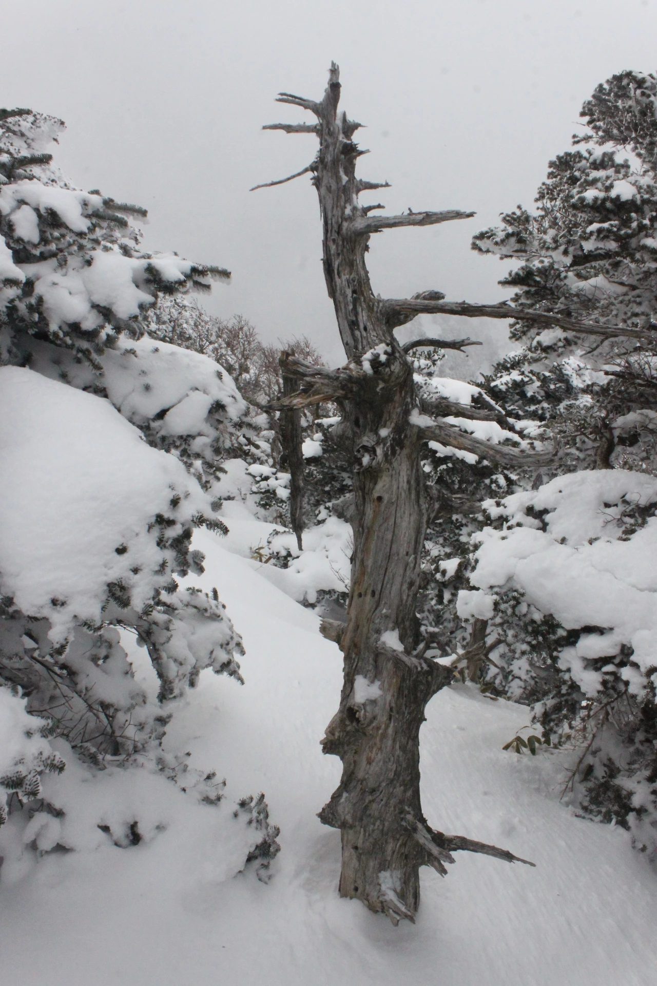 대피소를 통과해 경사가 점점 심해지는 길을 올라가다 보니 나무에 눈꽃이 마치 뼈대를 이룬 집처럼 그 하얀 속 뼈대들은 보여주어 마치 은은하고 찬란한 후광처럼 빛을 발한다.