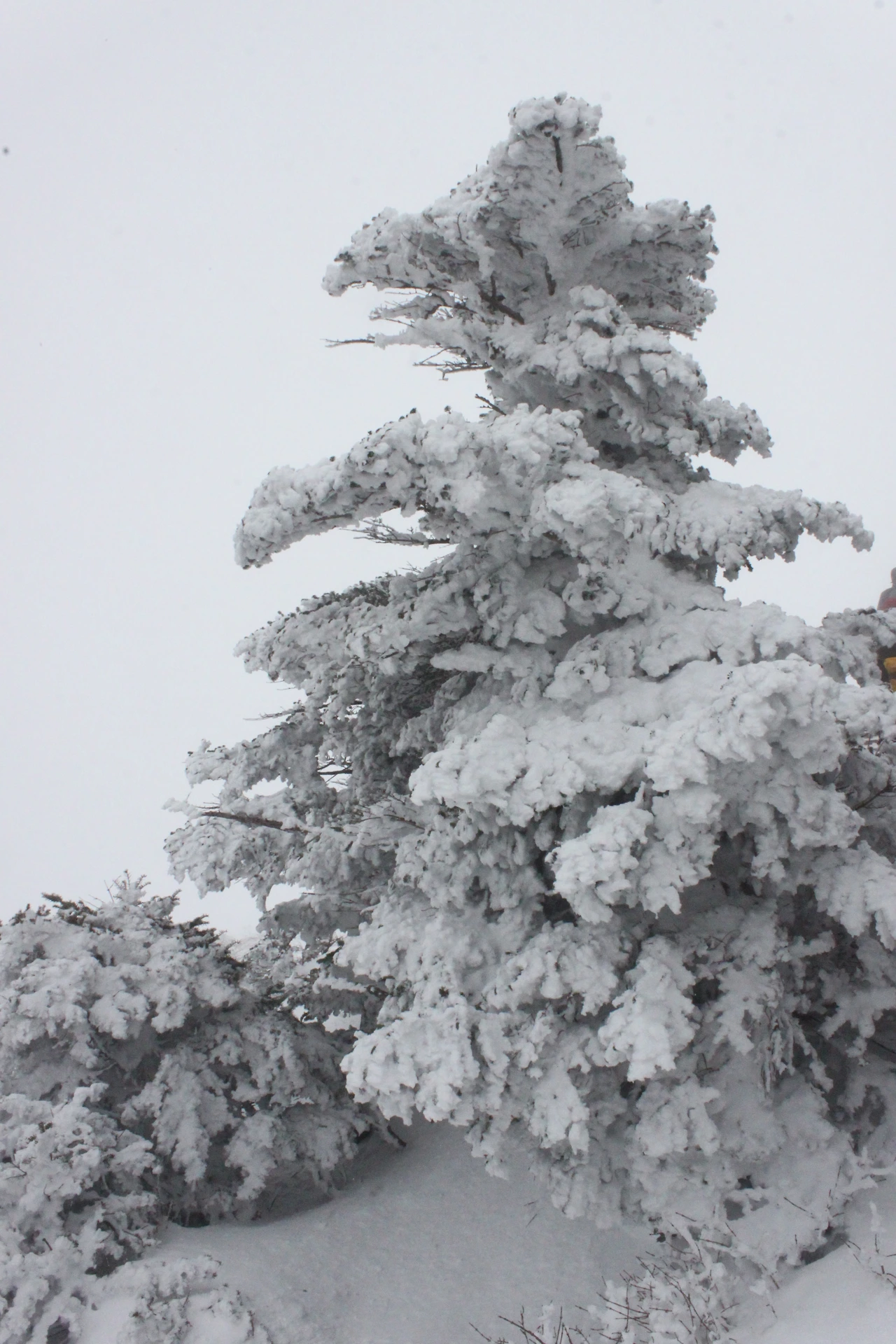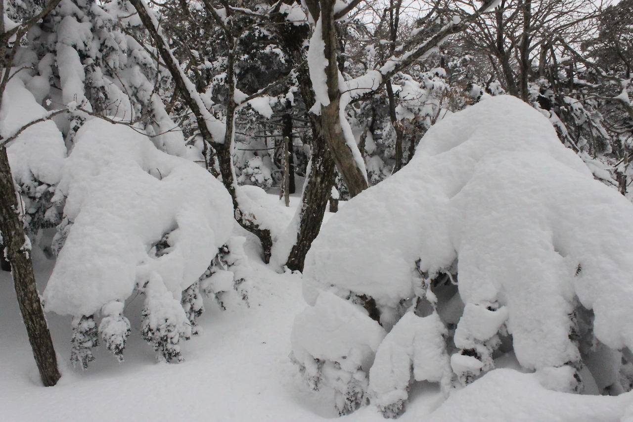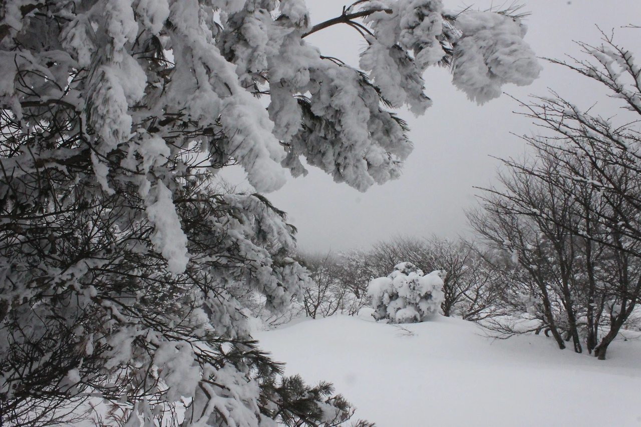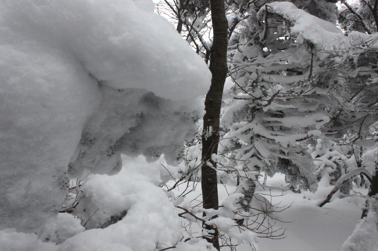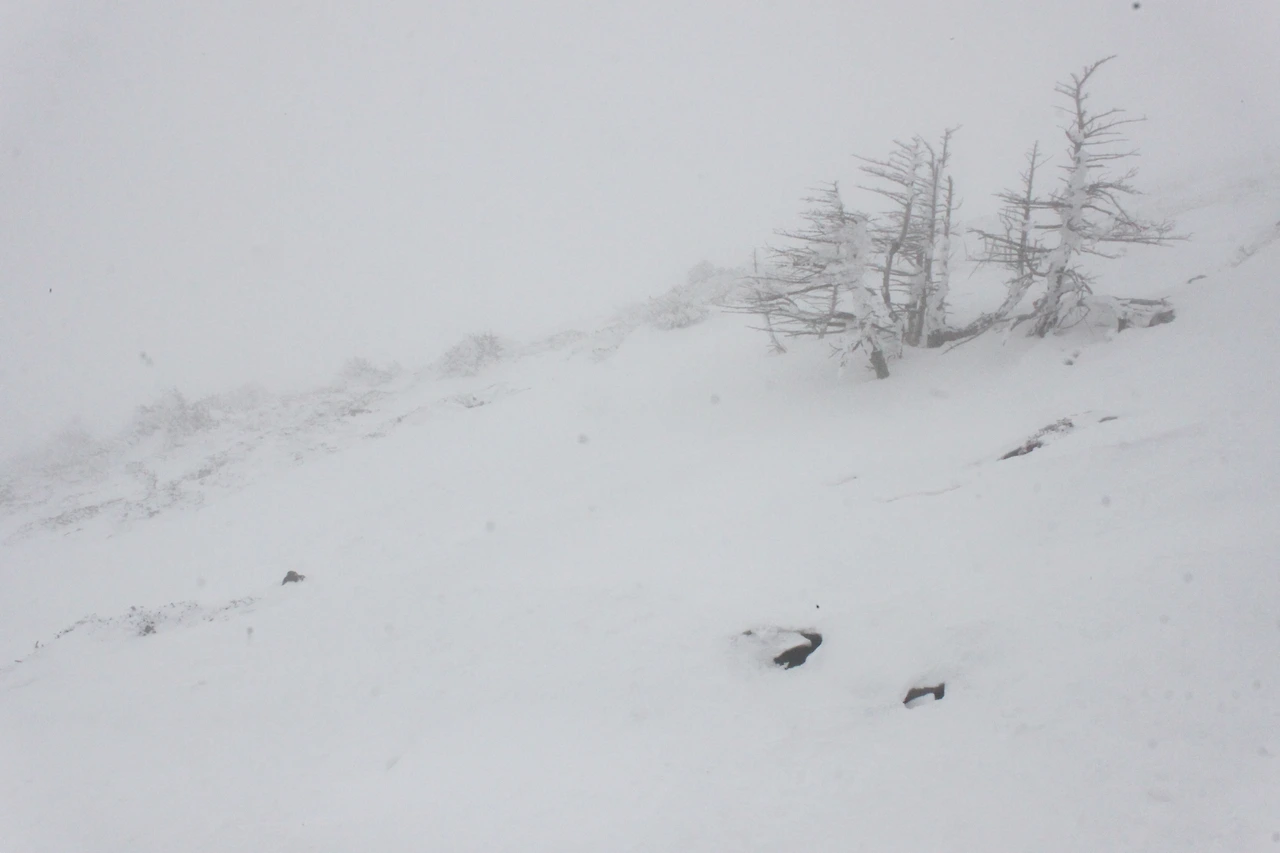 대피소를 통과해 경사가 점점 심해지는 길을 올라가다 보니 나무에 눈꽃이 마치 뼈대를 이룬 집처럼 그 하얀 속 뼈대들은 보여주어 마치 은은하고 찬란한 후광처럼 빛을 발한다.
