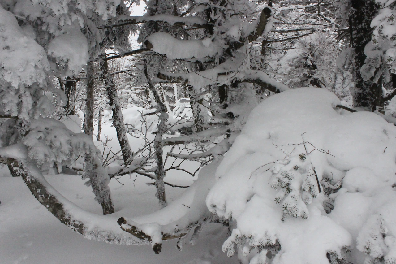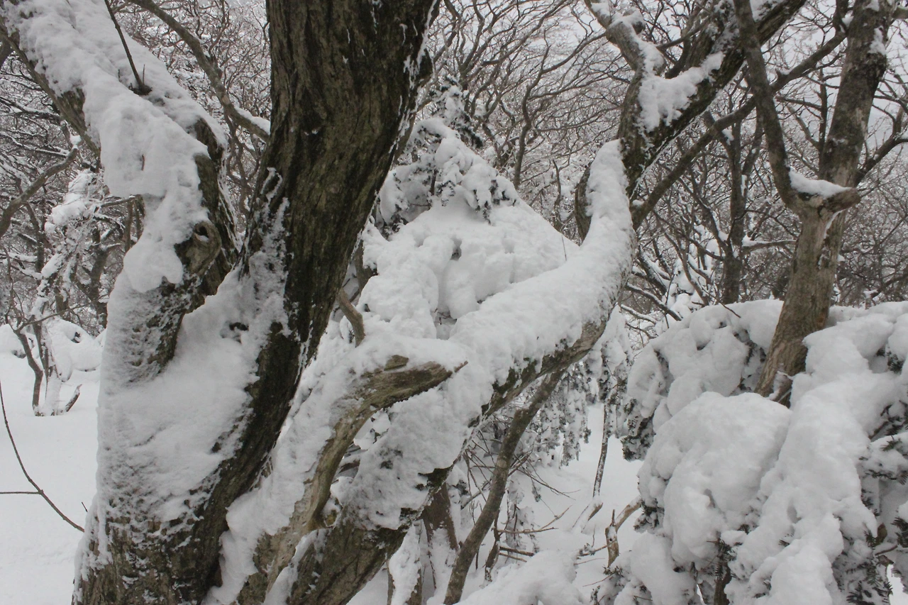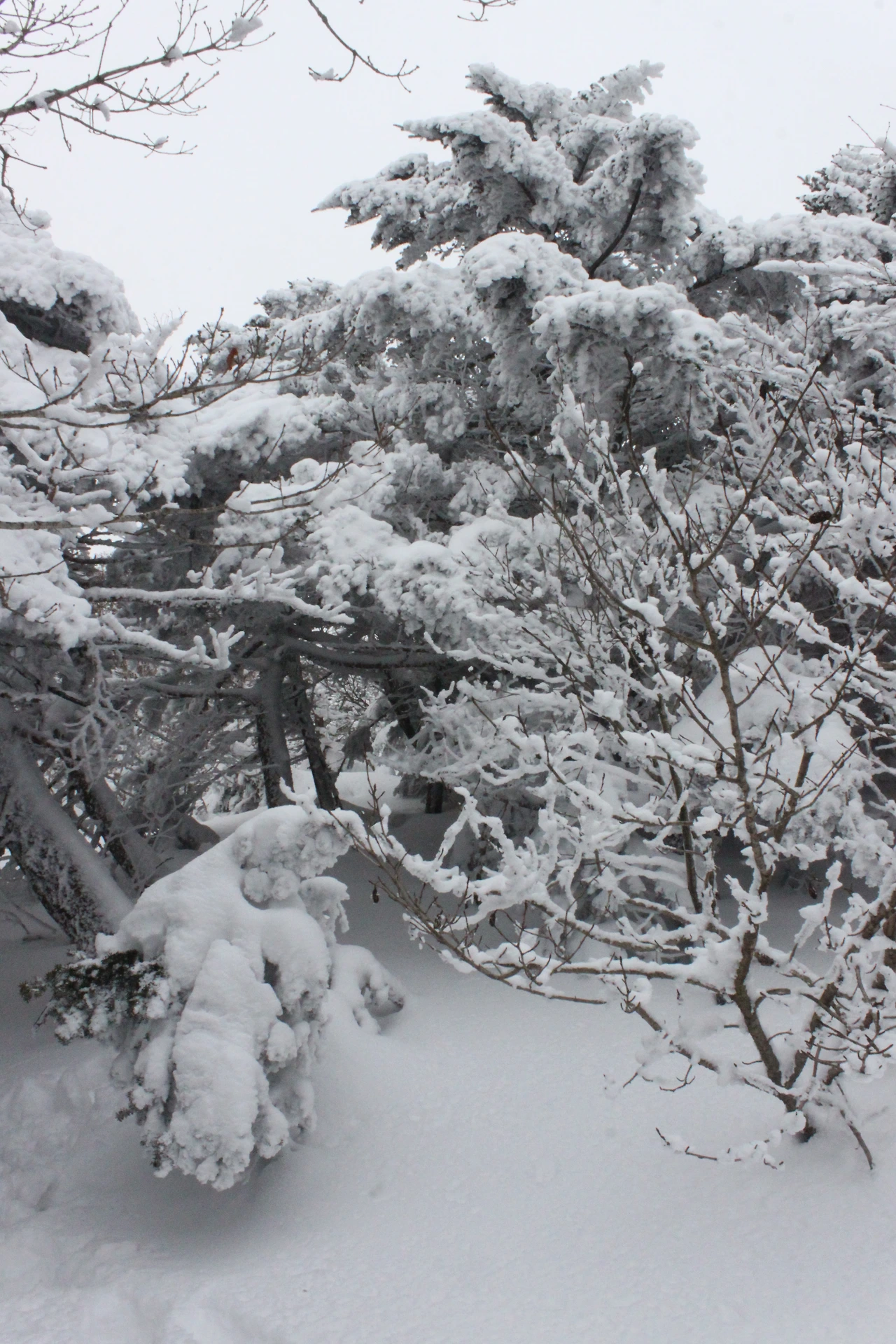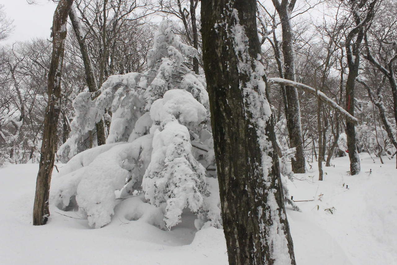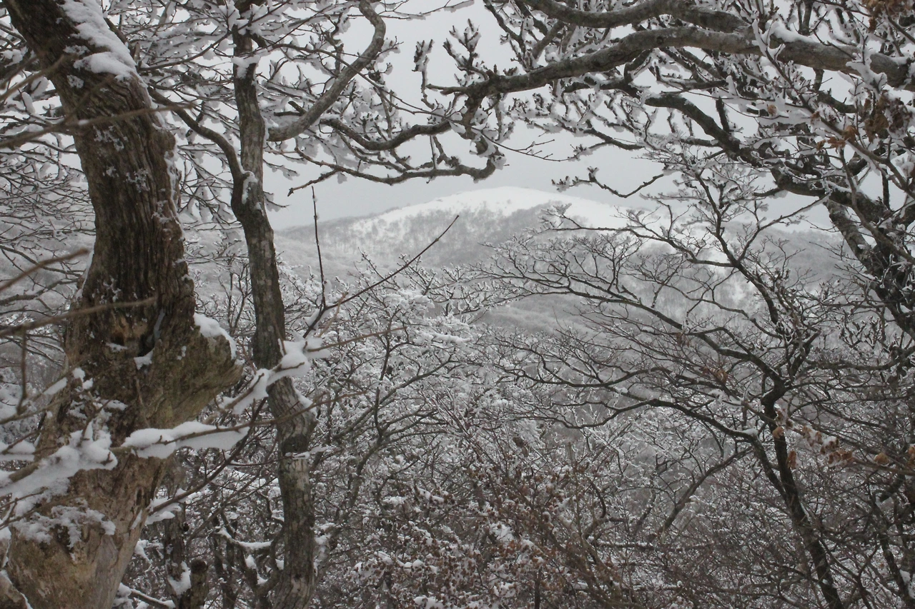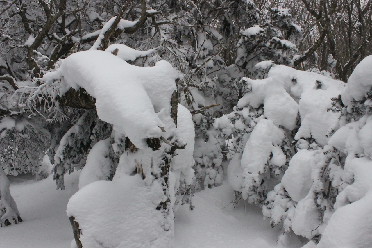 대피소를 통과해 경사가 점점 심해지는 길을 올라가다 보니 나무에 눈꽃이 마치 뼈대를 이룬 집처럼 그 하얀 속 뼈대들은 보여주어 마치 은은하고 찬란한 후광처럼 빛을 발한다.