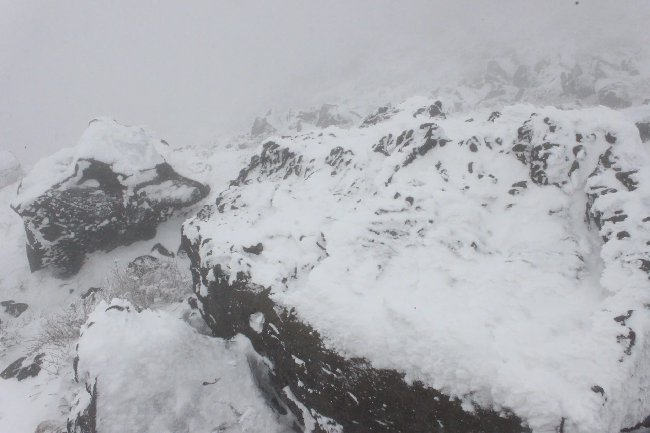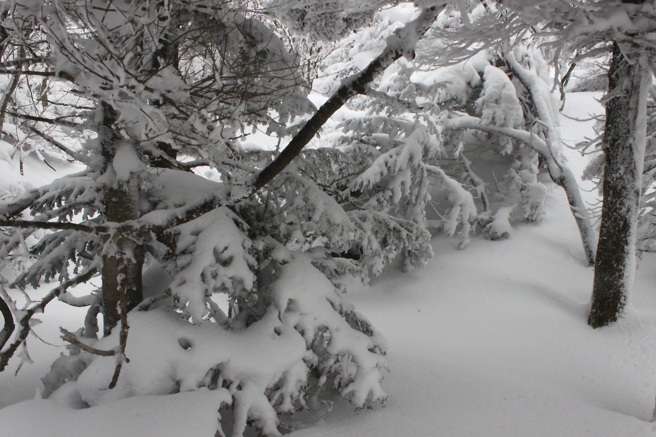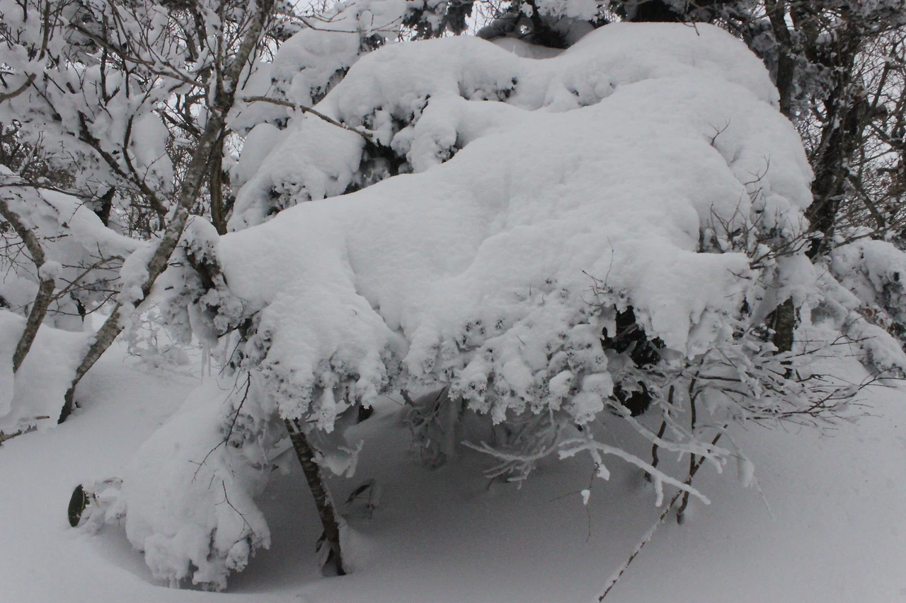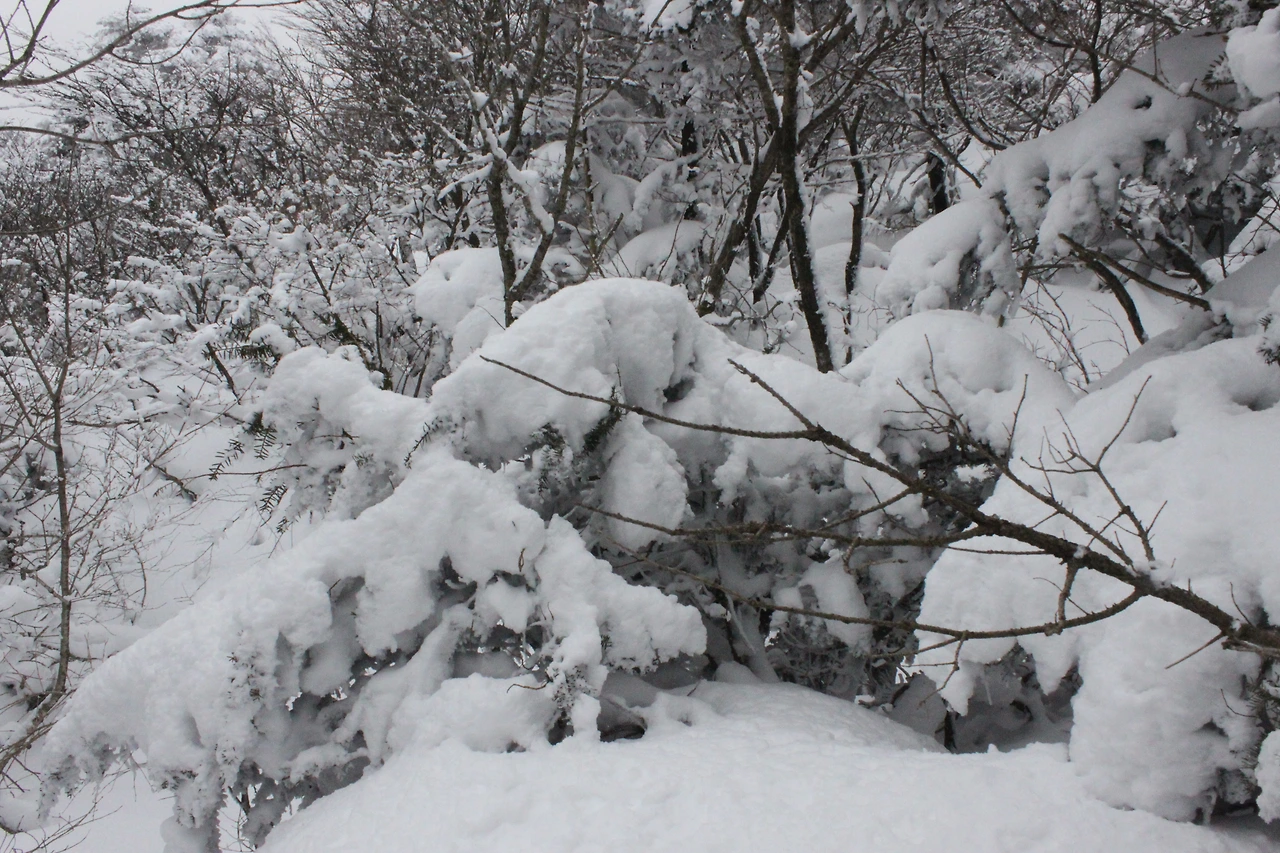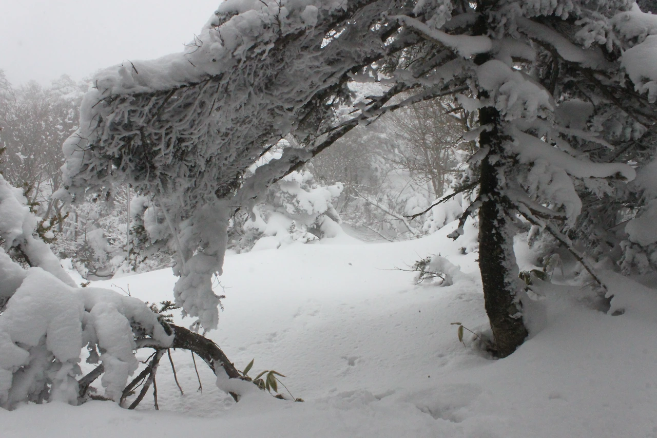 대피소를 통과해 경사가 점점 심해지는 길을 올라가다 보니 나무에 눈꽃이 마치 뼈대를 이룬 집처럼 그 하얀 속 뼈대들은 보여주어 마치 은은하고 찬란한 후광처럼 빛을 발한다.
