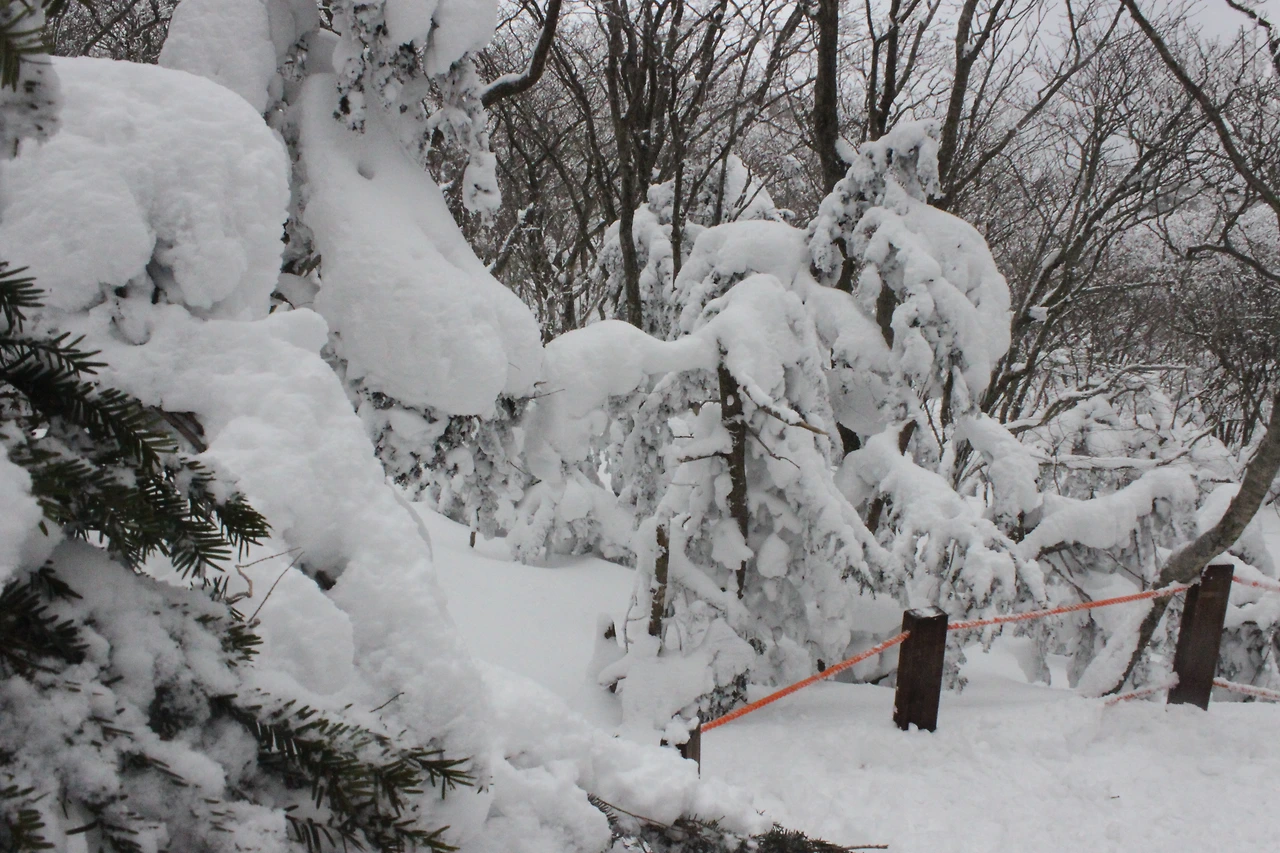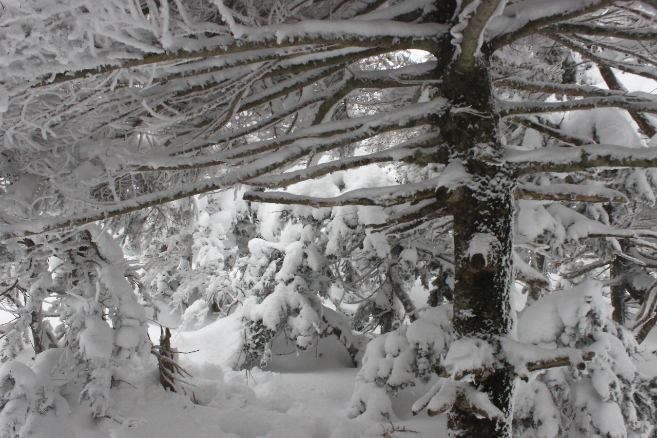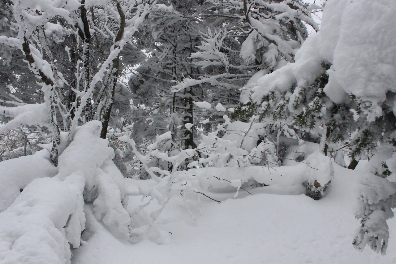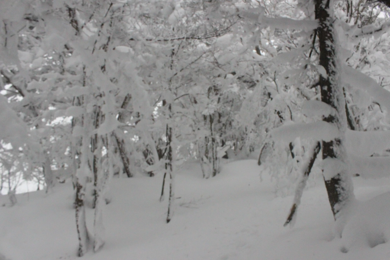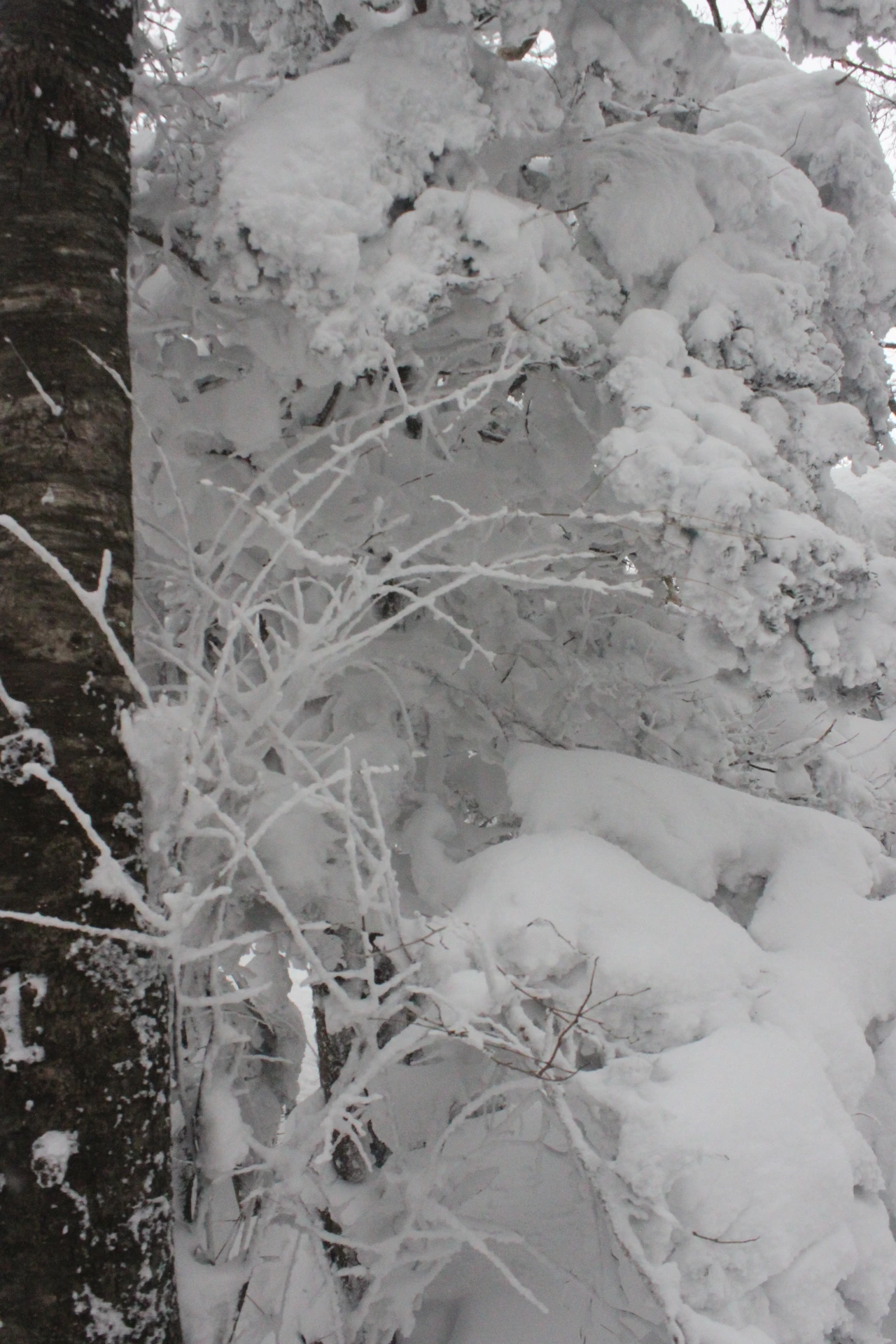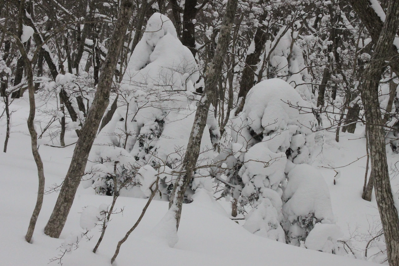 대피소를 통과해 경사가 점점 심해지는 길을 올라가다 보니 나무에 눈꽃이 마치 뼈대를 이룬 집처럼 그 하얀 속 뼈대들은 보여주어 마치 은은하고 찬란한 후광처럼 빛을 발한다.