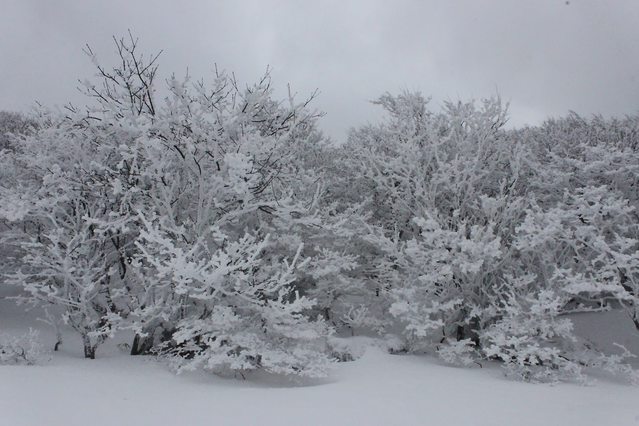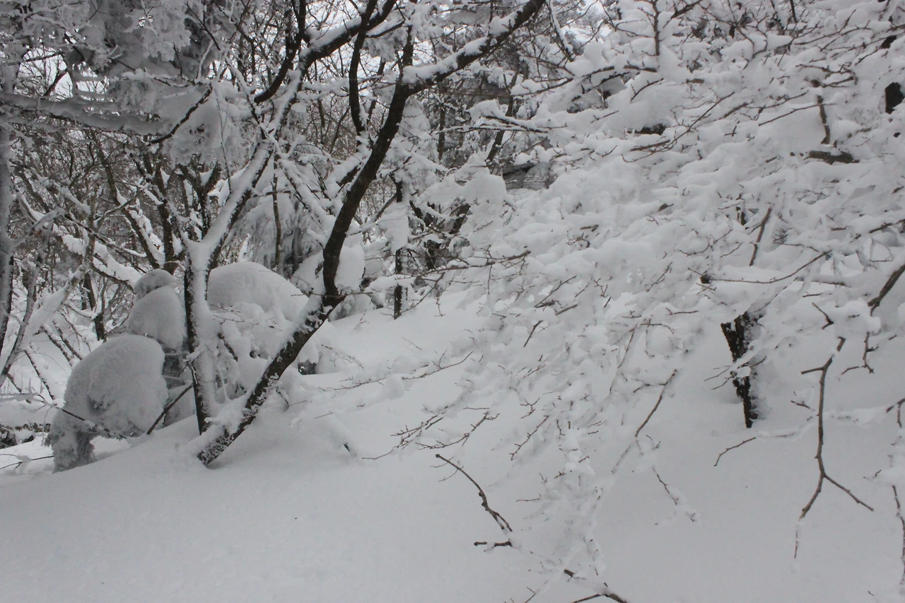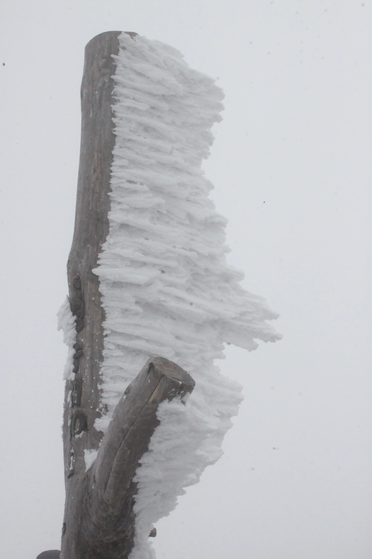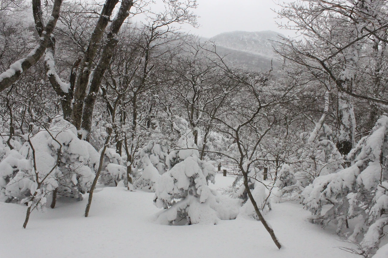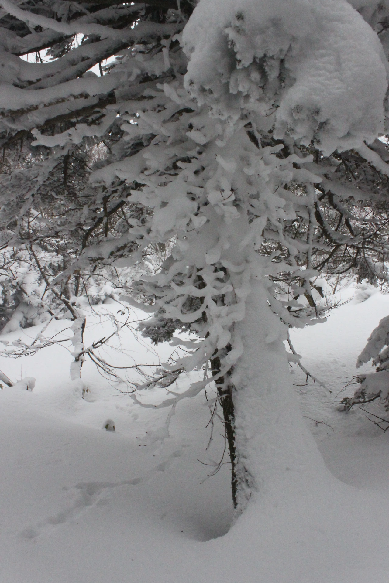 대피소를 통과해 경사가 점점 심해지는 길을 올라가다 보니 나무에 눈꽃이 마치 뼈대를 이룬 집처럼 그 하얀 속 뼈대들은 보여주어 마치 은은하고 찬란한 후광처럼 빛을 발한다.