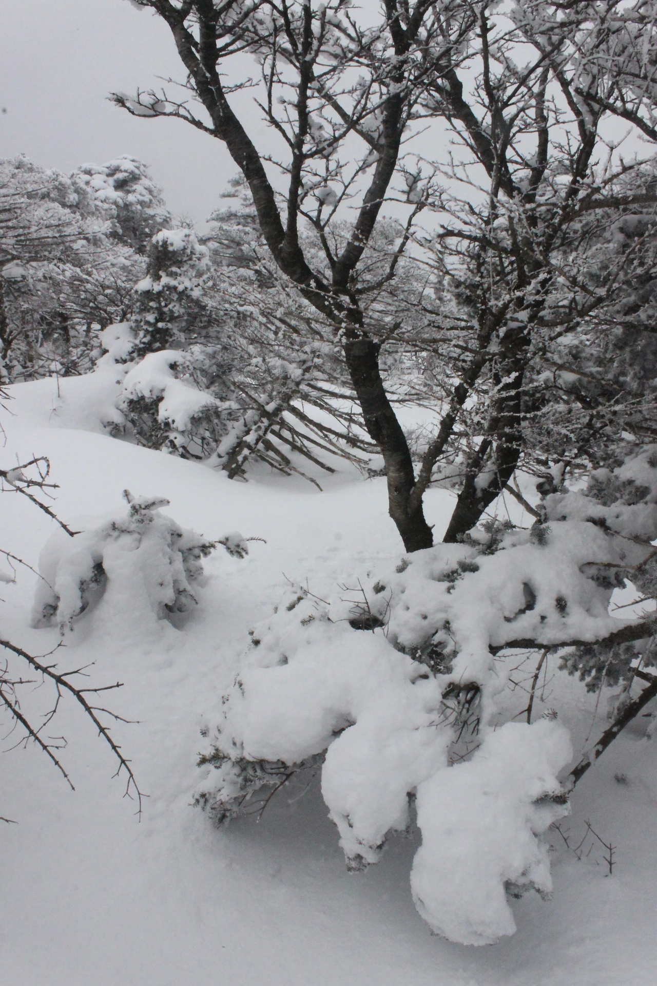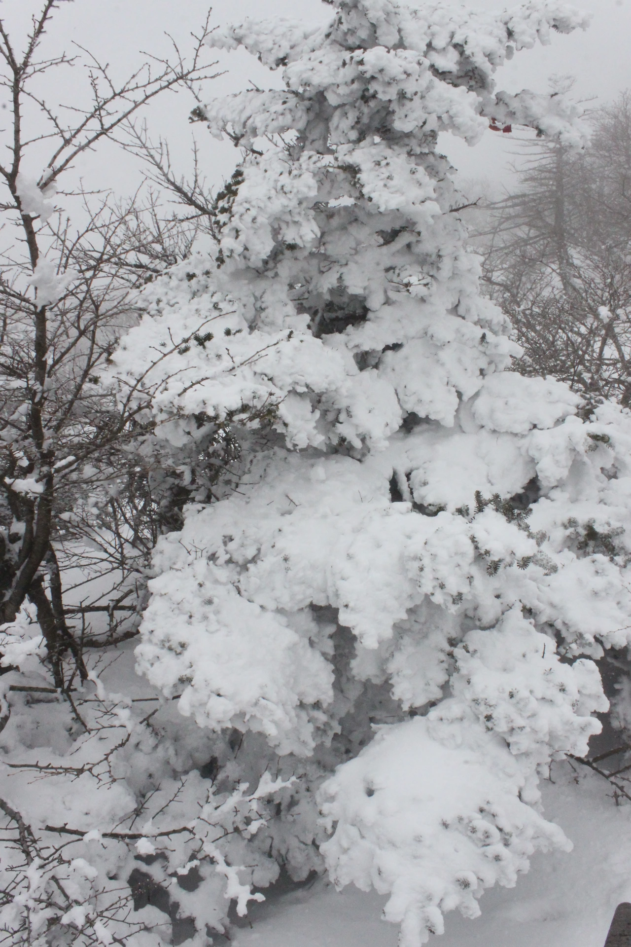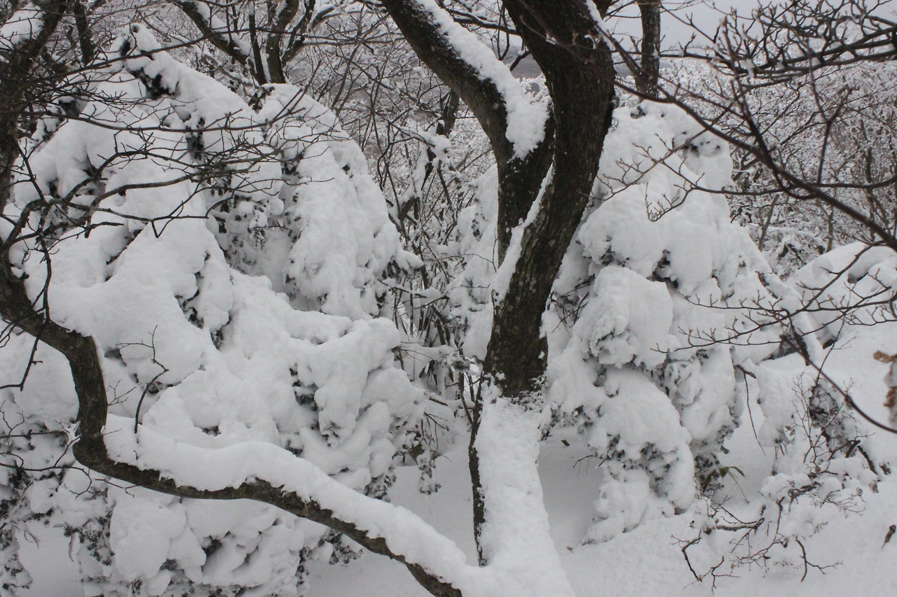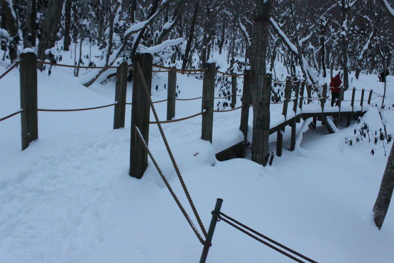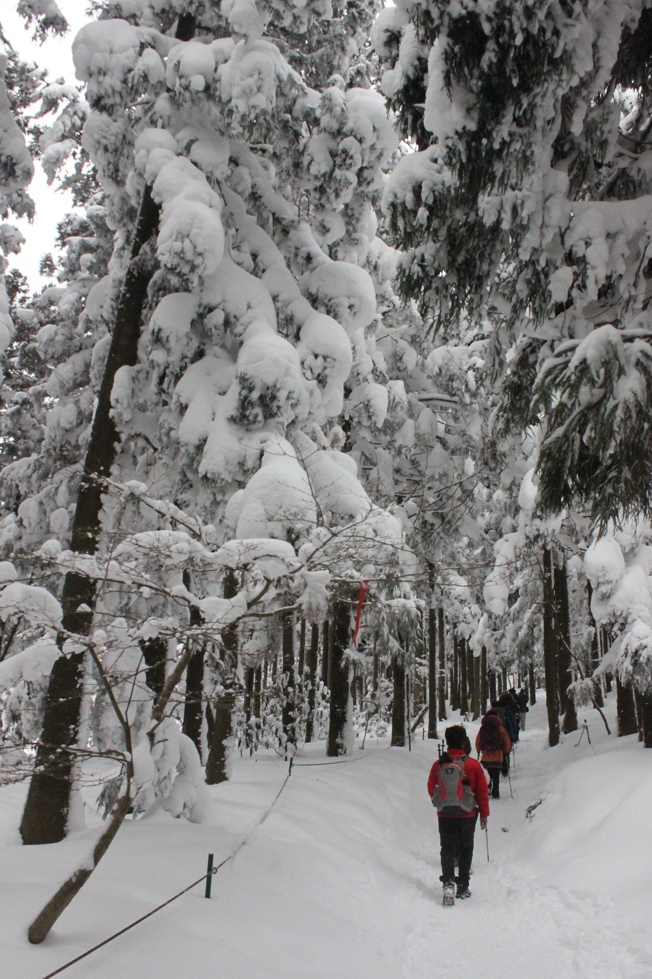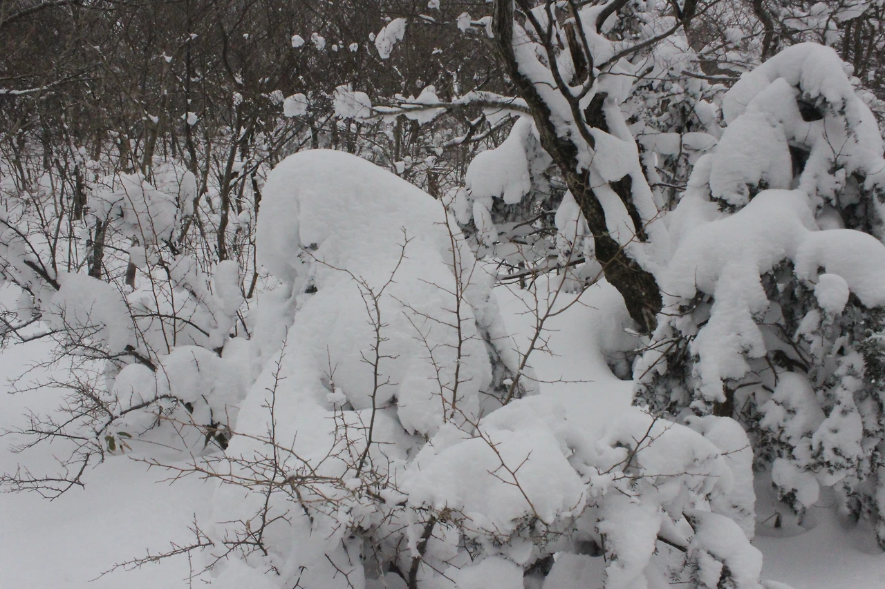 대피소를 통과해 경사가 점점 심해지는 길을 올라가다 보니 나무에 눈꽃이 마치 뼈대를 이룬 집처럼 그 하얀 속 뼈대들은 보여주어 마치 은은하고 찬란한 후광처럼 빛을 발한다.