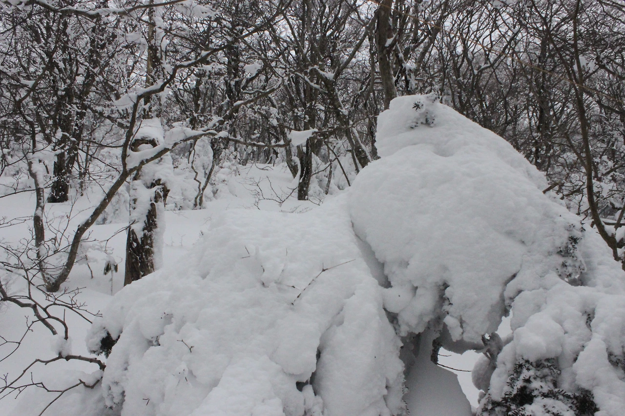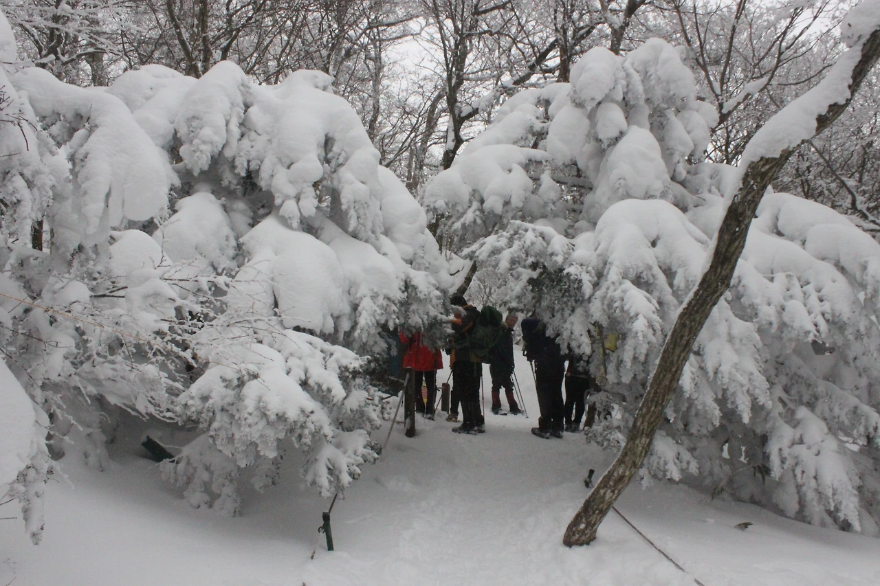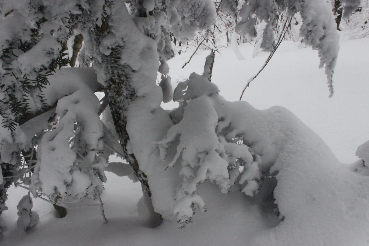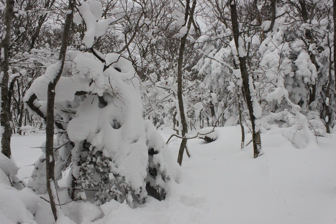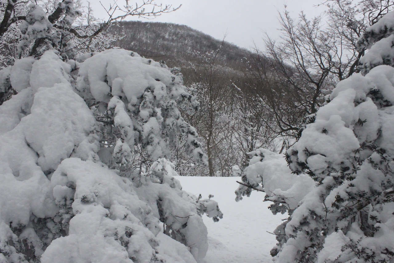 대피소를 통과해 경사가 점점 심해지는 길을 올라가다 보니 나무에 눈꽃이 마치 뼈대를 이룬 집처럼 그 하얀 속 뼈대들은 보여주어 마치 은은하고 찬란한 후광처럼 빛을 발한다.