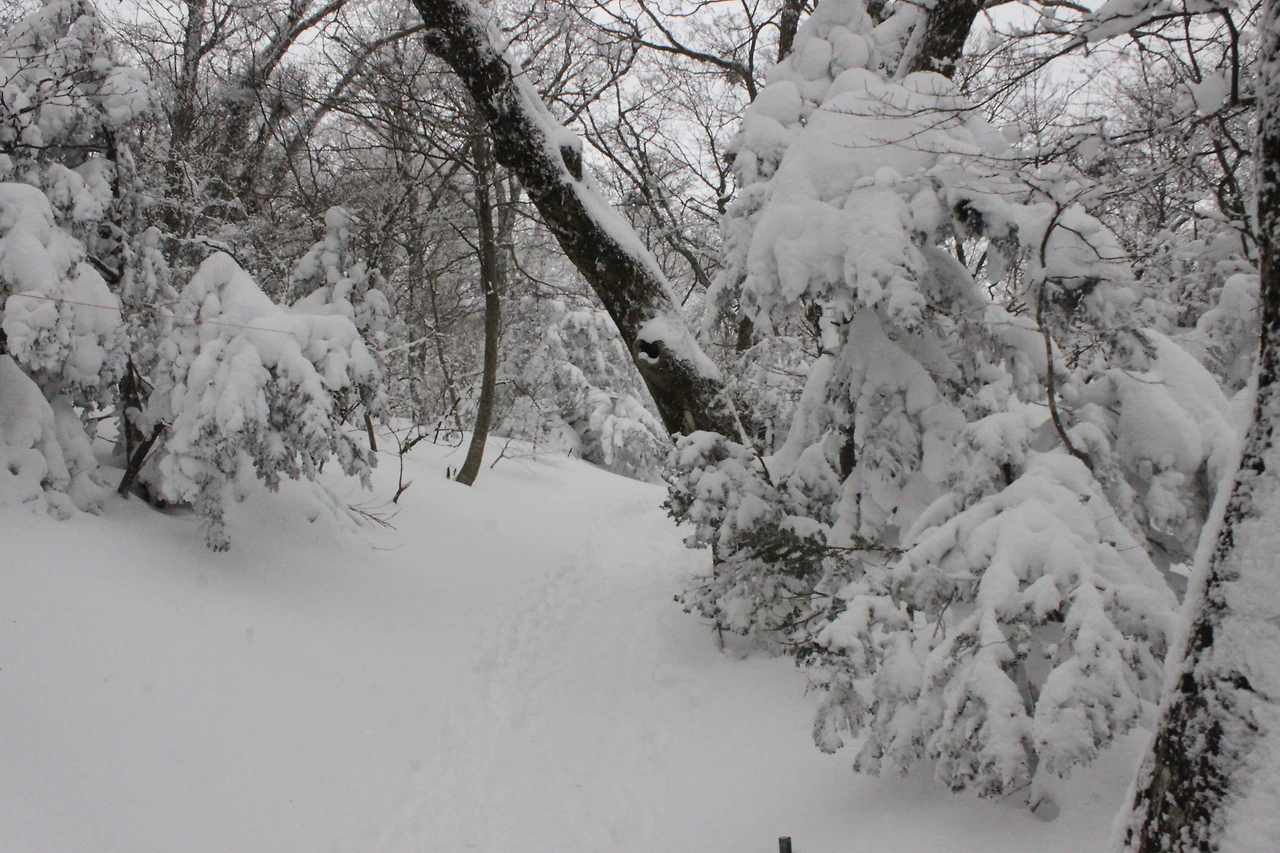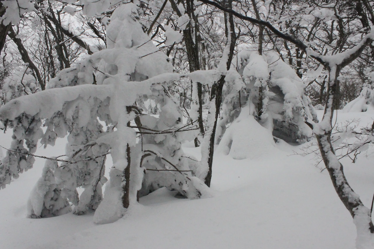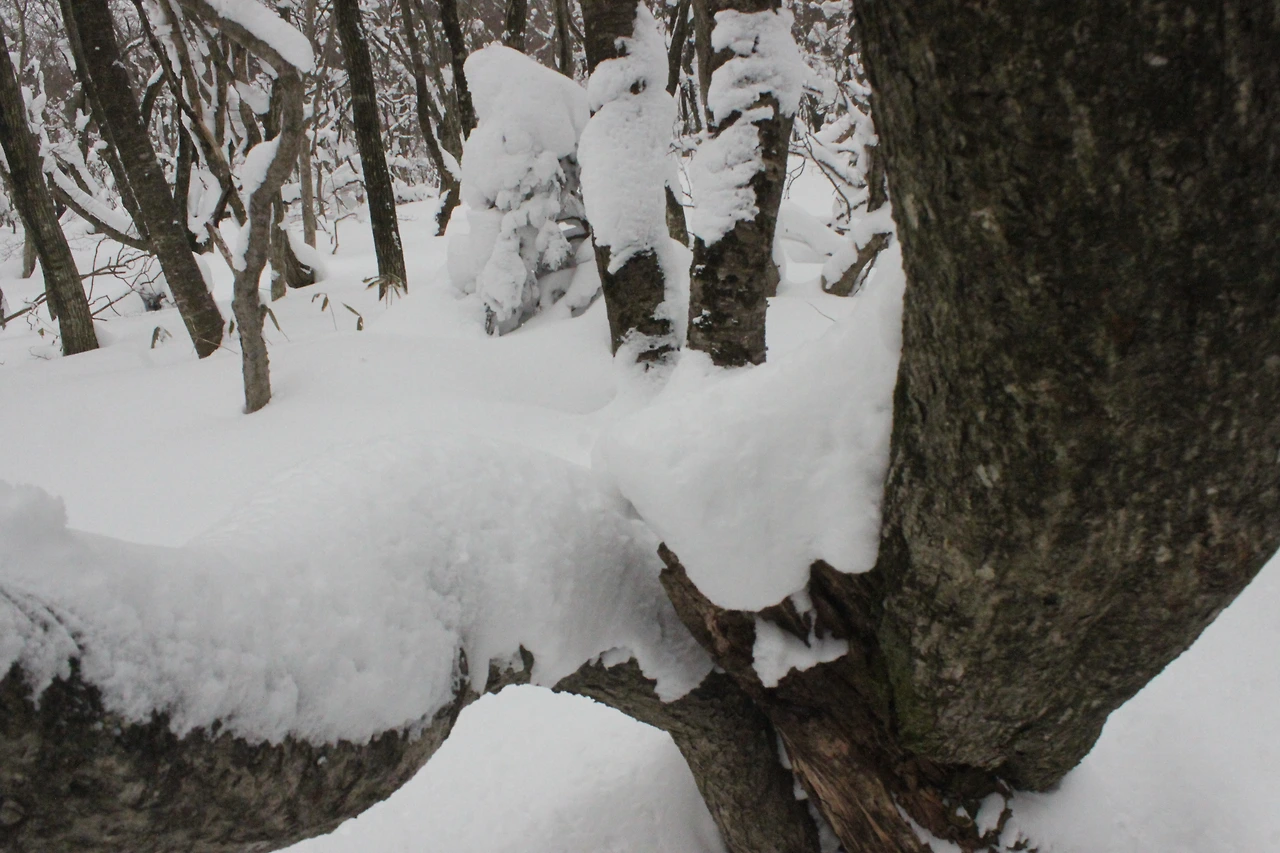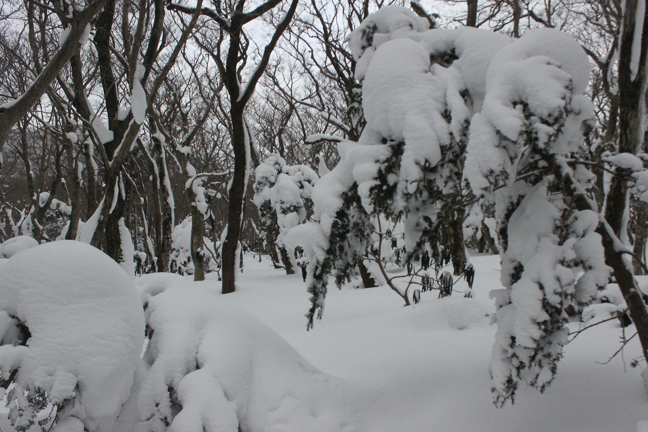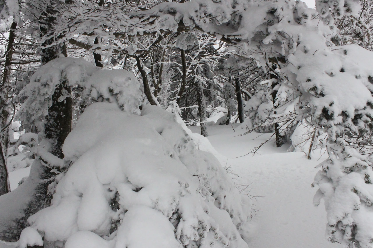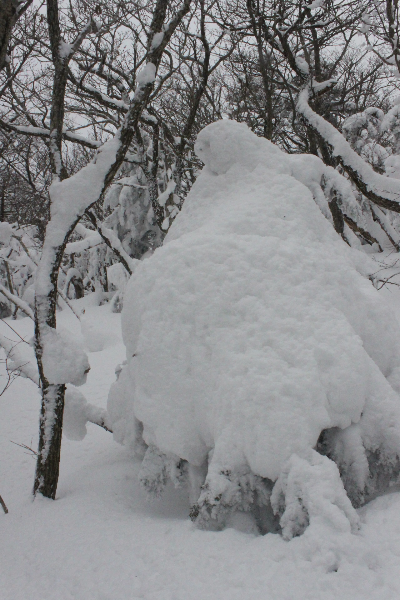 대피소를 통과해 경사가 점점 심해지는 길을 올라가다 보니 나무에 눈꽃이 마치 뼈대를 이룬 집처럼 그 하얀 속 뼈대들은 보여주어 마치 은은하고 찬란한 후광처럼 빛을 발한다.