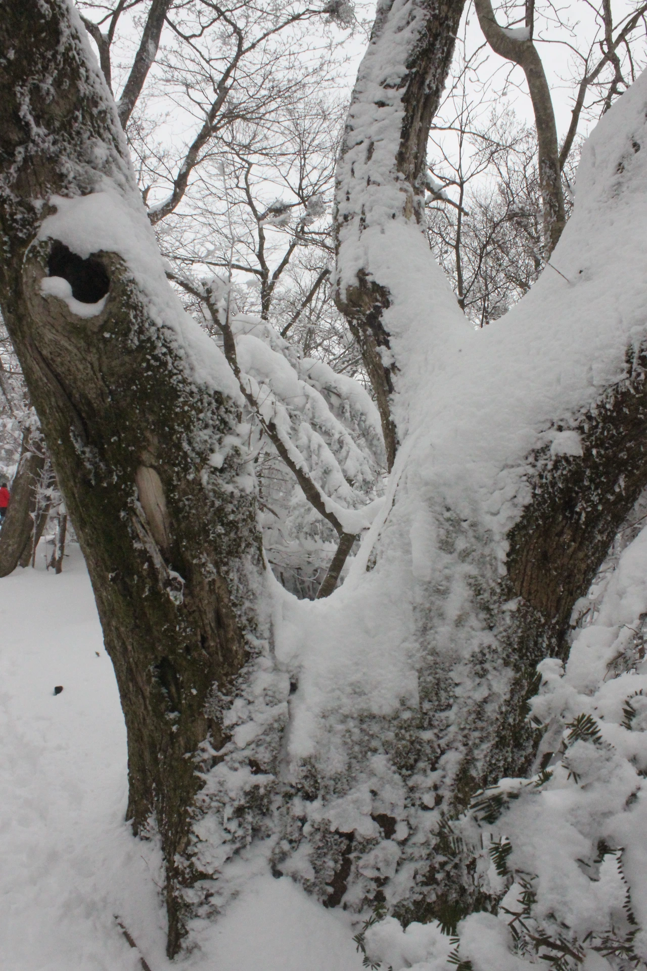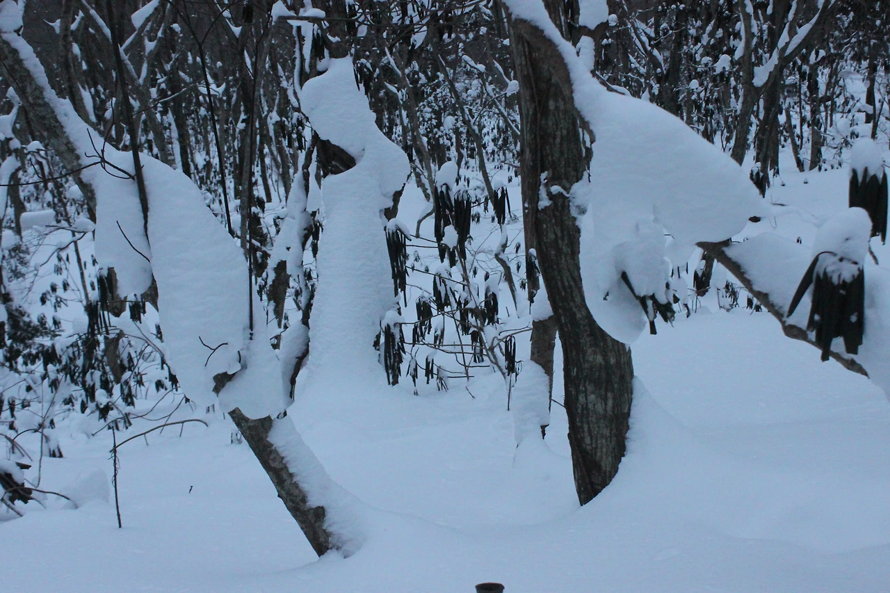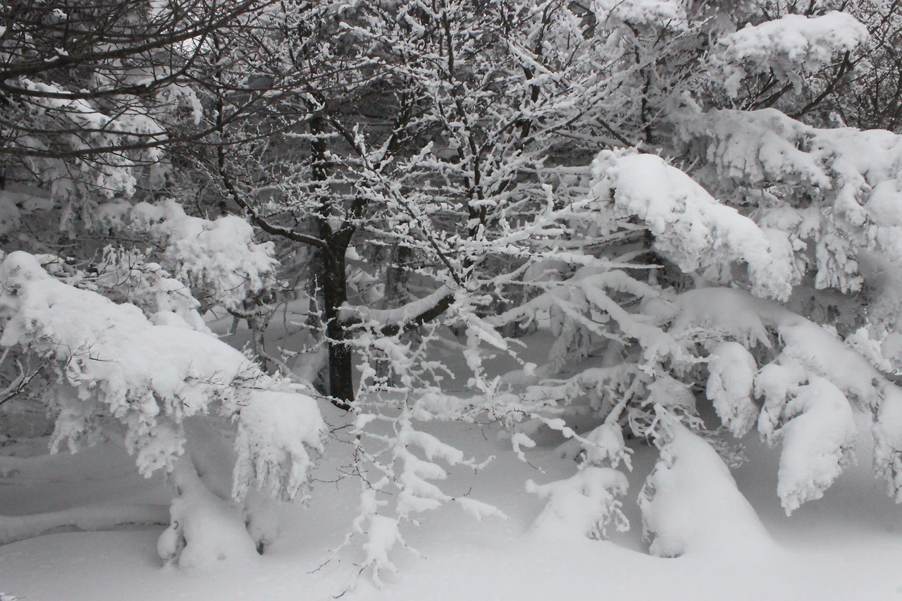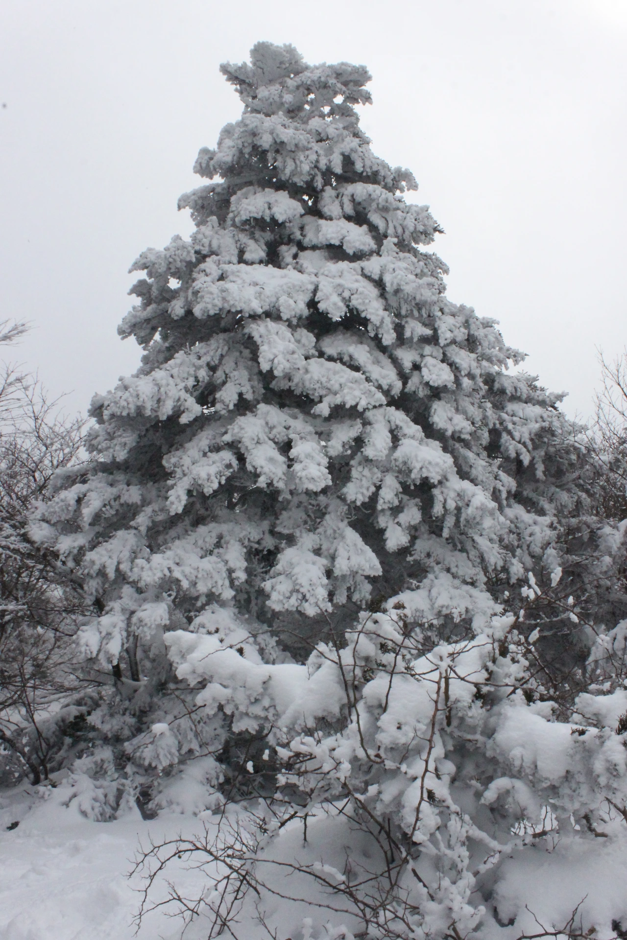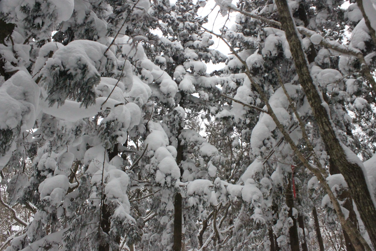 대피소를 통과해 경사가 점점 심해지는 길을 올라가다 보니 나무에 눈꽃이 마치 뼈대를 이룬 집처럼 그 하얀 속 뼈대들은 보여주어 마치 은은하고 찬란한 후광처럼 빛을 발한다.