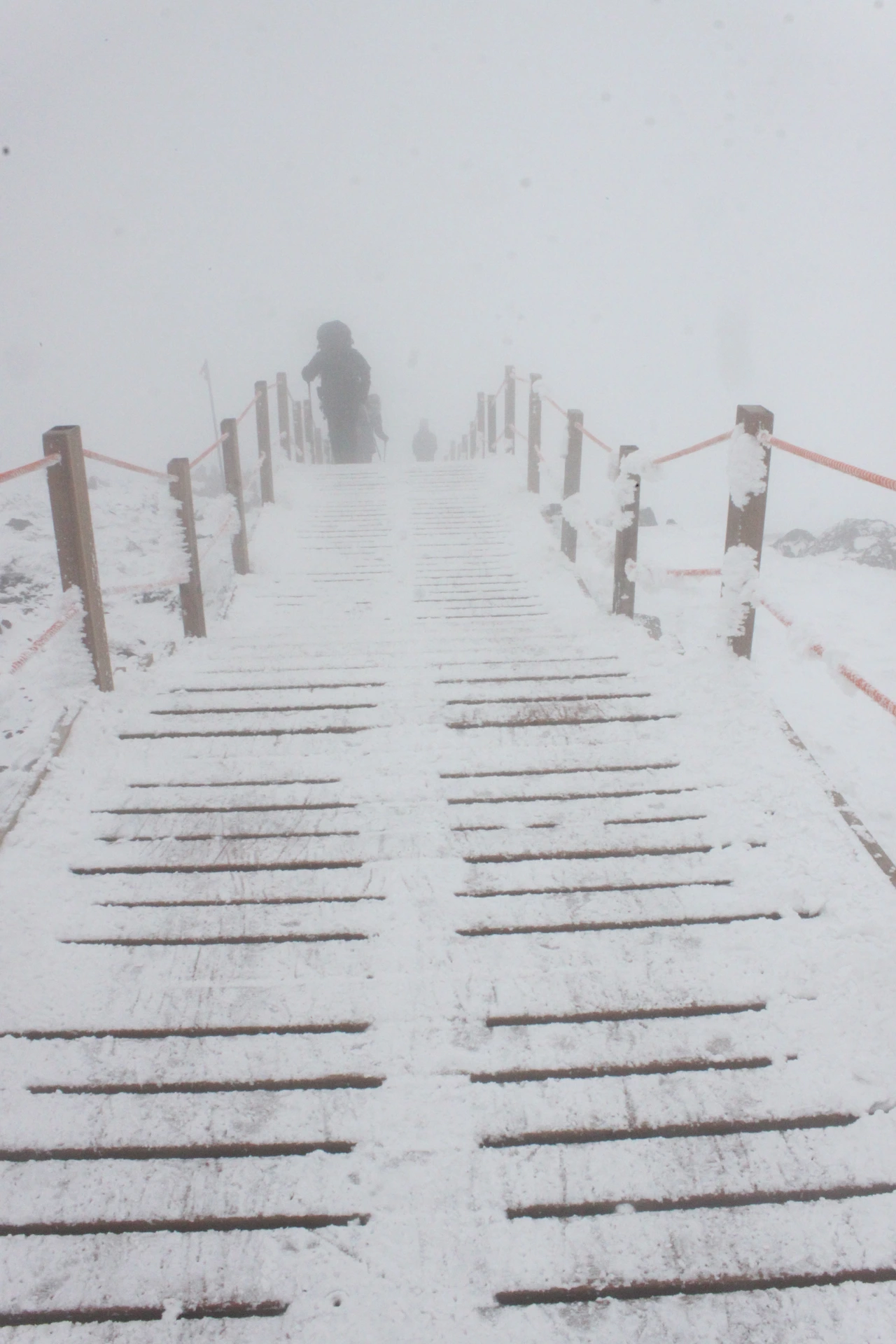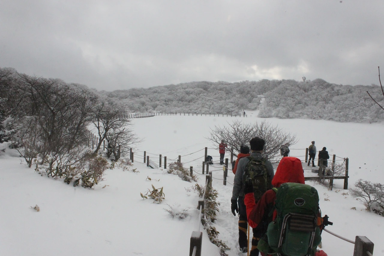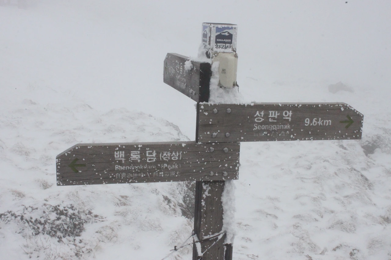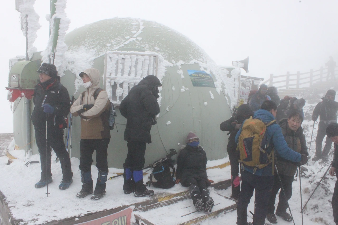 한라산 정상에 점점 다가갈수록 위에서 내려온 사람들의 머리가 백발이 되어 내려온다.