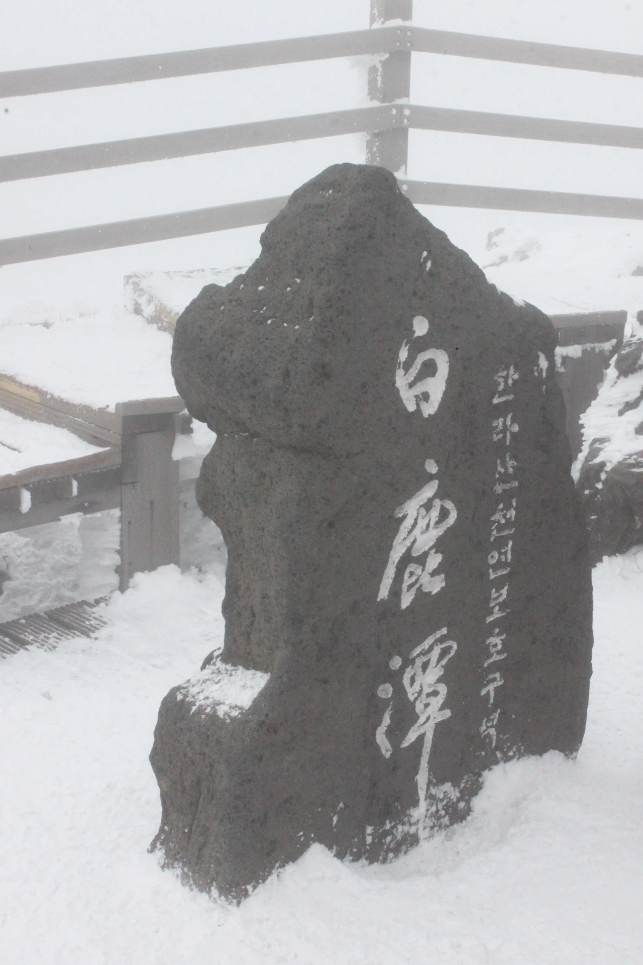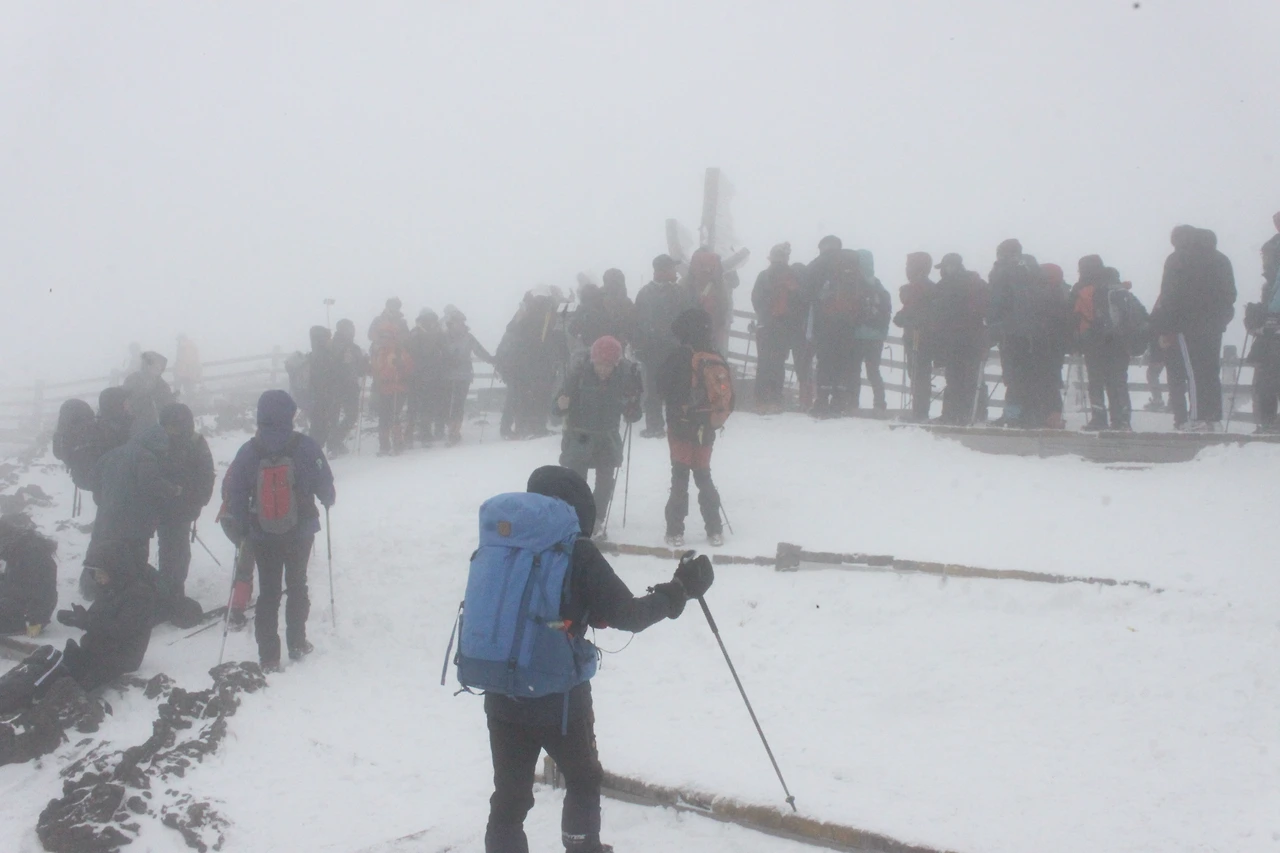정상에 올라서자 많은 사람들이 하얀 안갯속에서 '정상석'에 줄을 서 사진을 찍을 기회를 챙긴다.
