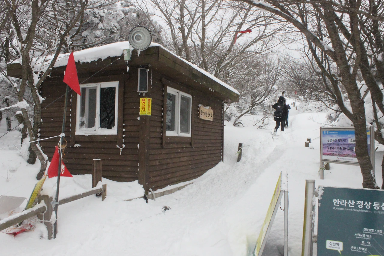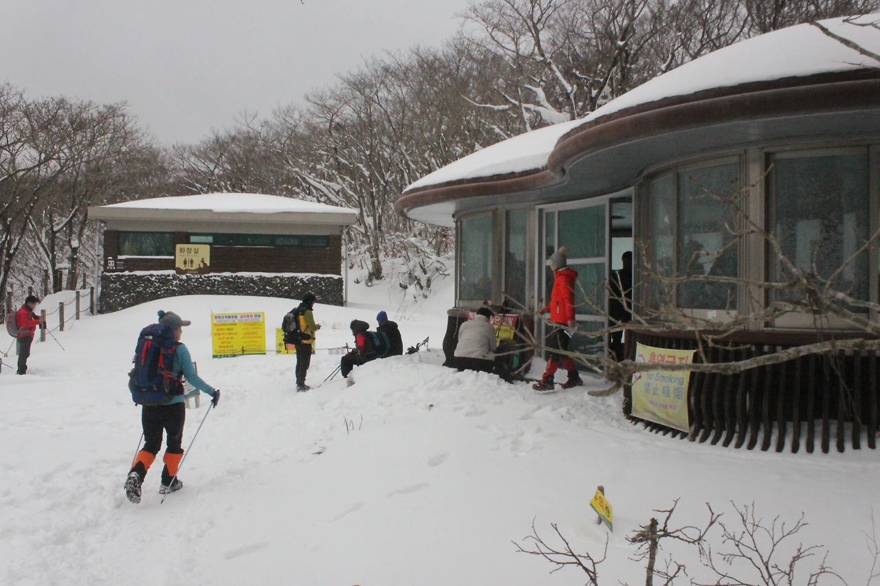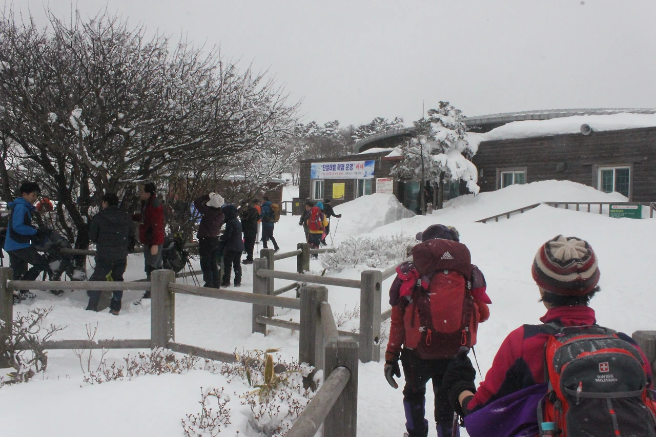 '성판악 휴게소'에서 눈으로 뒤덮인 길을 헤치고, 휴게실 가서 '아이젠'과 '스패츠'를 찬다.
