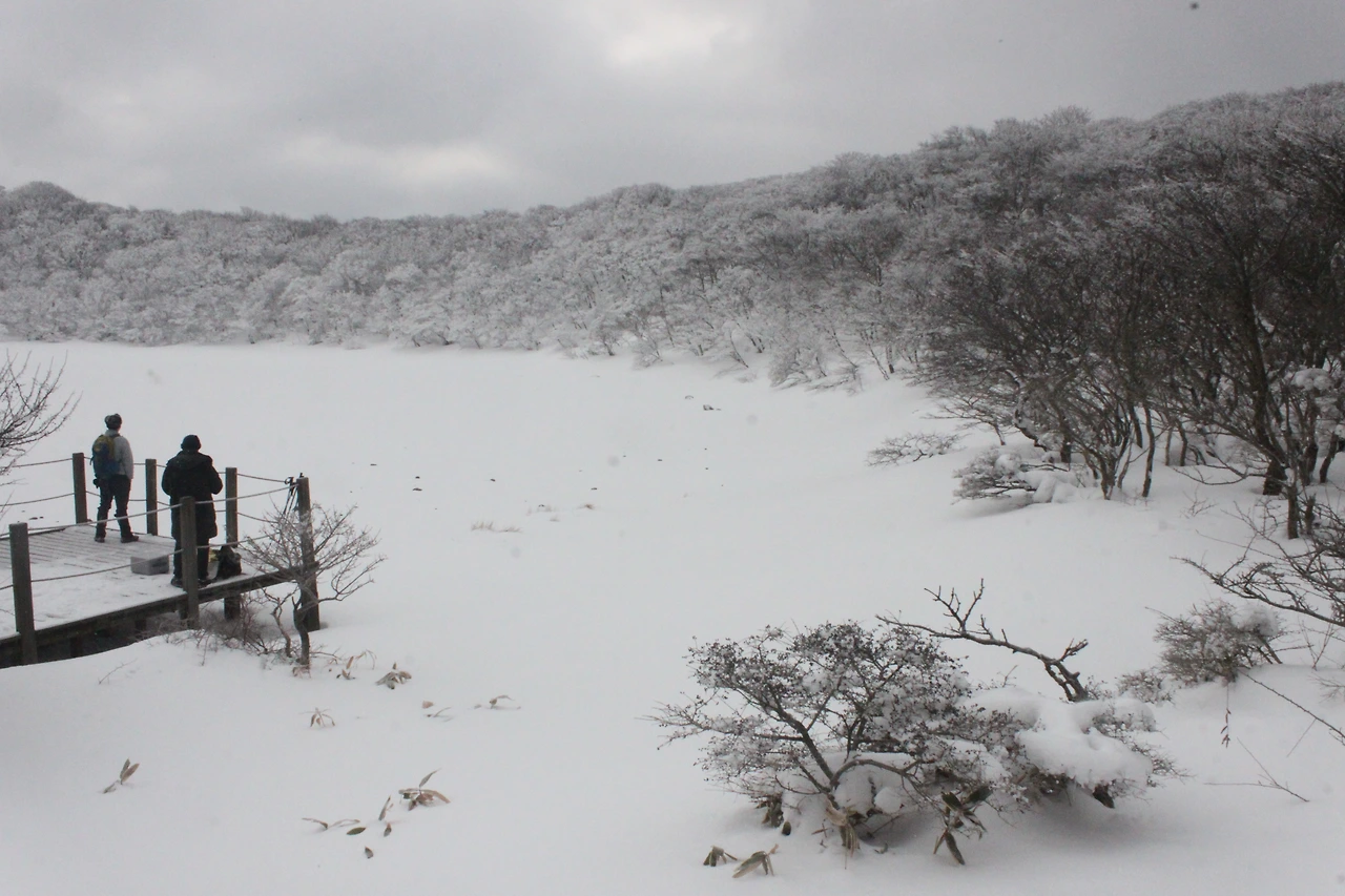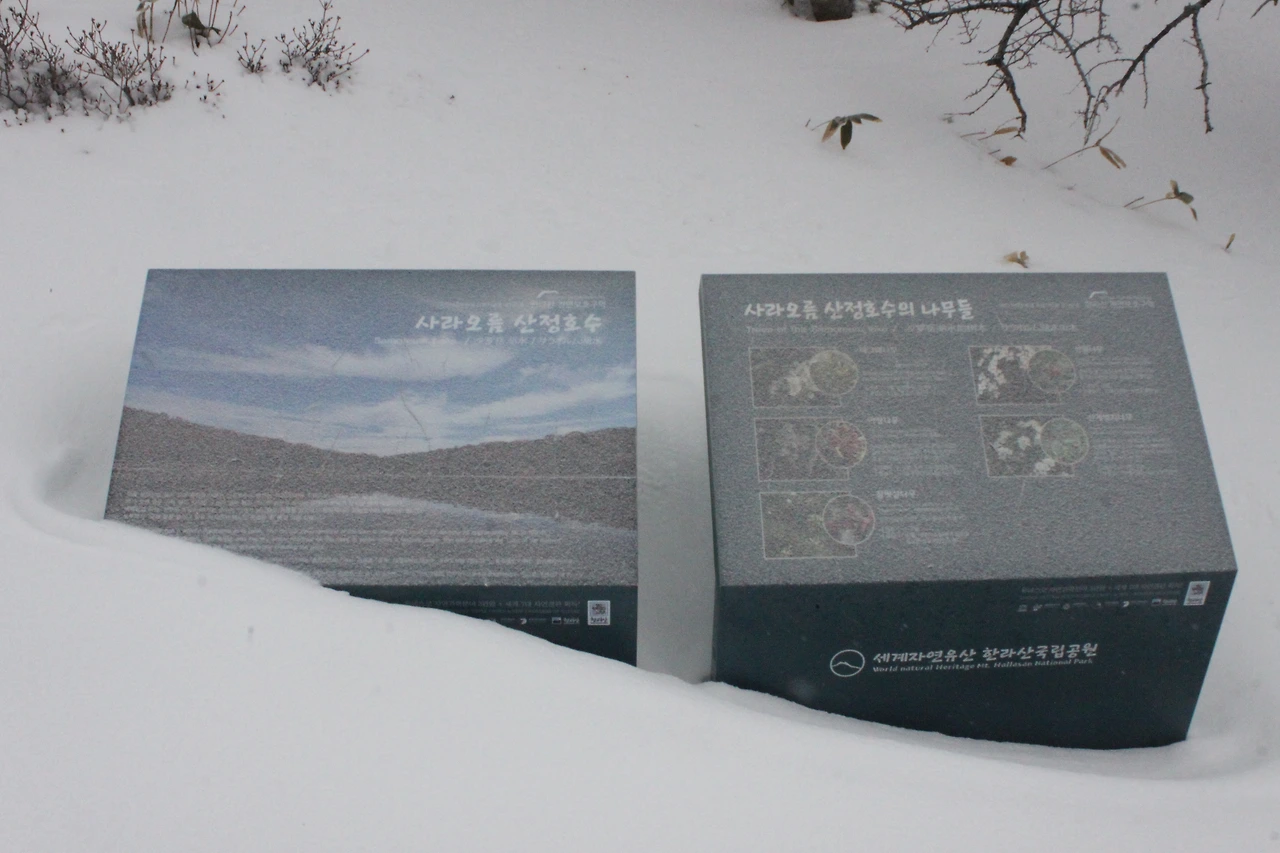 좁은 눈길을 오르며 10여분 만에 오른 사라오름은 백지처럼 하얀 투명한 호수 위에 공연 준비를 막 마친 최대 크기의 '백조의 호수 공연장'이다.