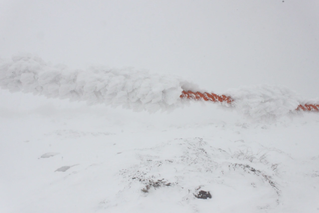 밧줄에는 눈이 붙어 천 개의 칼날처럼 날을 세우고, 바람이 거세 오히려 눈이 붙어있지 못한다.