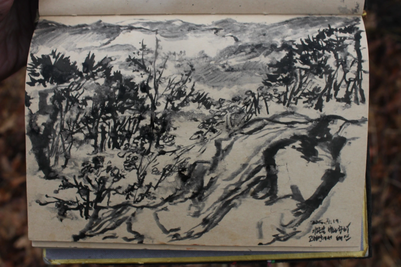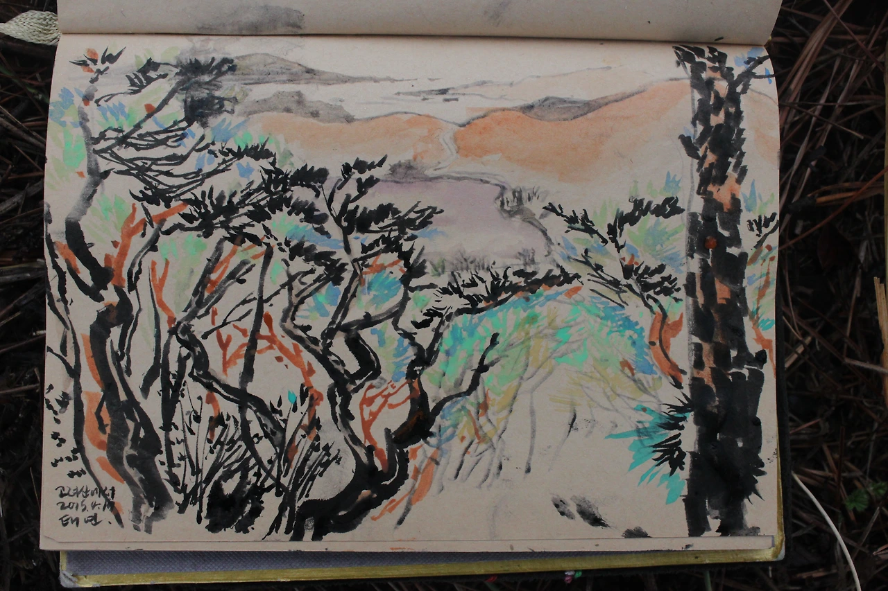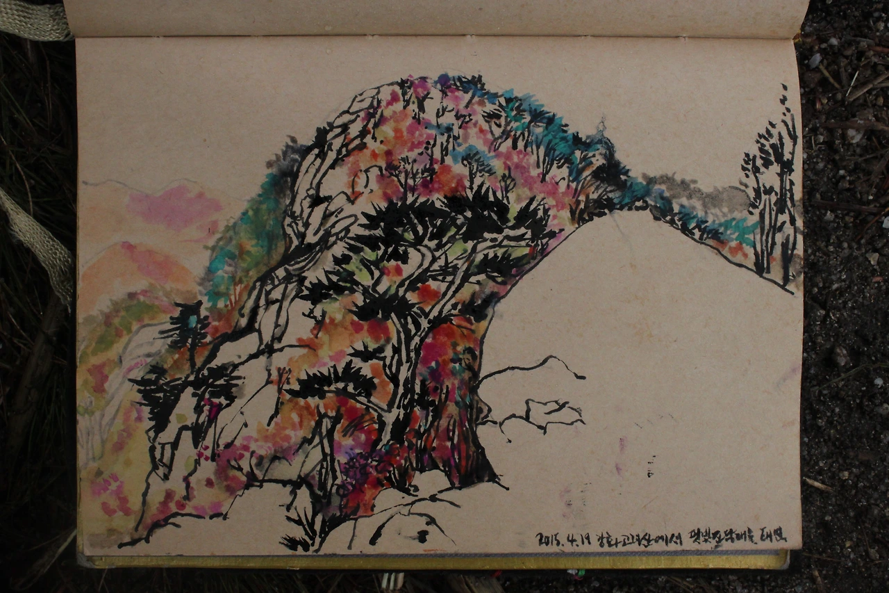 유유자적 빗물과 함께 걷고 있자니 오르면 오를수록 더 좋은 조망들이 나를 나아가지 못하게 하여 아쉬운 데로 한 장을 더 그린다. 이번엔 조심조심 우산을 쓰고 스케치북에 물이 닿지 않게 조심조심 그린다. 우산은 뒤집어 지고 비바람은 거세고 하지만 곳곳에 널려진 투명한 느낌의 진달래 꽃들과 연둣빛 잎들로 인해 마음은 싱그러워진다.