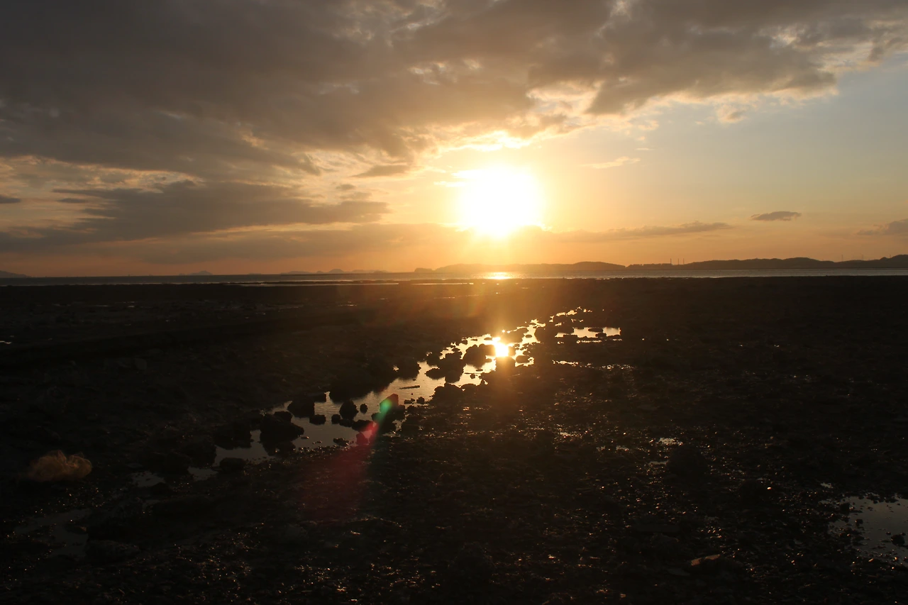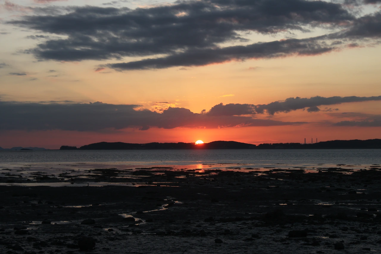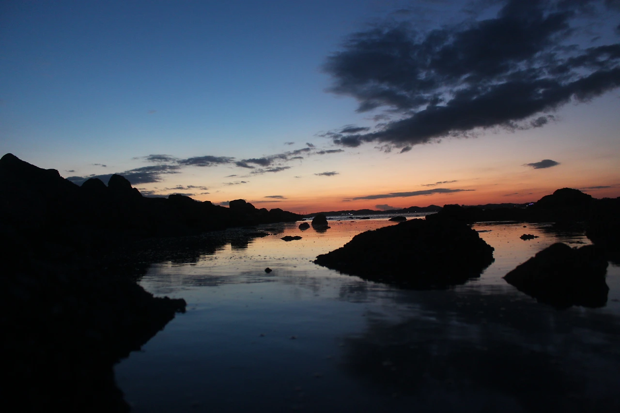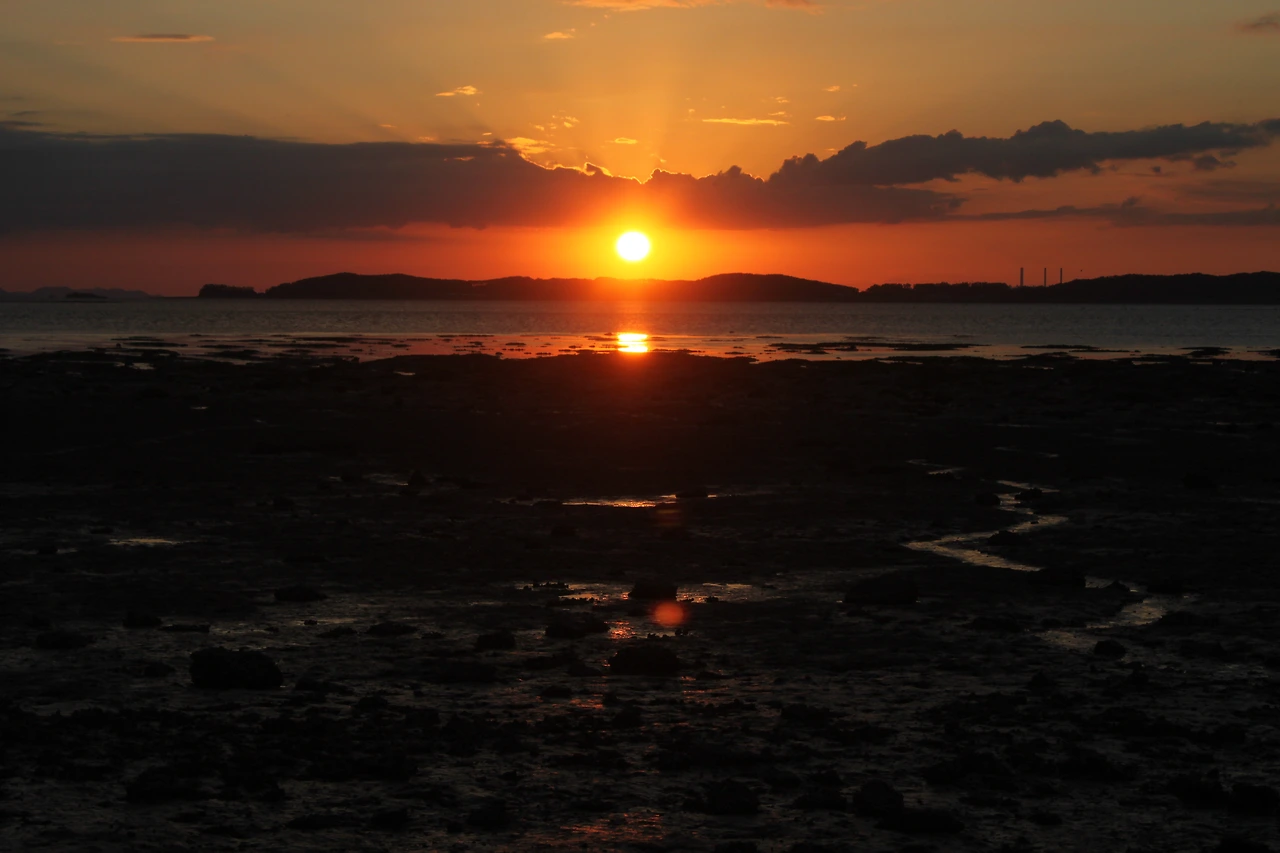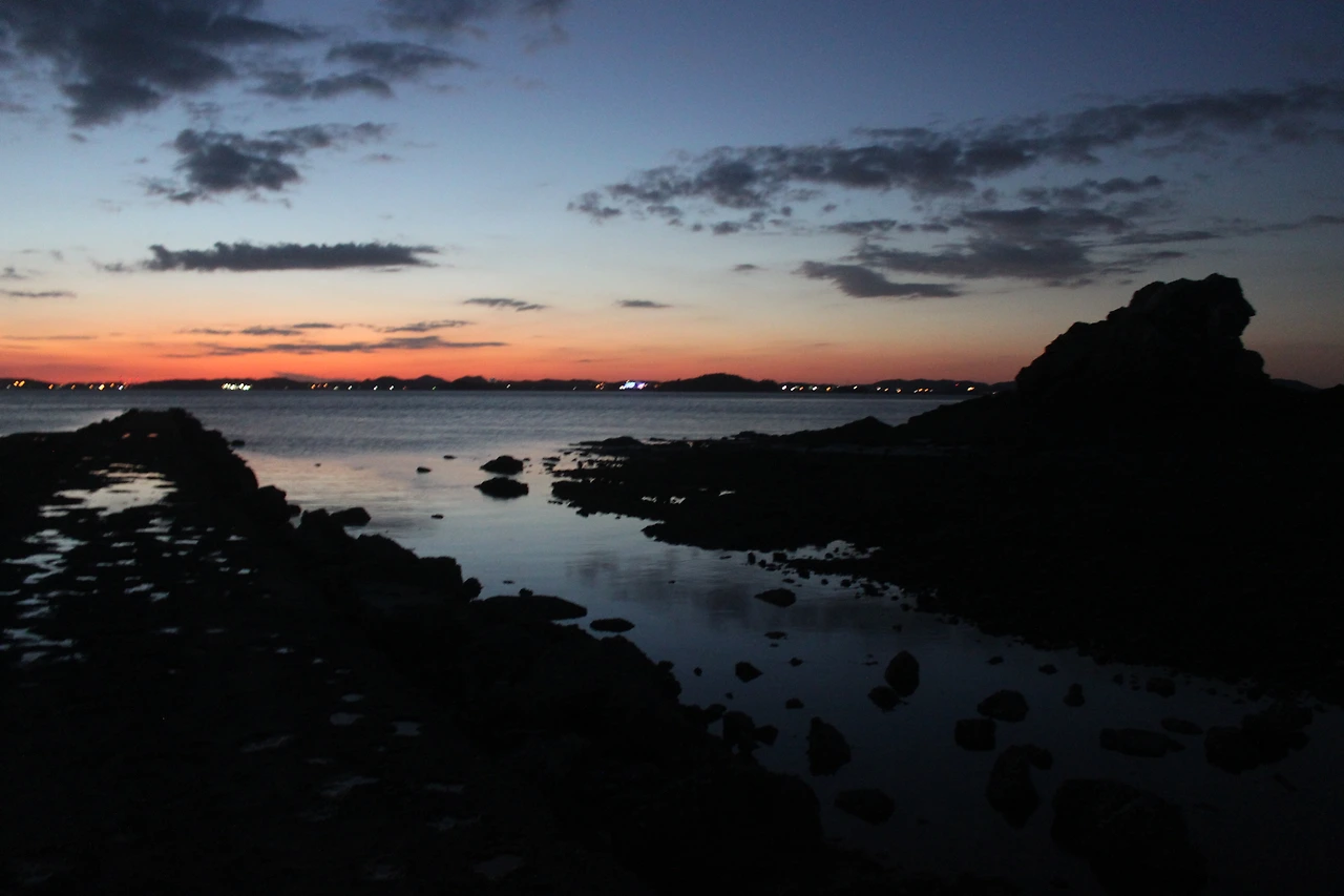 아쉬운 맘을 뒤로 한 채 섬의 중심으로 산행길이 있다. 5분 정도 걸어 산의 꼭대기를 찍고 내려간다. 저녁 노을을 찍으러 출사 온 사람들이 길 위에 포진하고 있다. 그들이 없는 다른 곳에서 찍어야 한다는 내 삶의 불편한 고지식함을 가지고, 들어오면서 본 바위섬 두 개 쪽으로 방향을 튼다. 거기서 섬 사이로 떨어지는 태양의 불구덩이를 본다. 태양이라는 붉은 열매는 사라져 갔어도 그 흔적이 아쉬워 자꾸 카메라를 눌러 댄다.