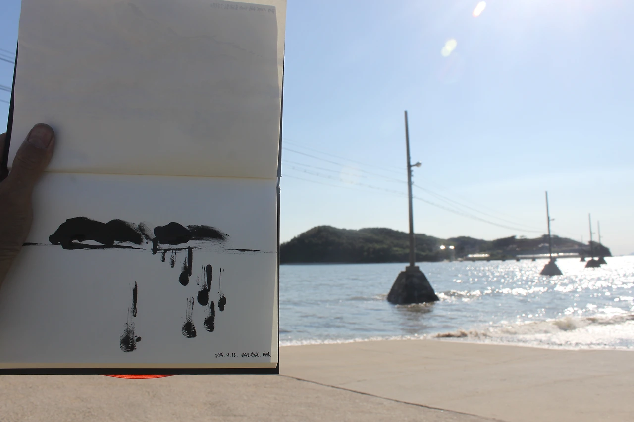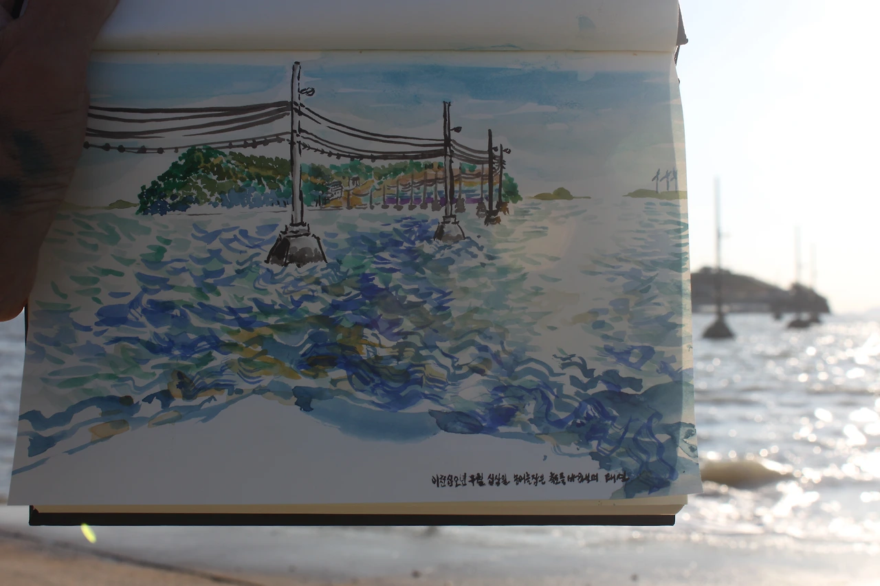마을을 지나쳐 건너편 바다가 보이는 곳으로 갔다. 일행과 어느 정도 각자의 작업을 하다 만나기로 하고, 나는 선재대교 다리 밑에서 ‘목섬’을 바라보며 스케치를 했다.