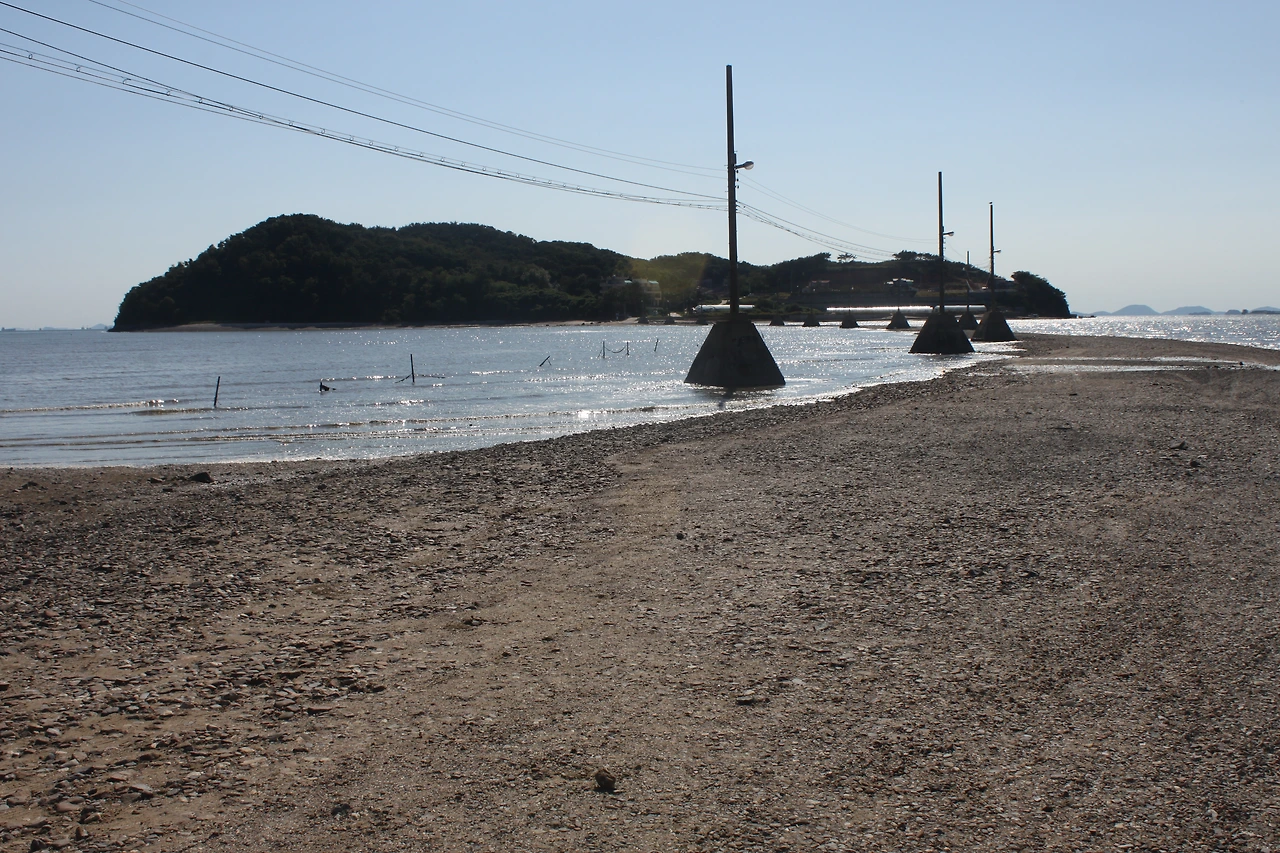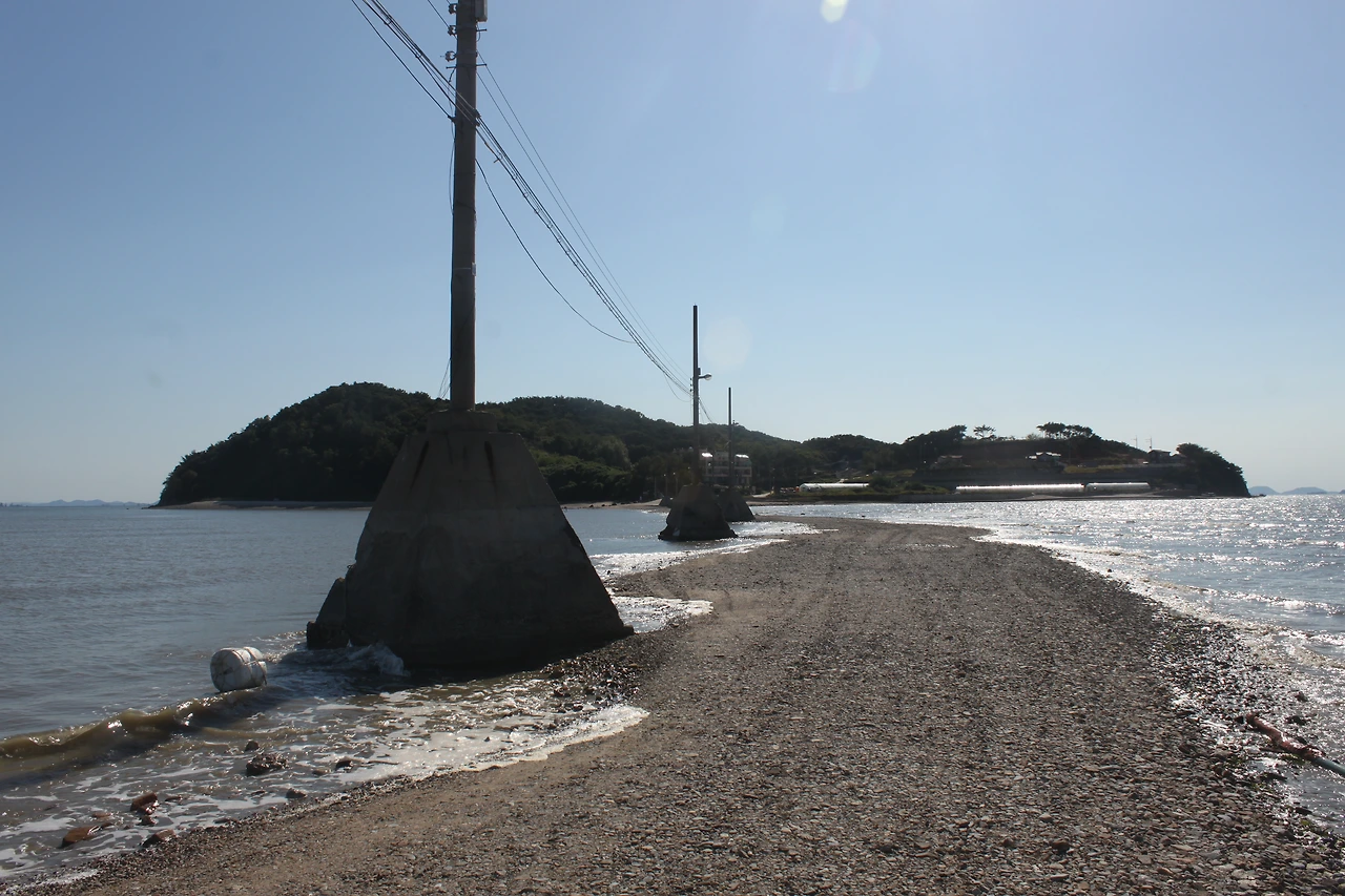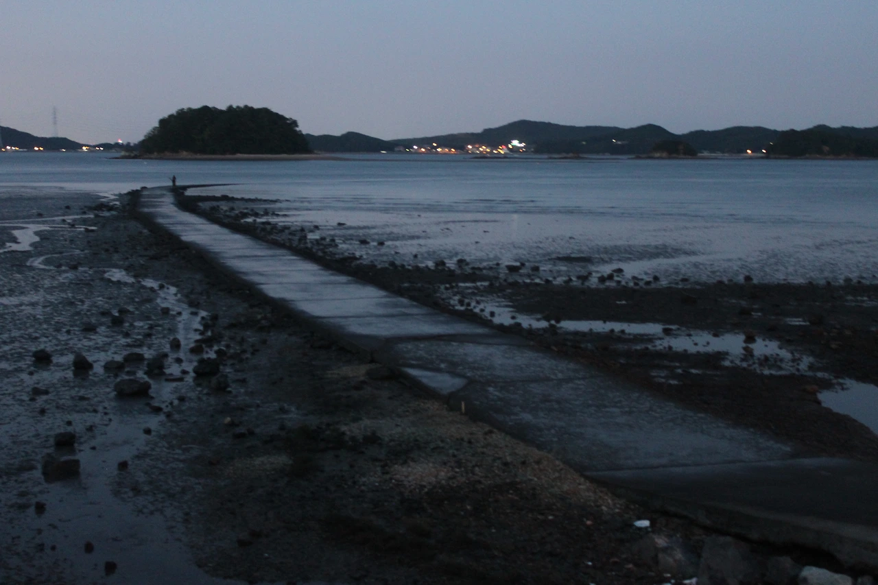 눈에 가까운 곳에 ‘측도‘가 눈에 들어온다. 측도로 가는 길은 마치 애니메이션에 나오는 것처럼 전기와 불이 바다 전봇대를 통해 들어간다. 그 길을 따라 차가 지나갈 정도의 자갈길이 있다. 바다를 가른 그 길을 따라 걷는다. ’측도‘에 다다랐을 무렵 물이 차오르기 시작한다.