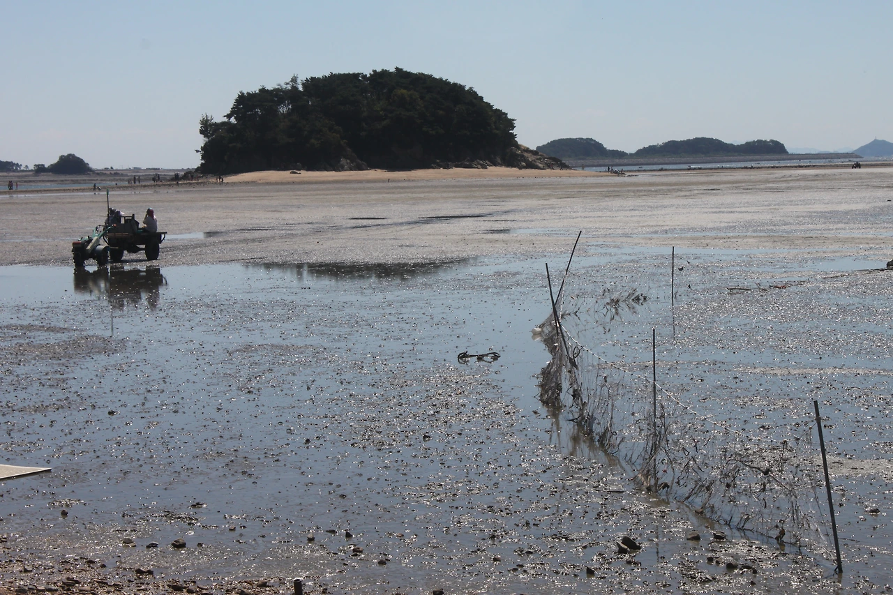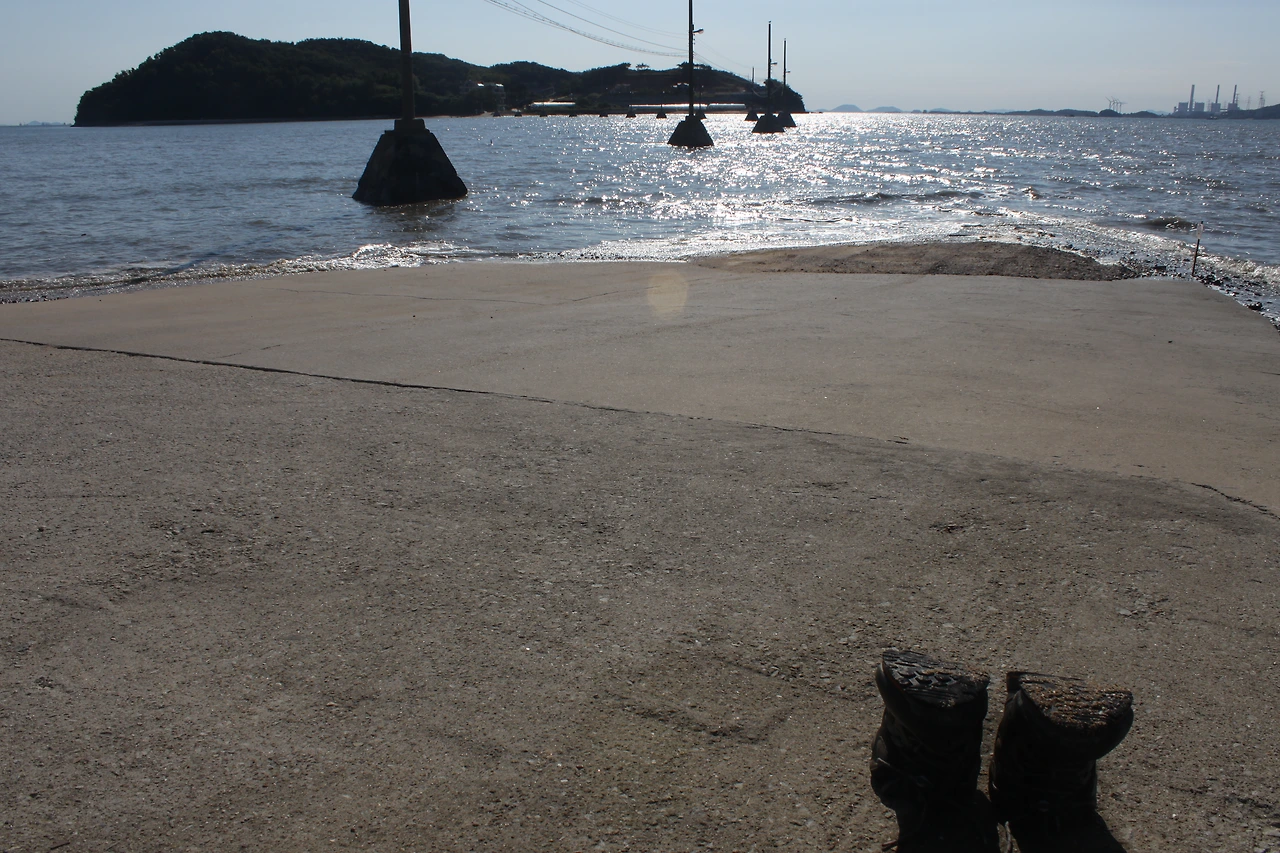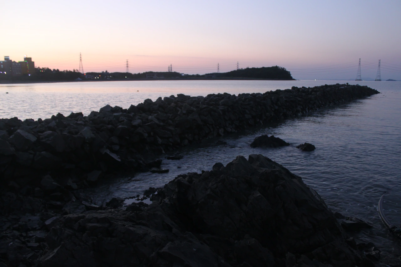 눈에 가까운 곳에 ‘측도‘가 눈에 들어온다. 측도로 가는 길은 마치 애니메이션에 나오는 것처럼 전기와 불이 바다 전봇대를 통해 들어간다. 그 길을 따라 차가 지나갈 정도의 자갈길이 있다. 바다를 가른 그 길을 따라 걷는다. ’측도‘에 다다랐을 무렵 물이 차오르기 시작한다.