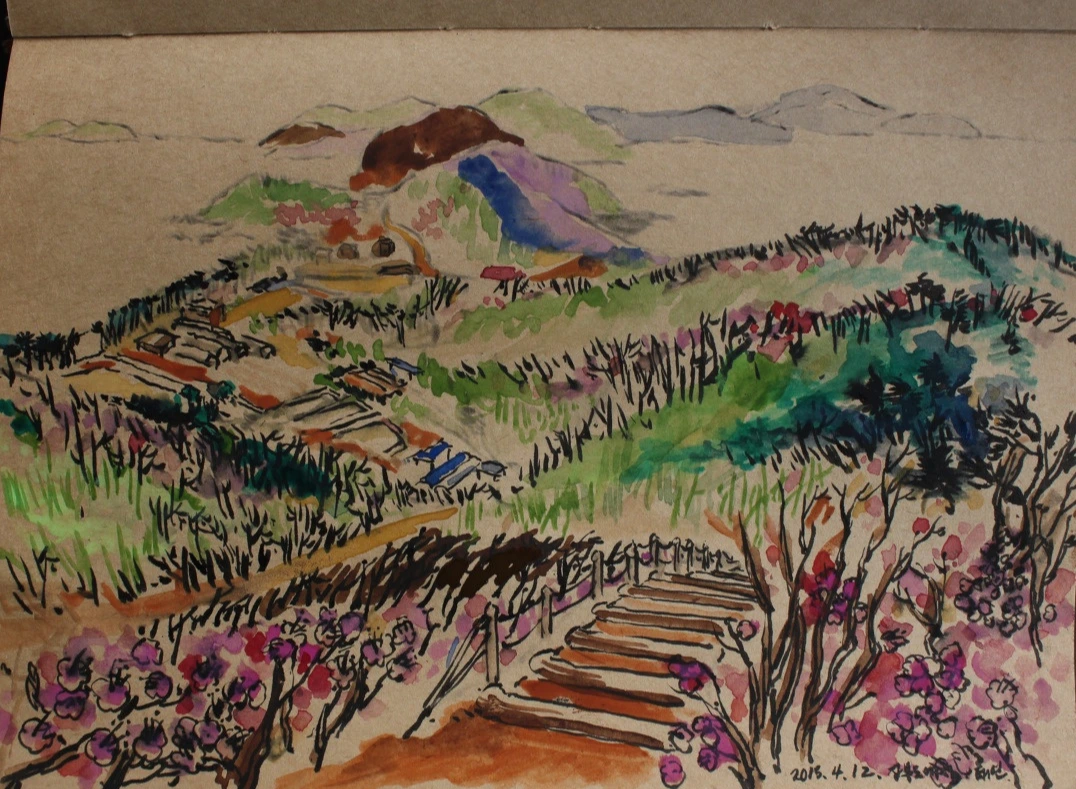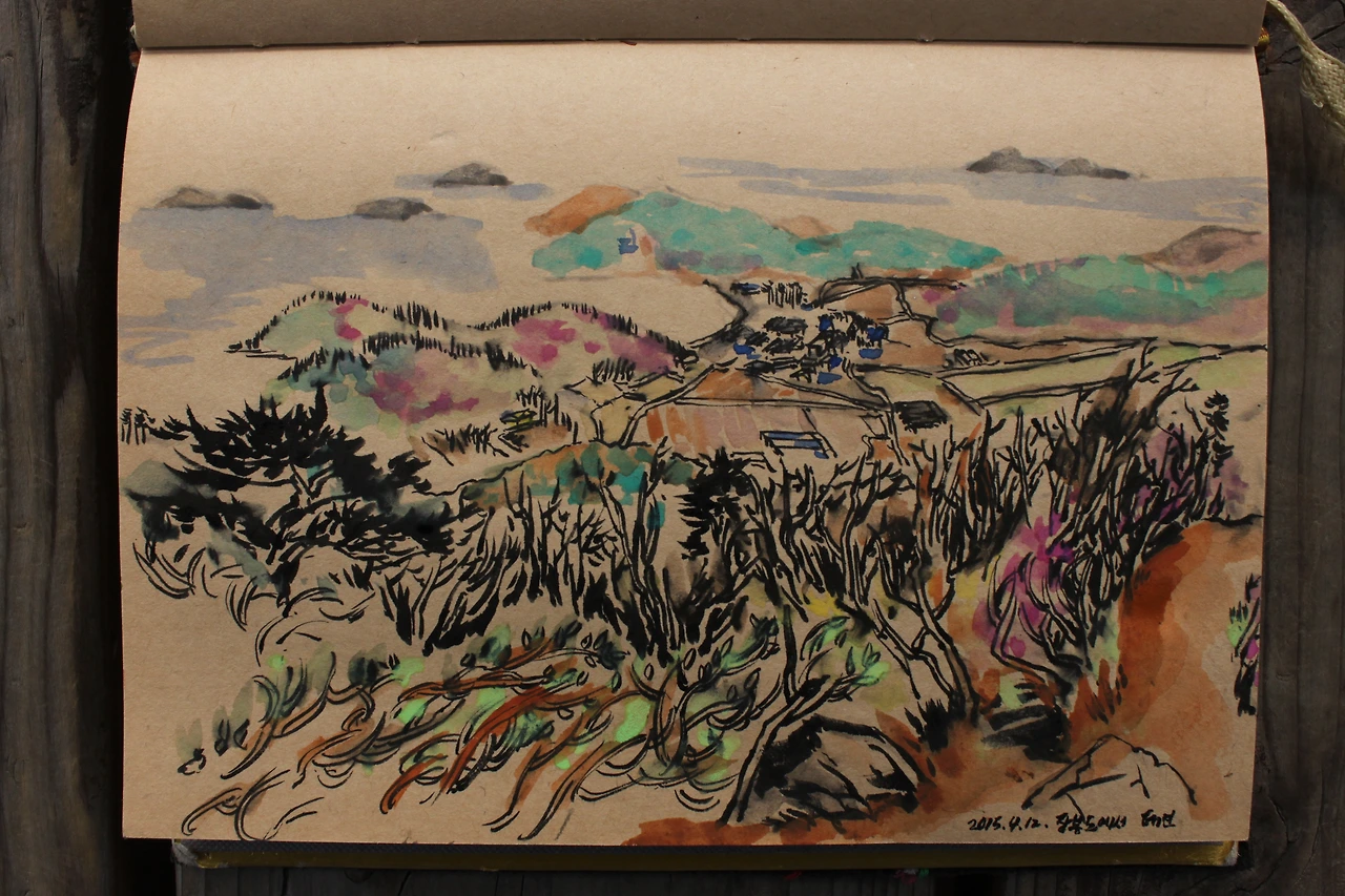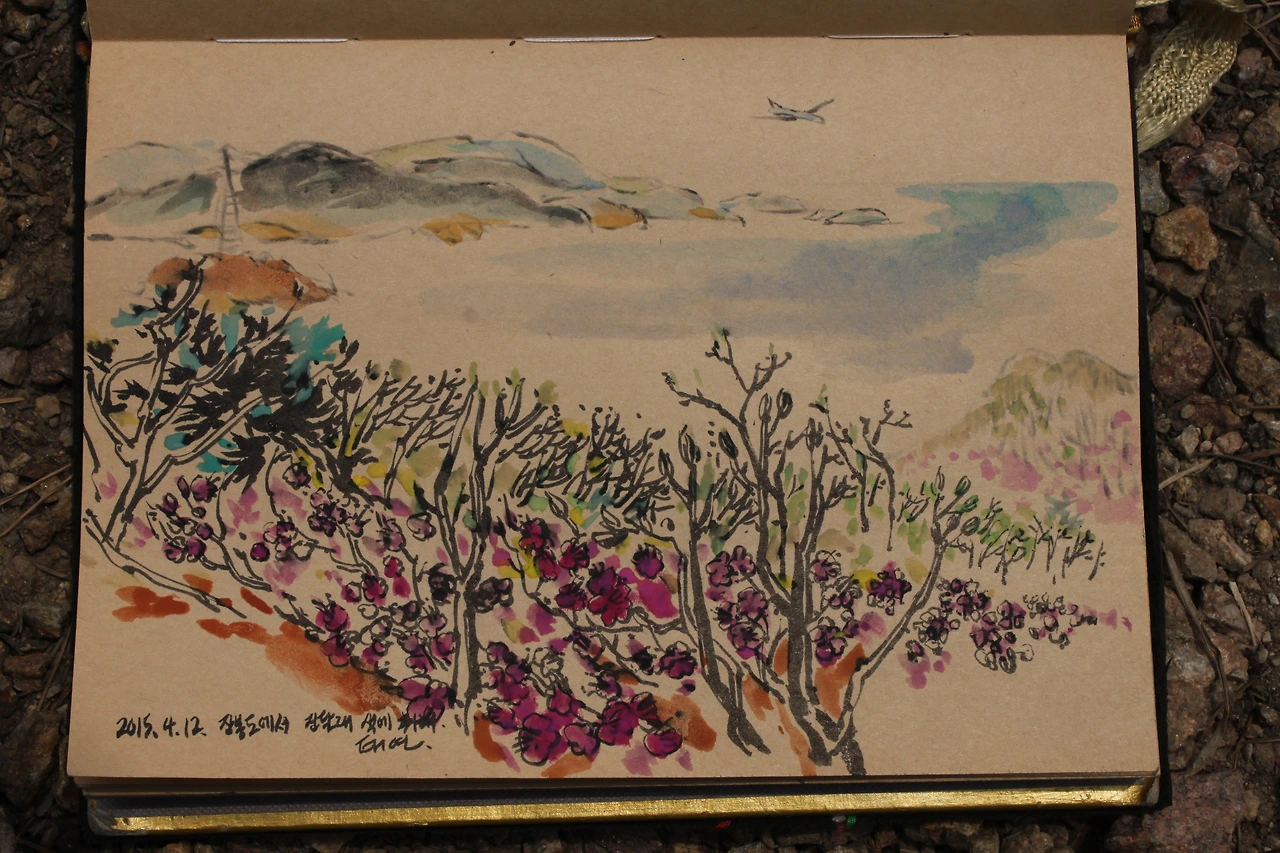 어디를 갈까 고민하다가 구관이 명관이라 서해의 '장봉도'에 두 선배님을 모시고 다녀오게 되었다. 장봉도에 벚꽃이 피어 있을 줄 알았는데 역시 섬이라 아직 꽃들이 피기 전이었다. 장봉도의 도로는 벚나무의 연속이라 다음주 이맘때는 상당히 아름다우리라 예상된다. 여하튼 큰 기대하지 않고 간 장봉도 산행의 시작점 팔각정을 향해 가는데 온 천지가 진달래 밭이다. 구름처럼 하늘에 떠 있는 것처럼 연분홍 진달래들이 만개해서 마음을 설레게 한다. 진달래 밭을 지나쳐 스케치를 하는데 봄이라 그런지 색을 쓰고 싶어 색을 써서 채색도 한다.
