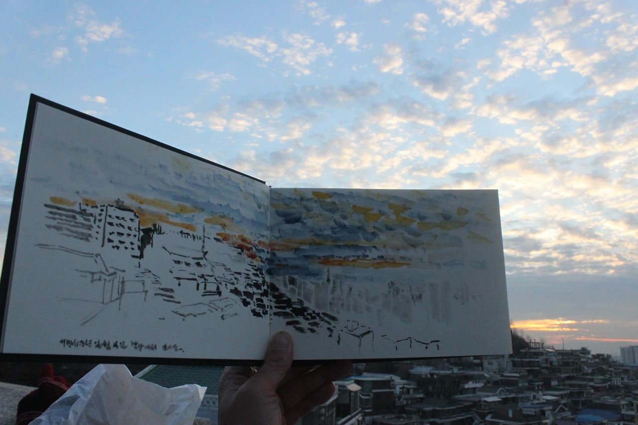 스케치북을 펼치고 먹으로 집들의 그림자를 찍어대다 그 화려한 빛의 색을 잡아다 화면에 잡아넣기 시작한다. 그림을 그리는 사람이 아니라 사냥꾼이 되어 그 아름다움을 조금이라도 넣지 못해 안달 난 사람인양 그 아름다움의 살점 한 점이라도 얻으려 애쓴다.