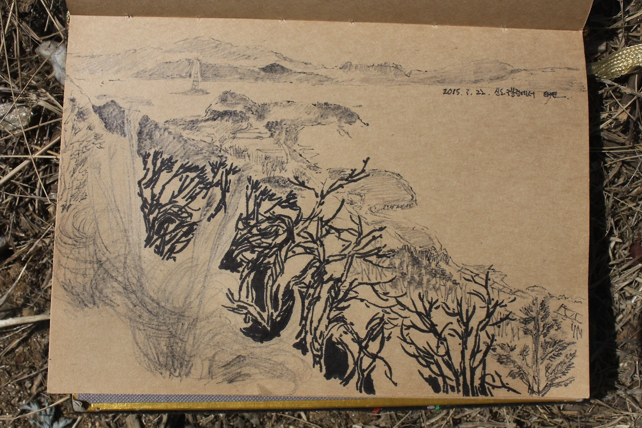 '구봉정'에 도착하니 하룻밤을 지새운 아이와 삼촌들이 구봉정을 정리하고 있었고 나는 전에 그린 곳과 반대편을 스케치하고, 구봉산 정상을 향해 달려가기 시작했다. 구봉산 정상에서의 전망은 구봉정보다 아쉽지만 아직 나무들이 옷을 입지 않아 사이사이 바다의 조망들이 훨씬 시원하게 보였다.