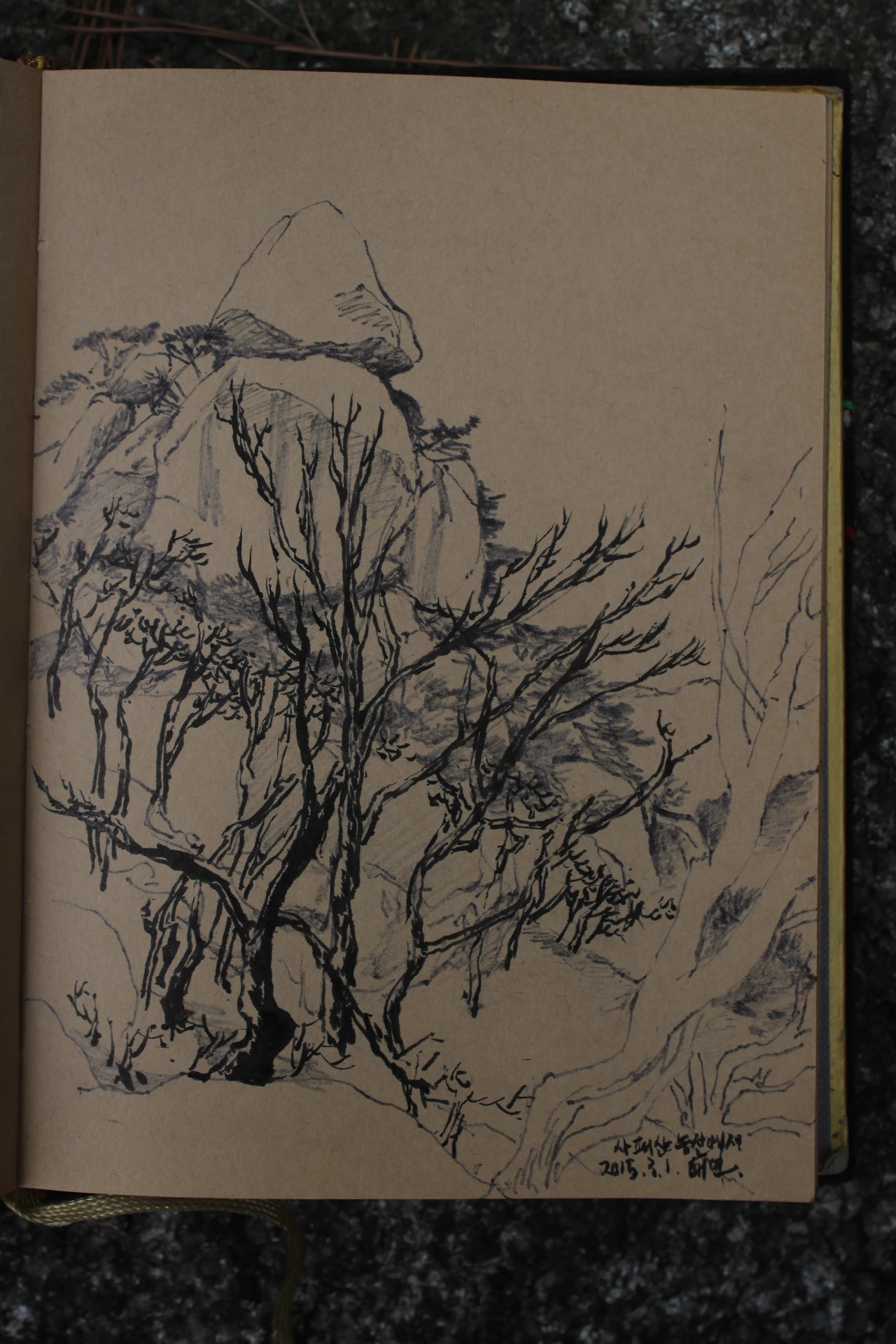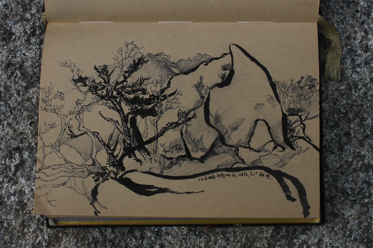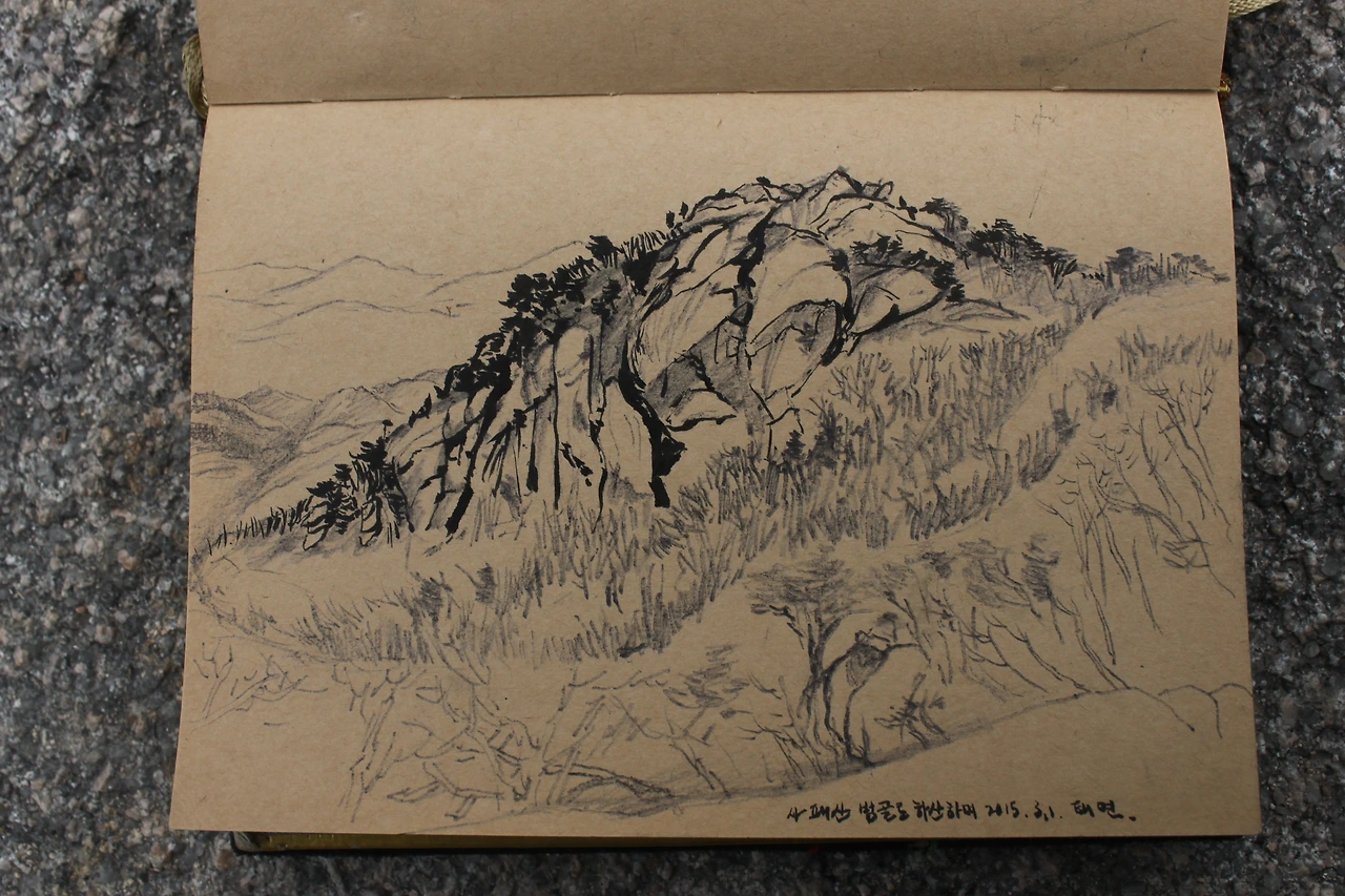 열심히 오르고 오르다 사패 능선에 접어 들어 바위의 모습을 보고 펜을 꺼내 들었다. 산악회 버스가 기다린다는 조급함이 없어 조금 여유롭게 스케치했다. 정상으로 올라가니 도봉산 북한산의 모습이 파노라마로 한눈에 보인다.