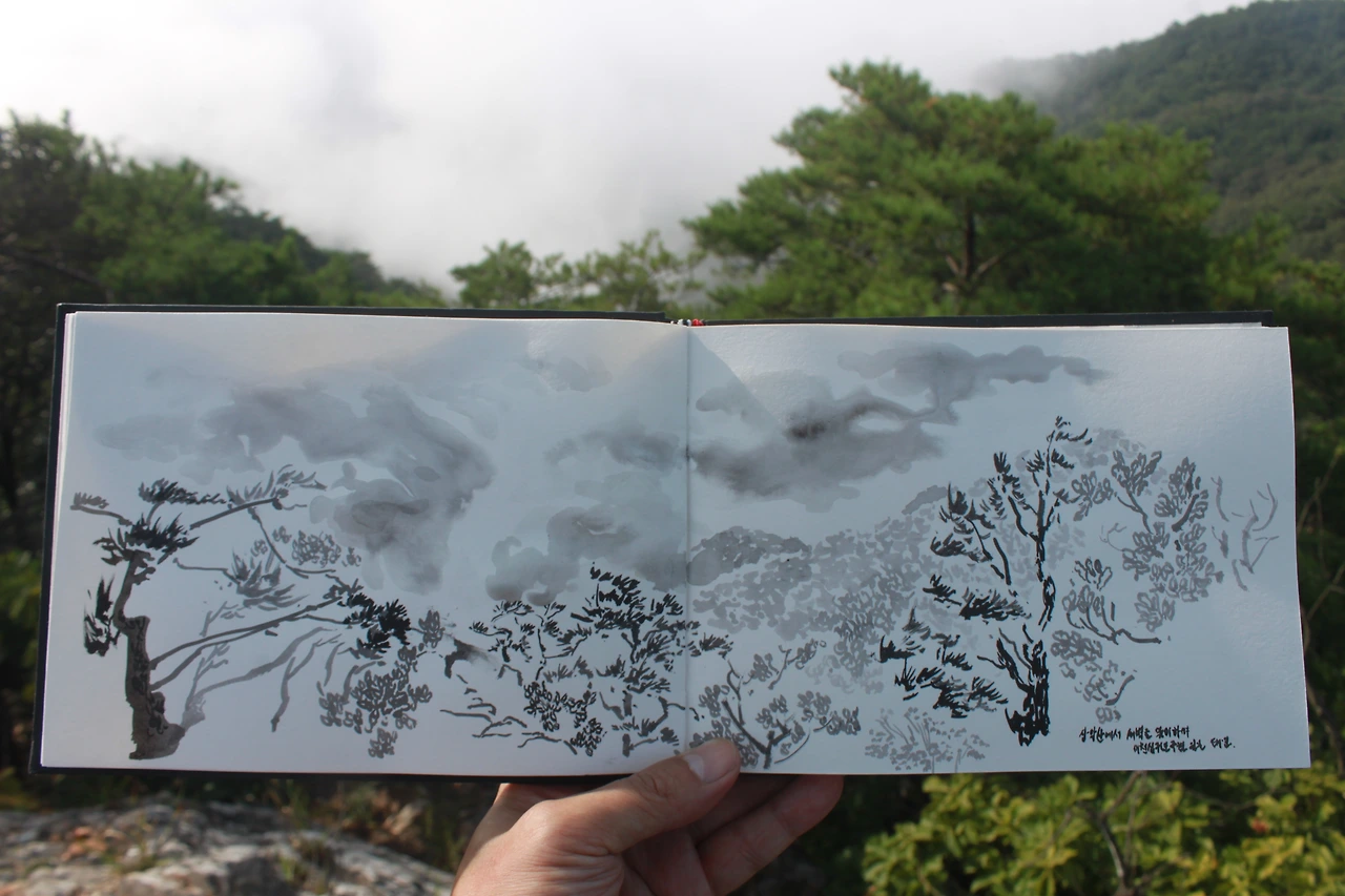 아침을 먹고 구름이 걷히길 기다리다 먹으로 스케치 한 장을 한다.