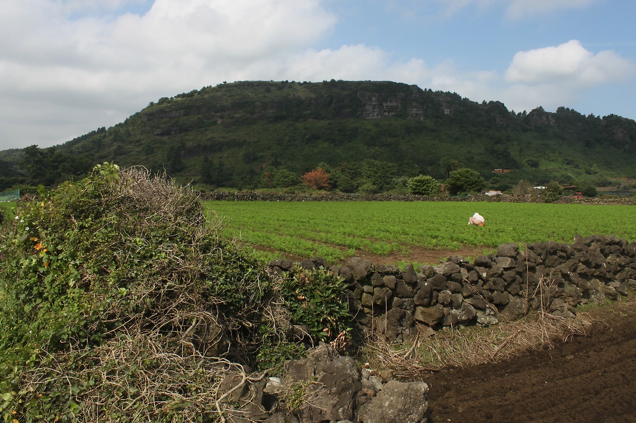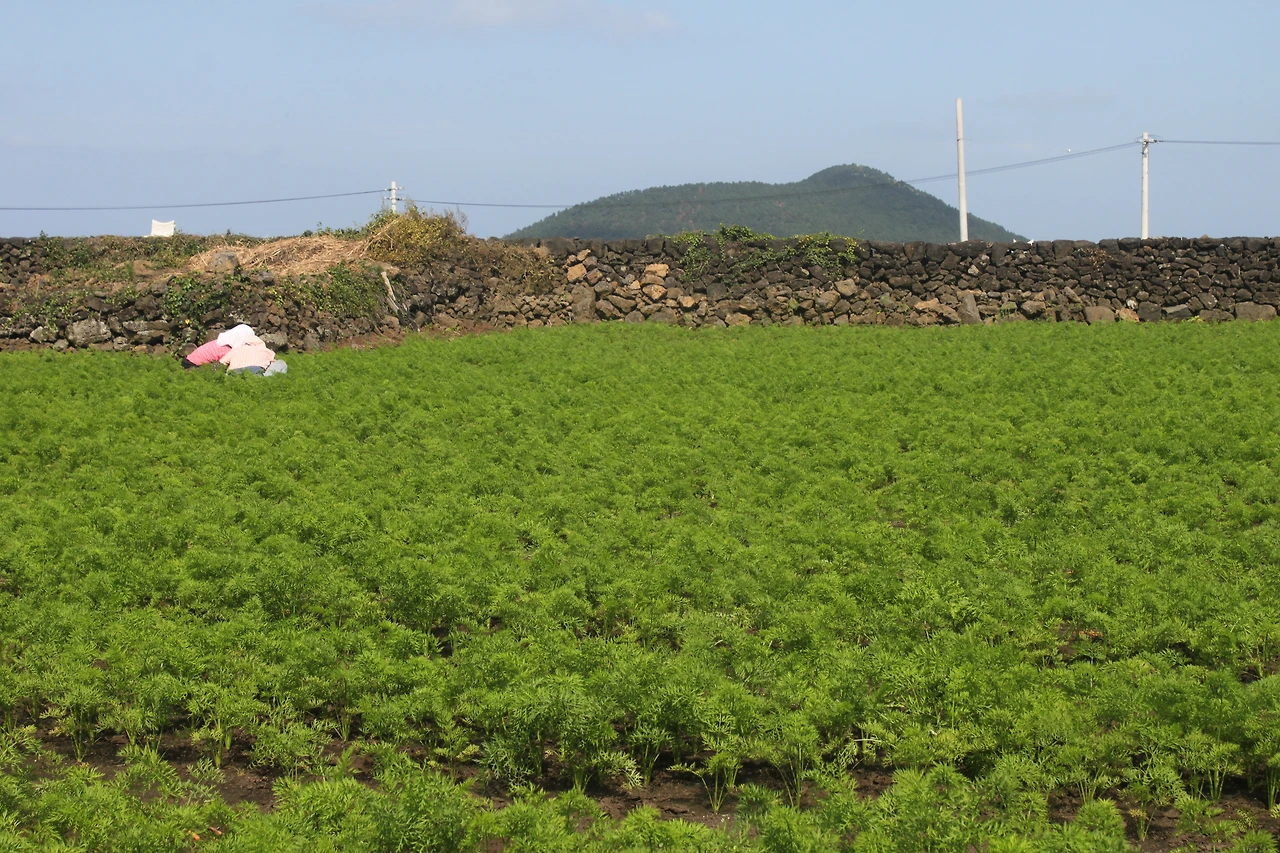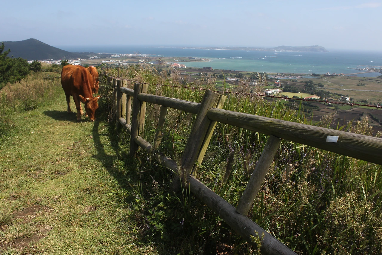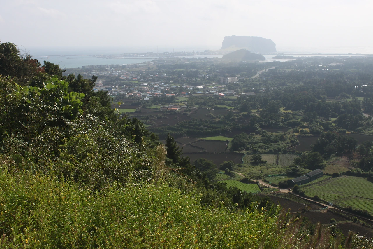 유명한 코스라서 그런지 사람들이 제법 있었다. 그 사람들이 먼저 가길 기다렸다가 천천히 '말미오름'을 올랐다. 오름은 그다지 높지 않았으나 동네 마실 가기 좋은 높이의 편안한 언덕이었다. 그런데 이런 반전이... 그 오름을 돌아 올라서자마자 시원하게 부는 바람의 방향을 보니 '성산 일출봉'이 우뚝 솟아있고 그 방향 쪽으로 드넓게 펼쳐져 있는 검은색과 녹색의 바둑판같은 밭들, 그 풍광들 뒤로 투명해서 멀리서도 바닥이 보이는 듯한 푸른색 바닷물까지 그리고 조금 더 가니 시원하게 보이는 '우도'와 '지미오름'