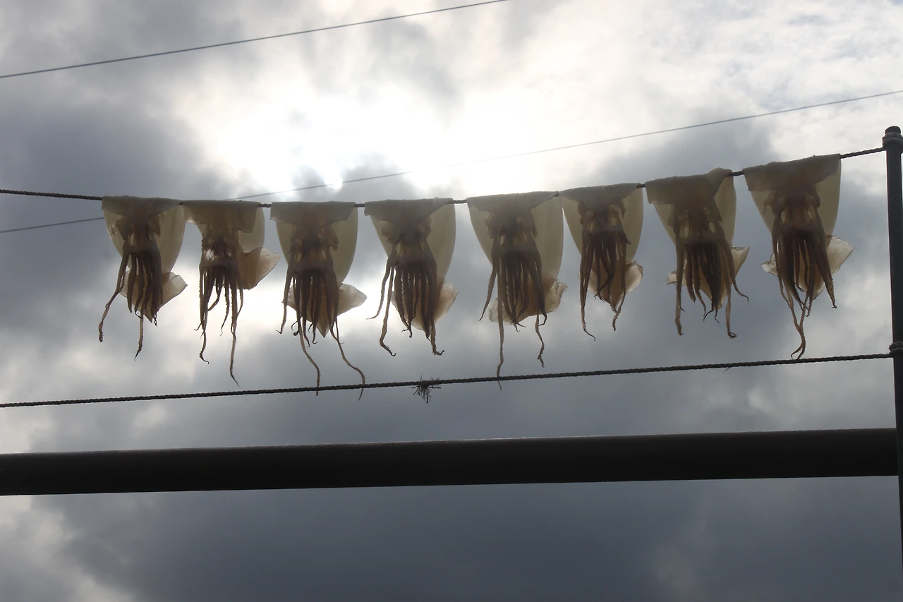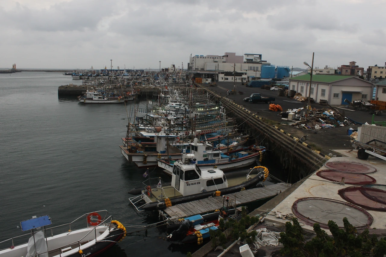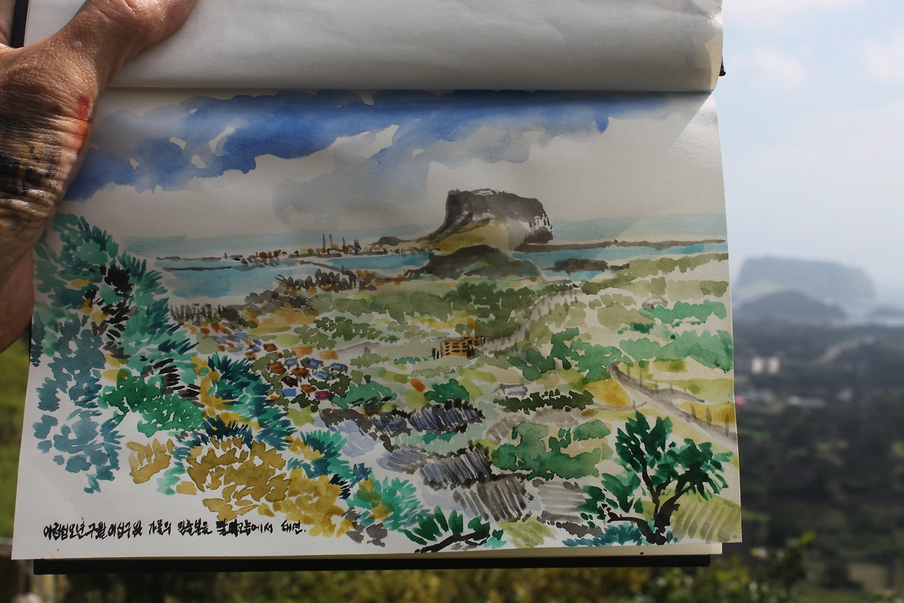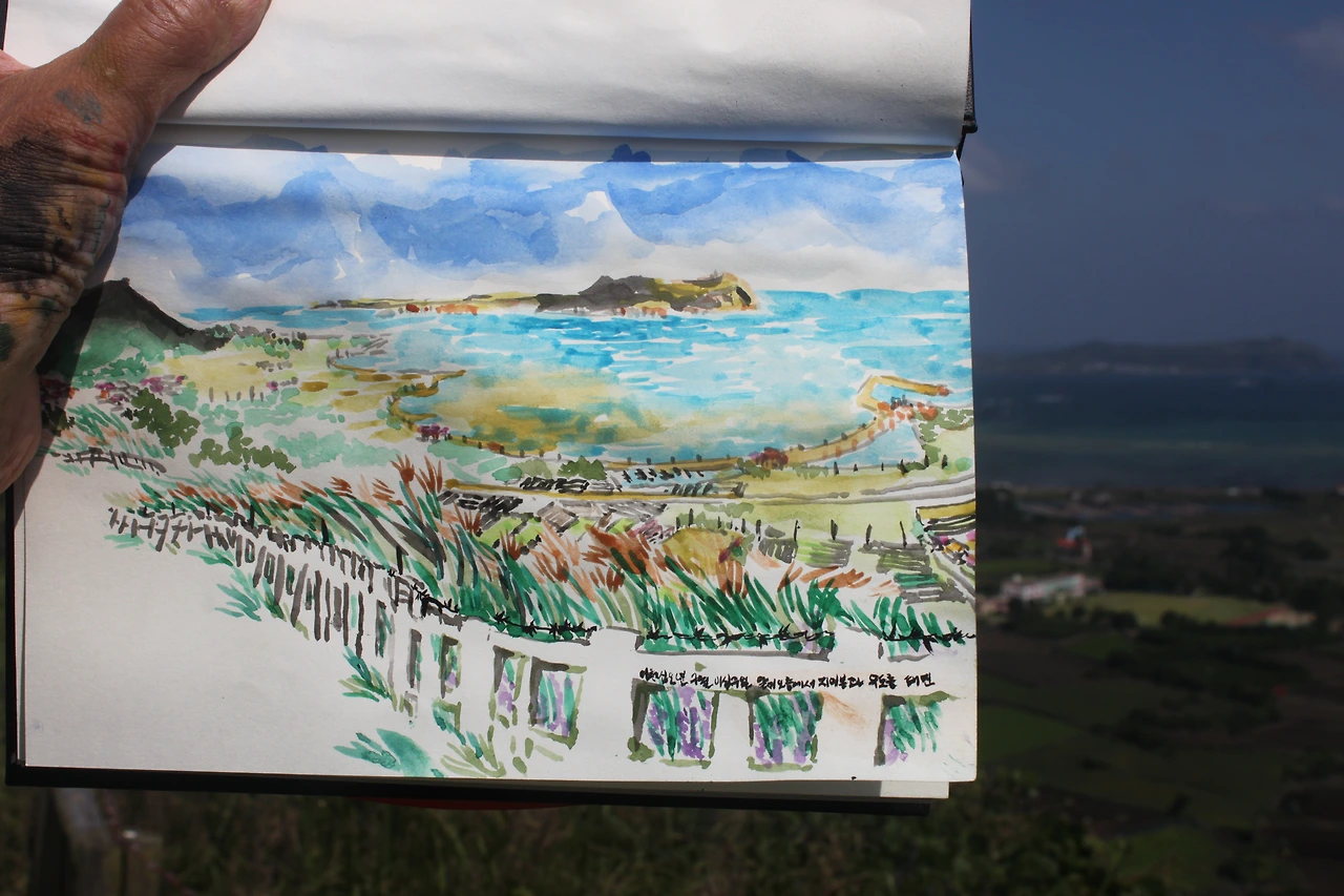 해안도로에는 모래와 제주 특유의 검은 바위들로 멋진 조형미를 이루고 있었고 그런 배경들 하나하나가 달라질 때마다 성산 일출봉과 우도는 다른 느낌처럼 다가왔다. 조금 가다 보니 해안도로가로 오징어를 말려 구워 파는 분도 계셨고, 작은 규모의 간이 횟집도 보였다. 하지만 시간을 그림 그리는데 너무 많이 지체했으므로 조금 서둘러 걸어 본다. 바닷가에는 해조류들이 자연스럽게 늘어져 있고, 해안가로는 줄지어 펜션과 게스트하우스가 나열해 있다. 생각보다 올레길에 대한 파워가 있어 보였다. 이 많은 사람들을 움직이고 정착하게 한 원동력이니..