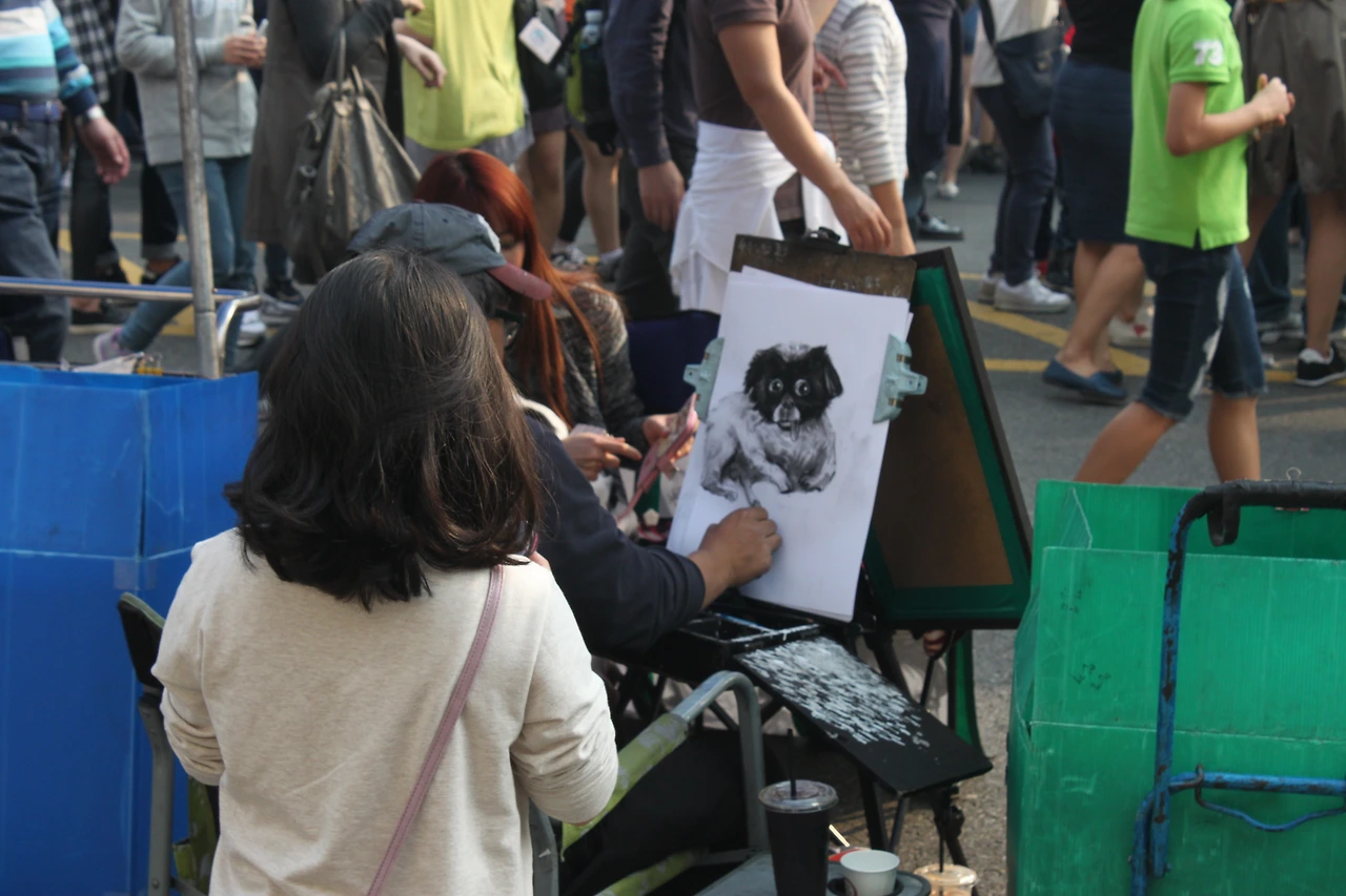 그 줄들을 헤치고 가니 한쪽 편에는 민속 공예품을 파는 곳들이 있었고 그 옆에 사람들의 모습을 그리는 거리의 화가도 자리하고 있었다.