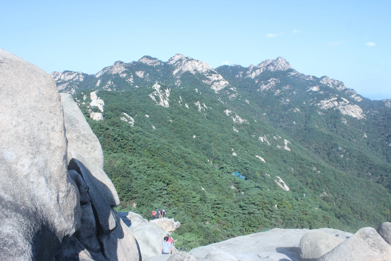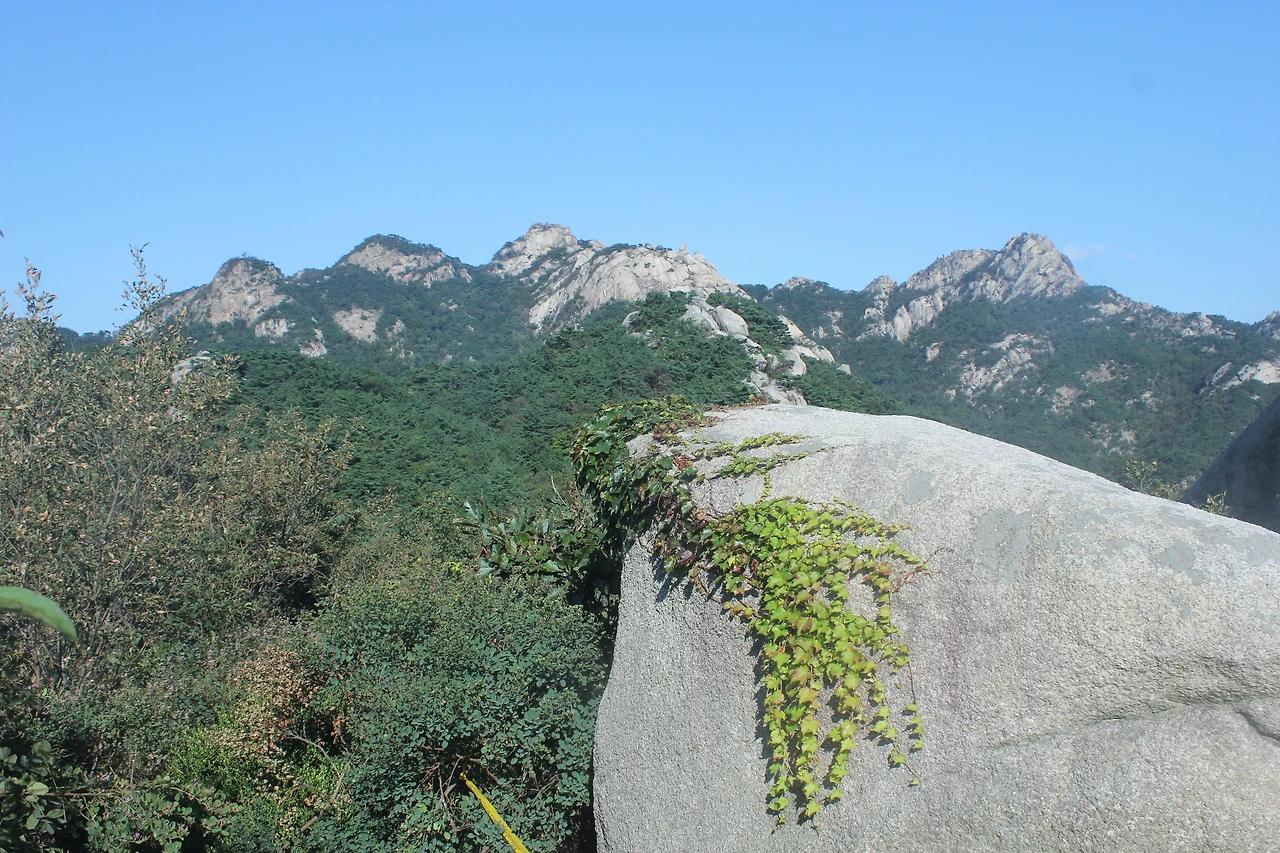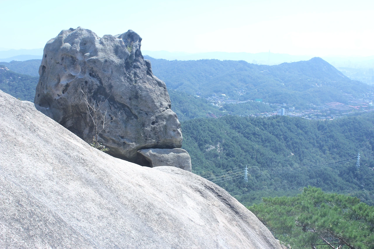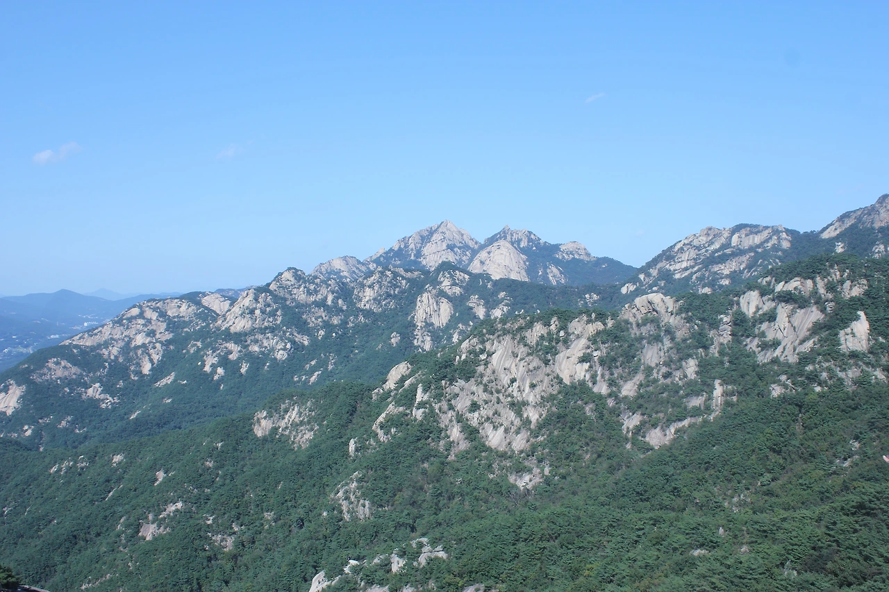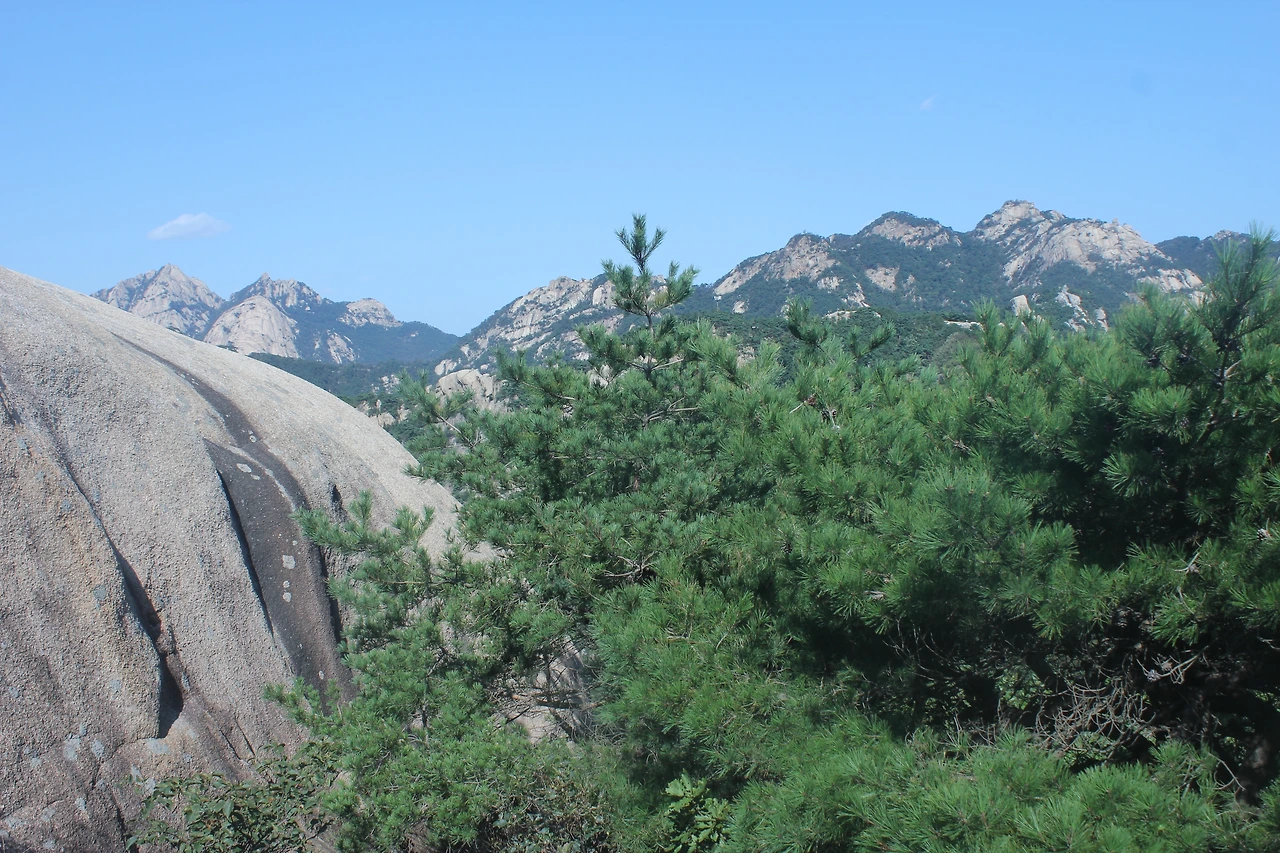산이 흙이 아니라 커다란 바위로 만들어진 듯 바위의 결을 따라 바위의 층층을 따라 걷다 보니 바람이 시원하고 하늘이 높은 게 완연한 가을 하늘의 시작이다.