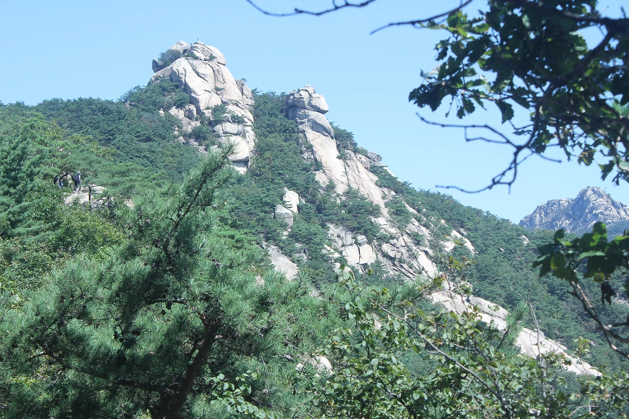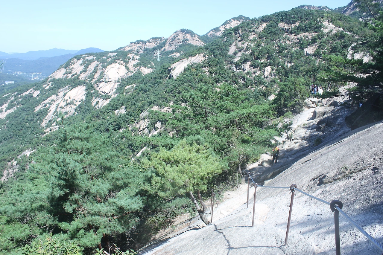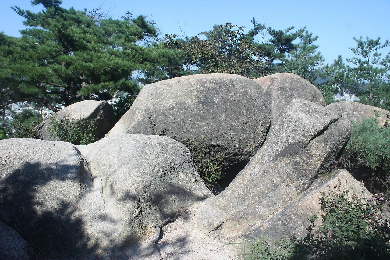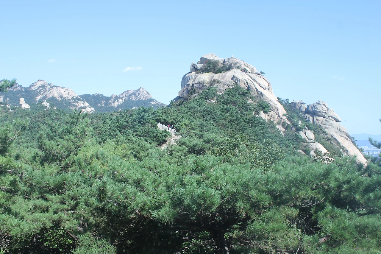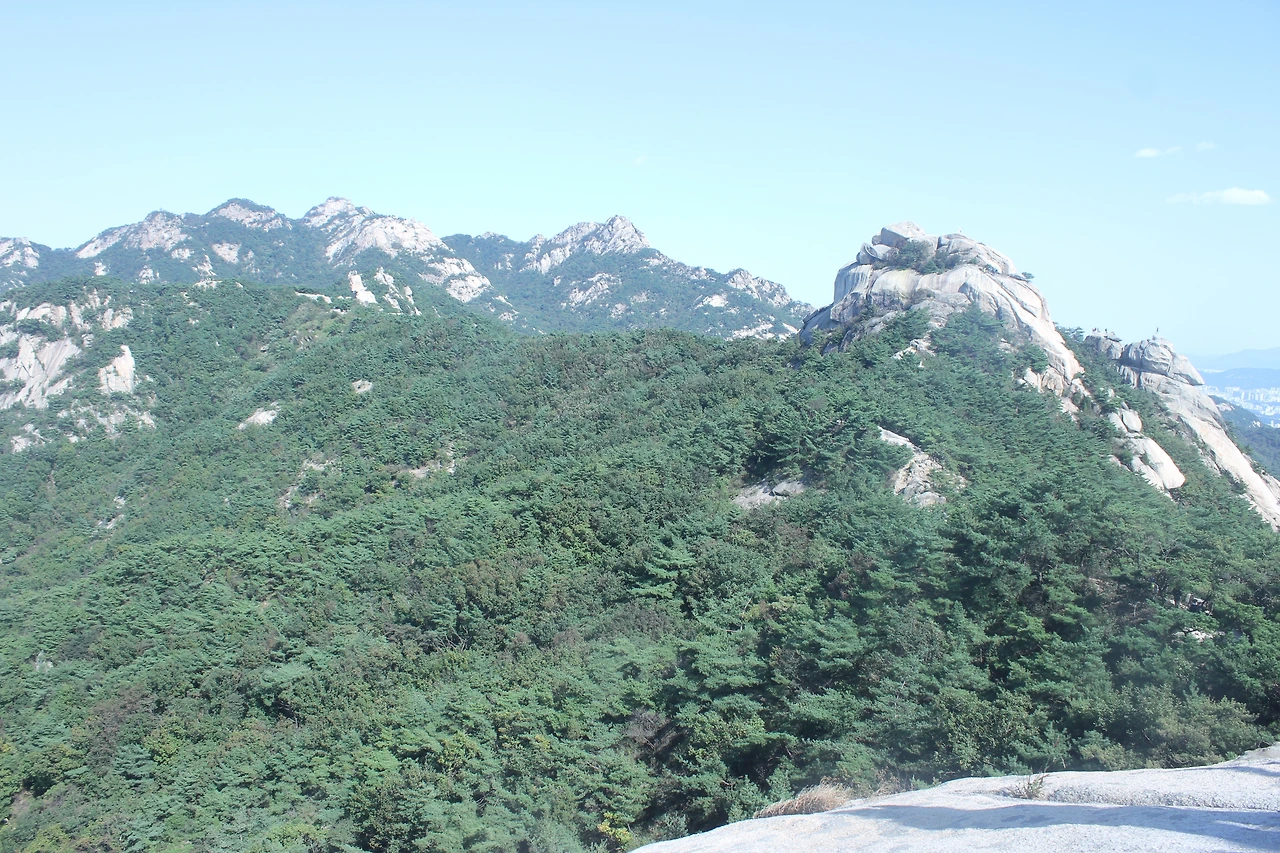 산이 흙이 아니라 커다란 바위로 만들어진 듯 바위의 결을 따라 바위의 층층을 따라 걷다 보니 바람이 시원하고 하늘이 높은 게 완연한 가을 하늘의 시작이다.
