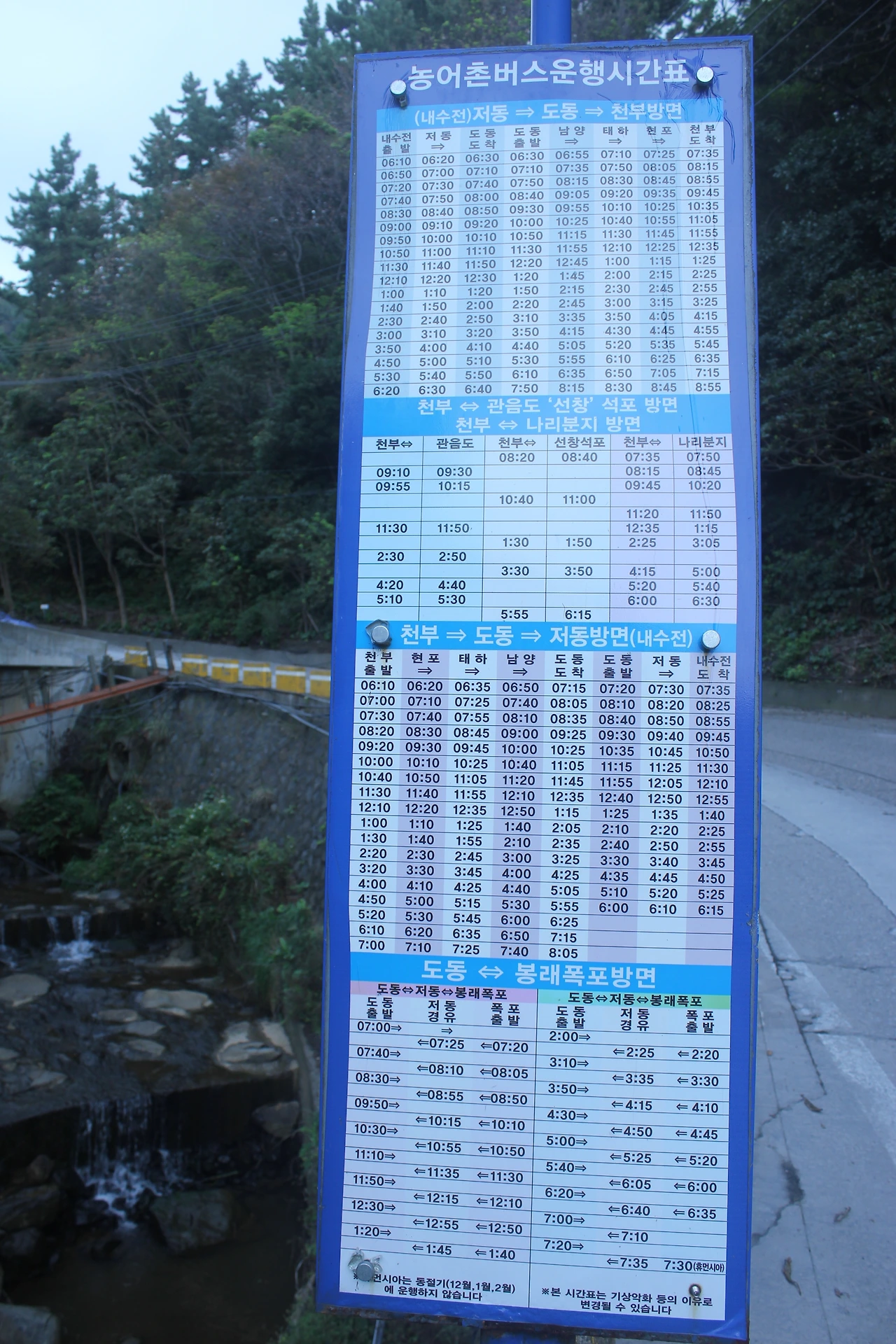 6시 30에 있는 '천부'로 가는 버스를 타고 바로 '사동'으로 향하는 버스로 갈아탄 후 '사동마을회관 정거장'에 내린다.