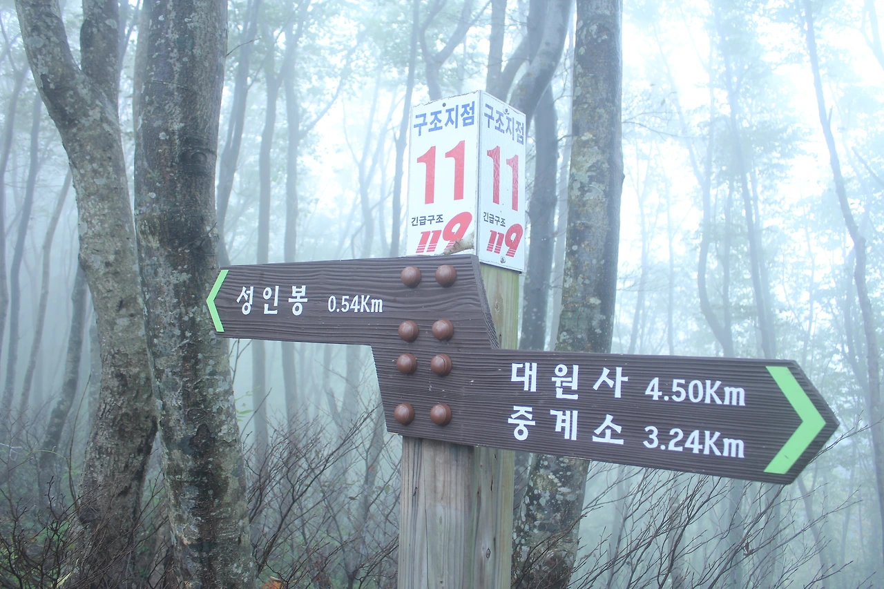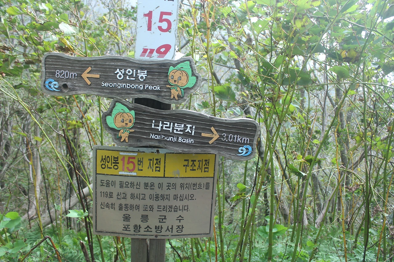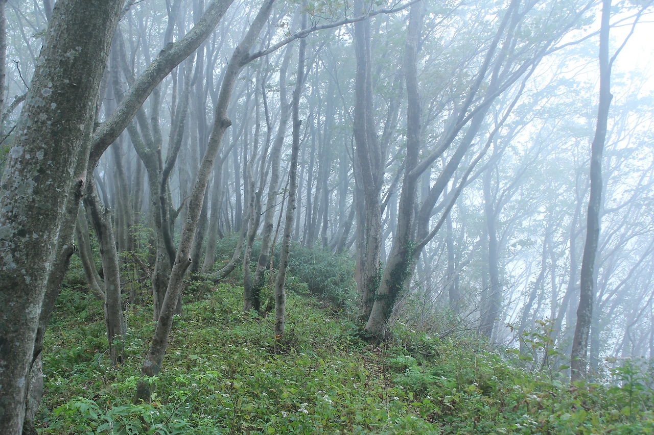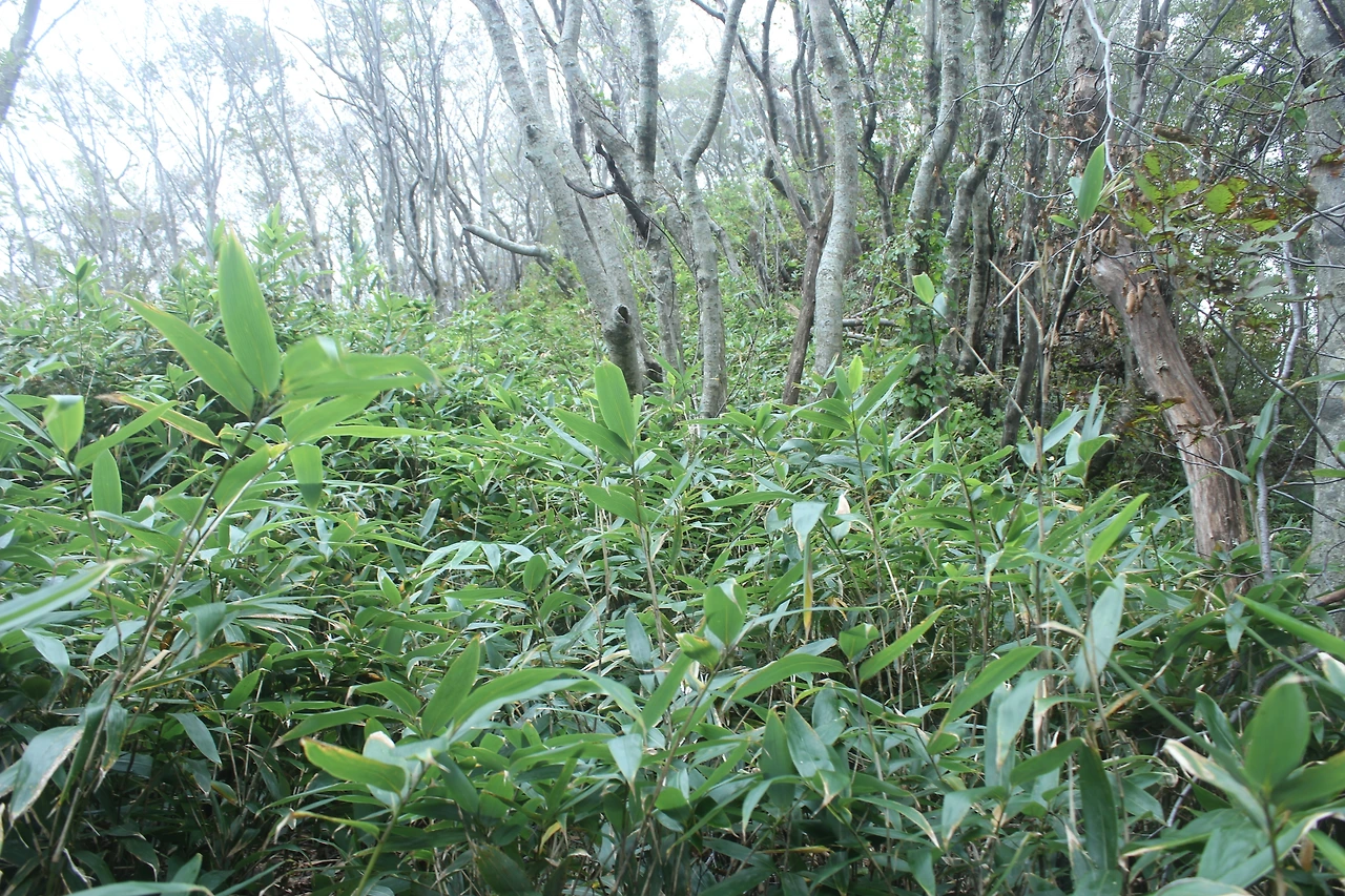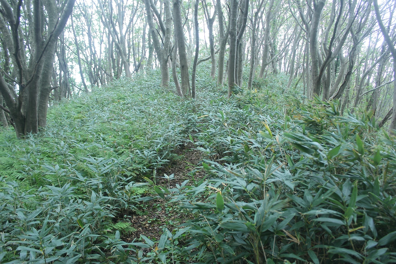 kbs에서 오는 길과 마주치는 삼거리까지 가기 위해 성인봉 방향으로 내 키보다 더 높은 조릿대를 헤치며 보이지 않는 밀림을 한 시간쯤 달리다 지칠 때쯤 드디어 나타나는 '삼거리', 그곳으로 부터는 정리정돈되어있는 길이라 수월하게 올라간다.