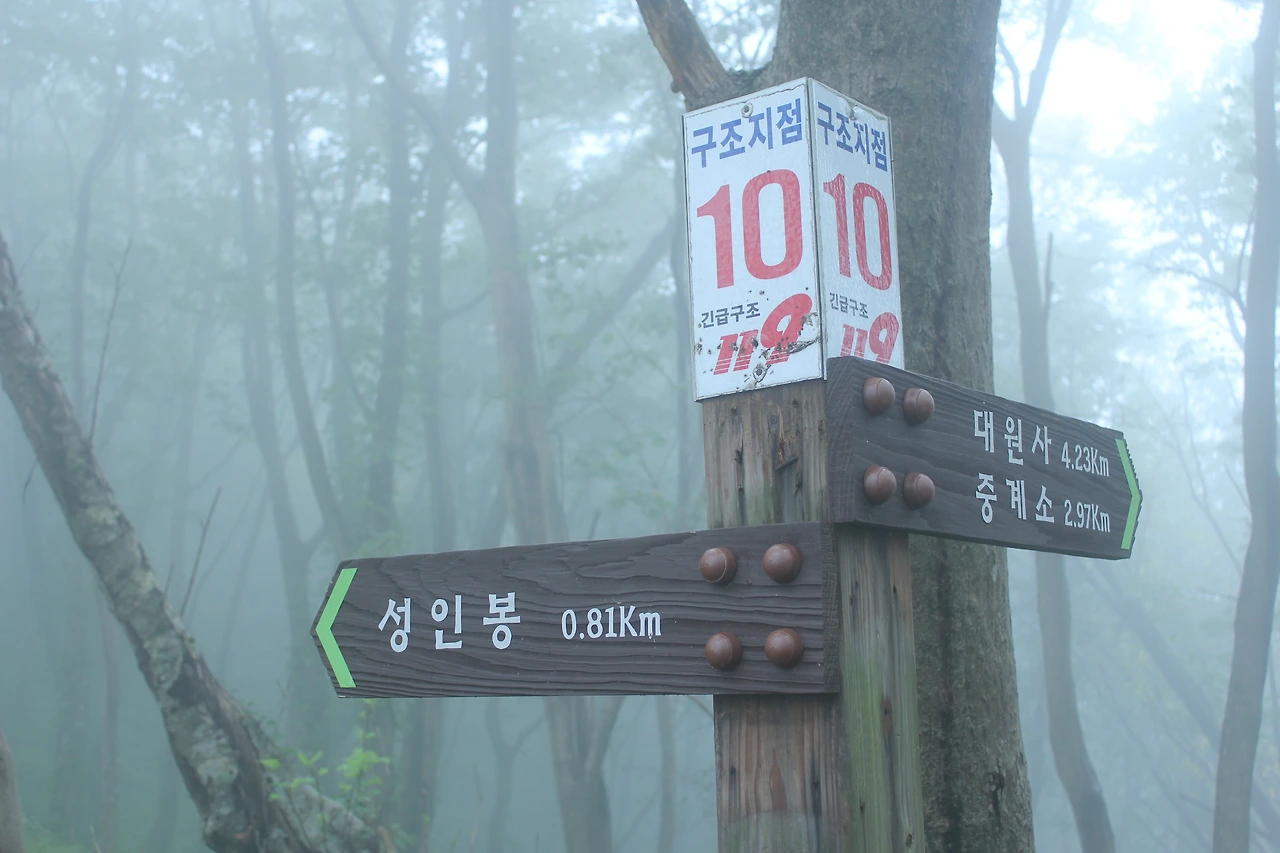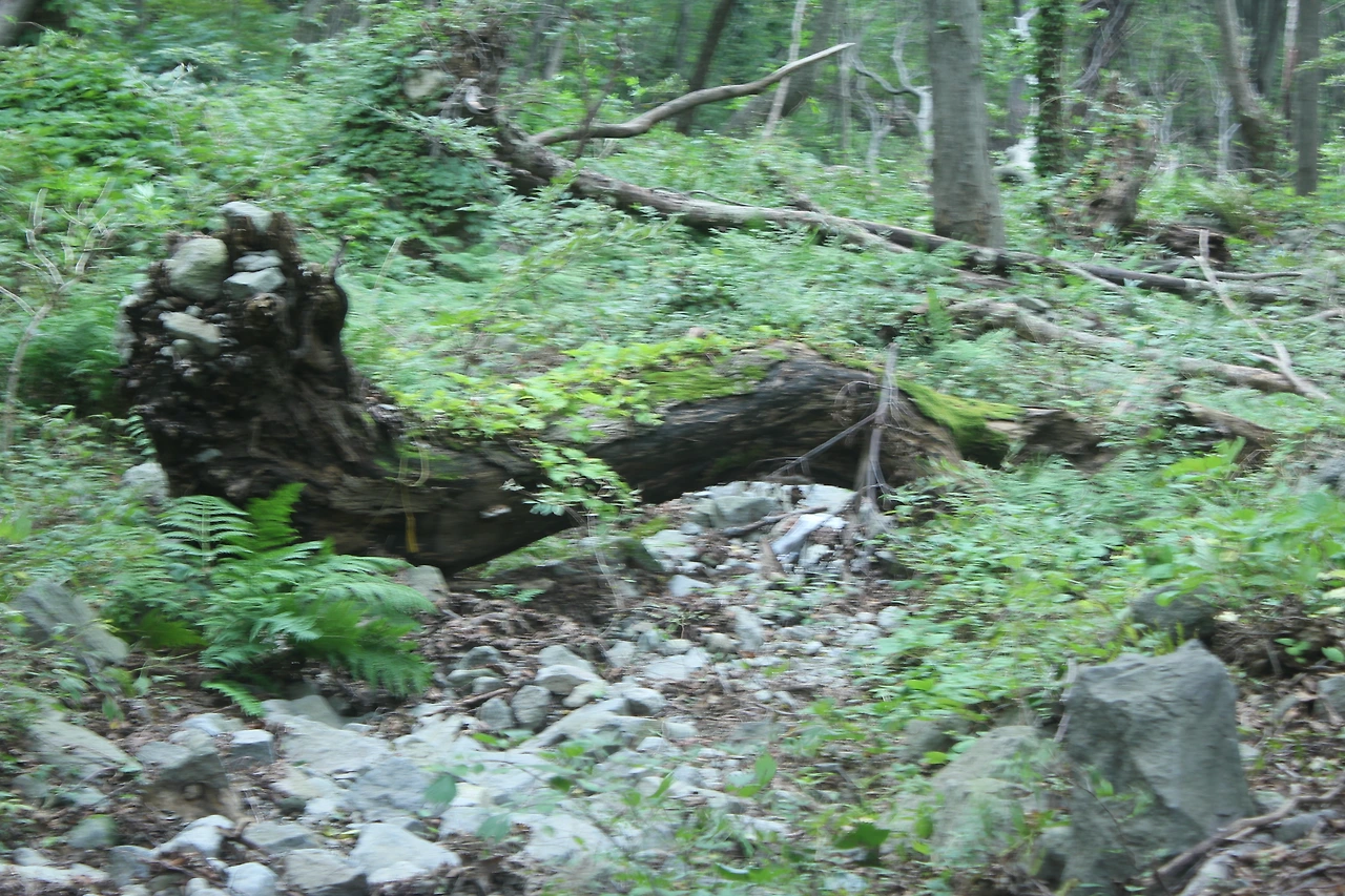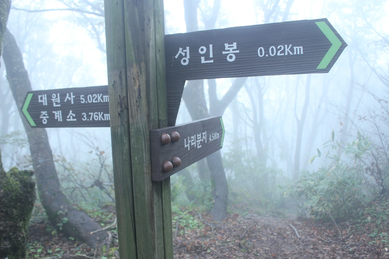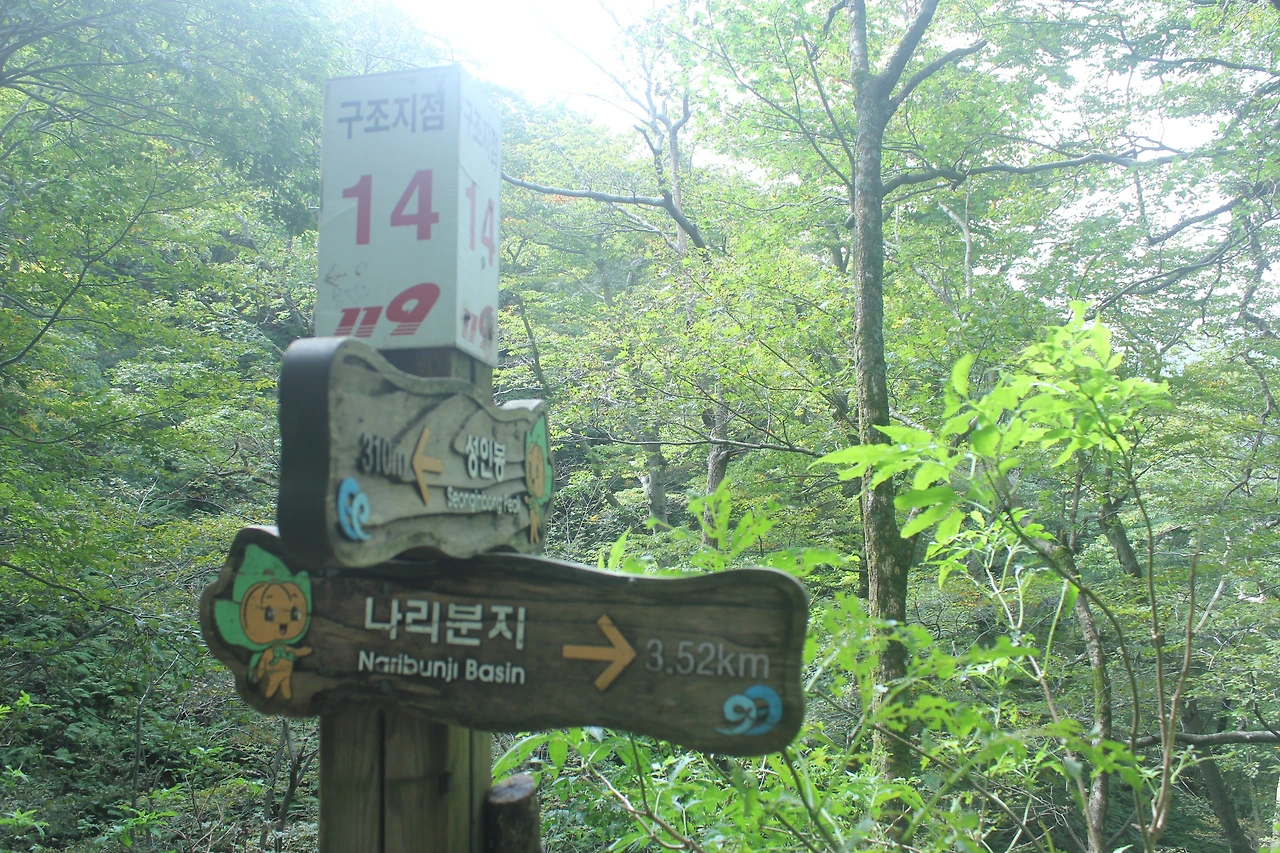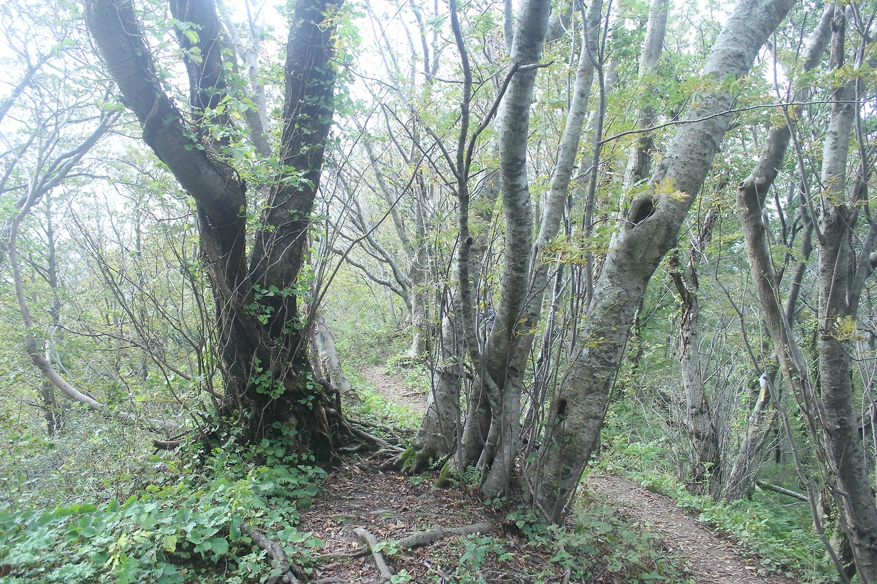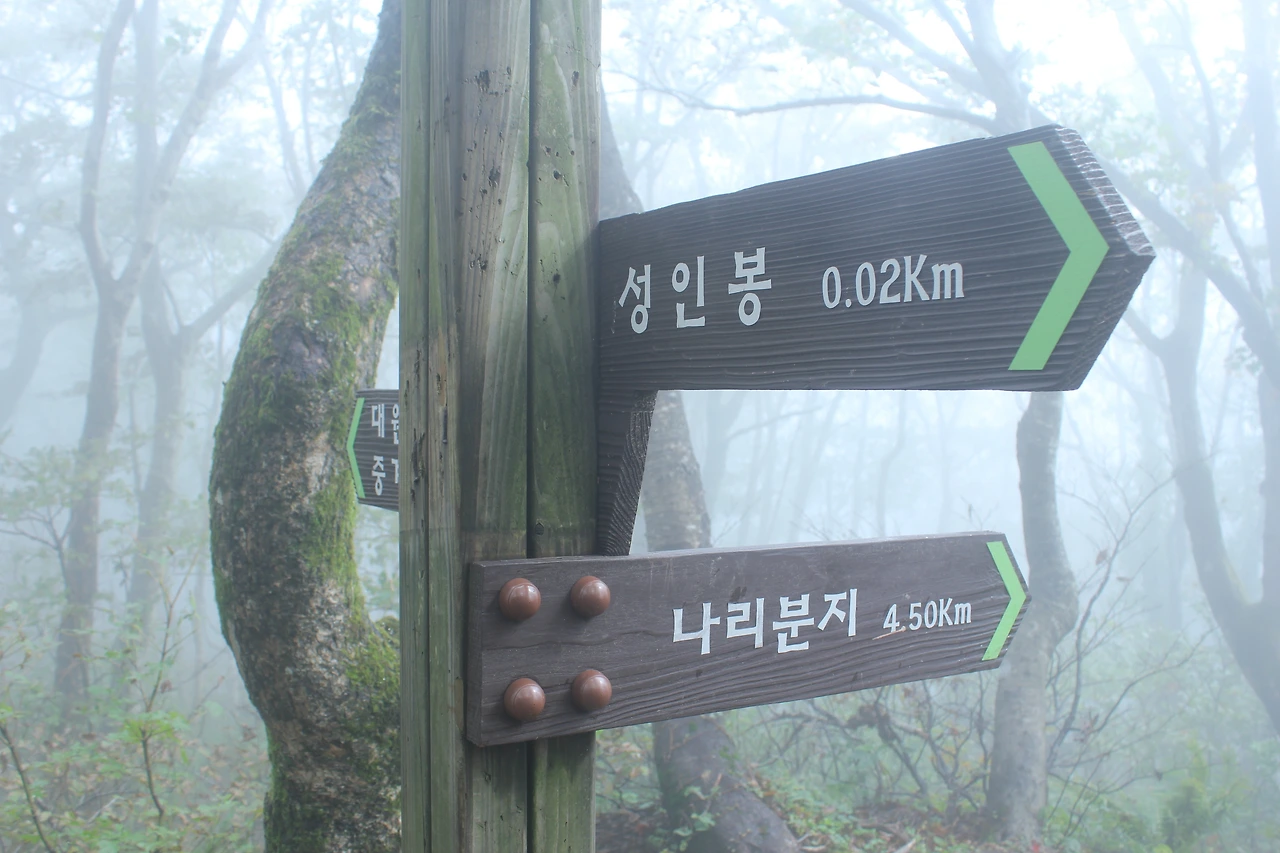 kbs에서 오는 길과 마주치는 삼거리까지 가기 위해 성인봉 방향으로 내 키보다 더 높은 조릿대를 헤치며 보이지 않는 밀림을 한 시간쯤 달리다 지칠 때쯤 드디어 나타나는 '삼거리', 그곳으로 부터는 정리정돈되어있는 길이라 수월하게 올라간다.