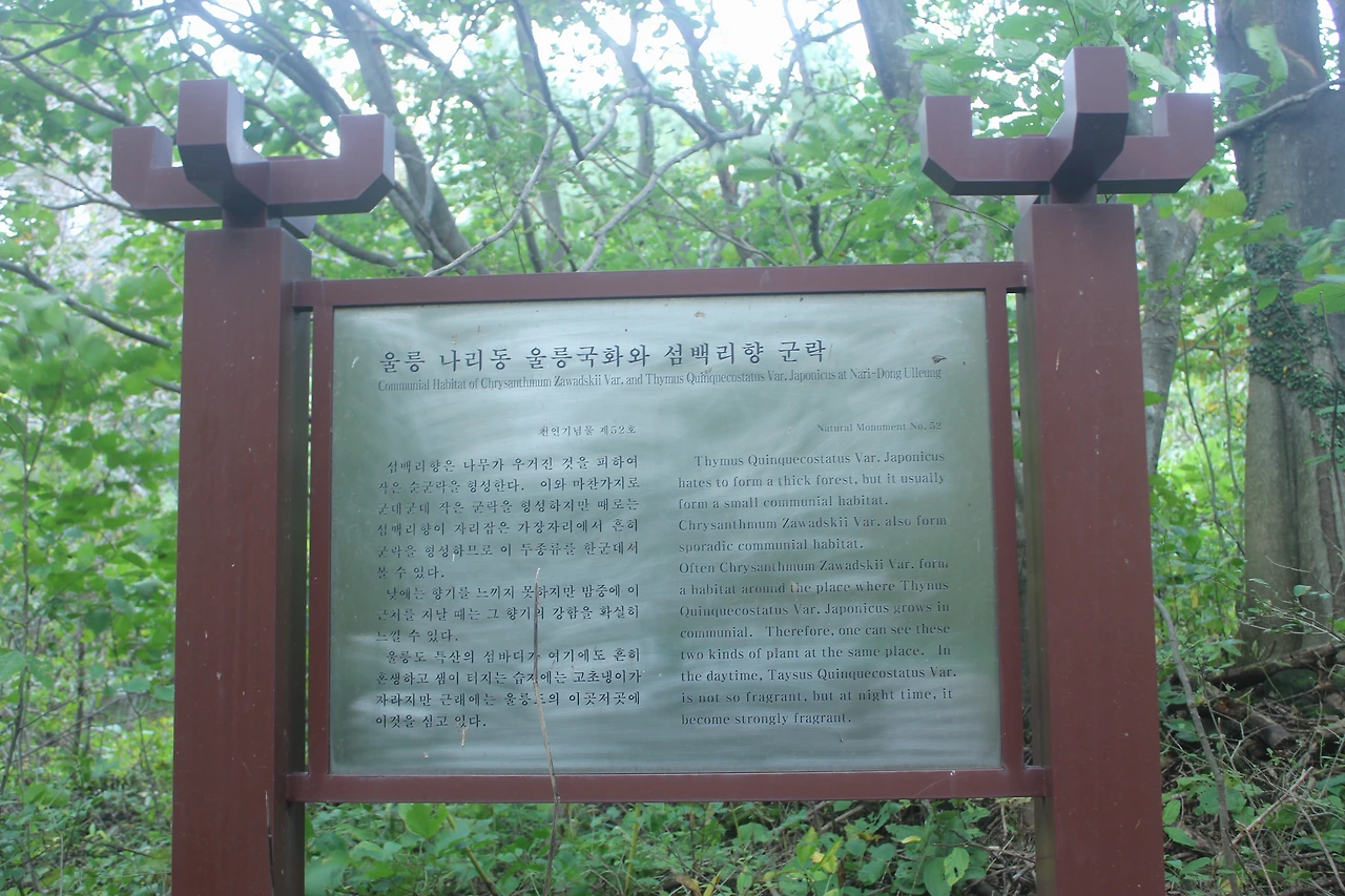 길 중간 천연기념물 제52호인 '울릉국화 자생지 섬백리향 군락지'를 지나며 아름다운 국화의 모습을 만끽하다 나리분지 초입에서 어제 만났던 연극배우 백배커를 만나니 '깃대봉'으로 향한다고 한다.