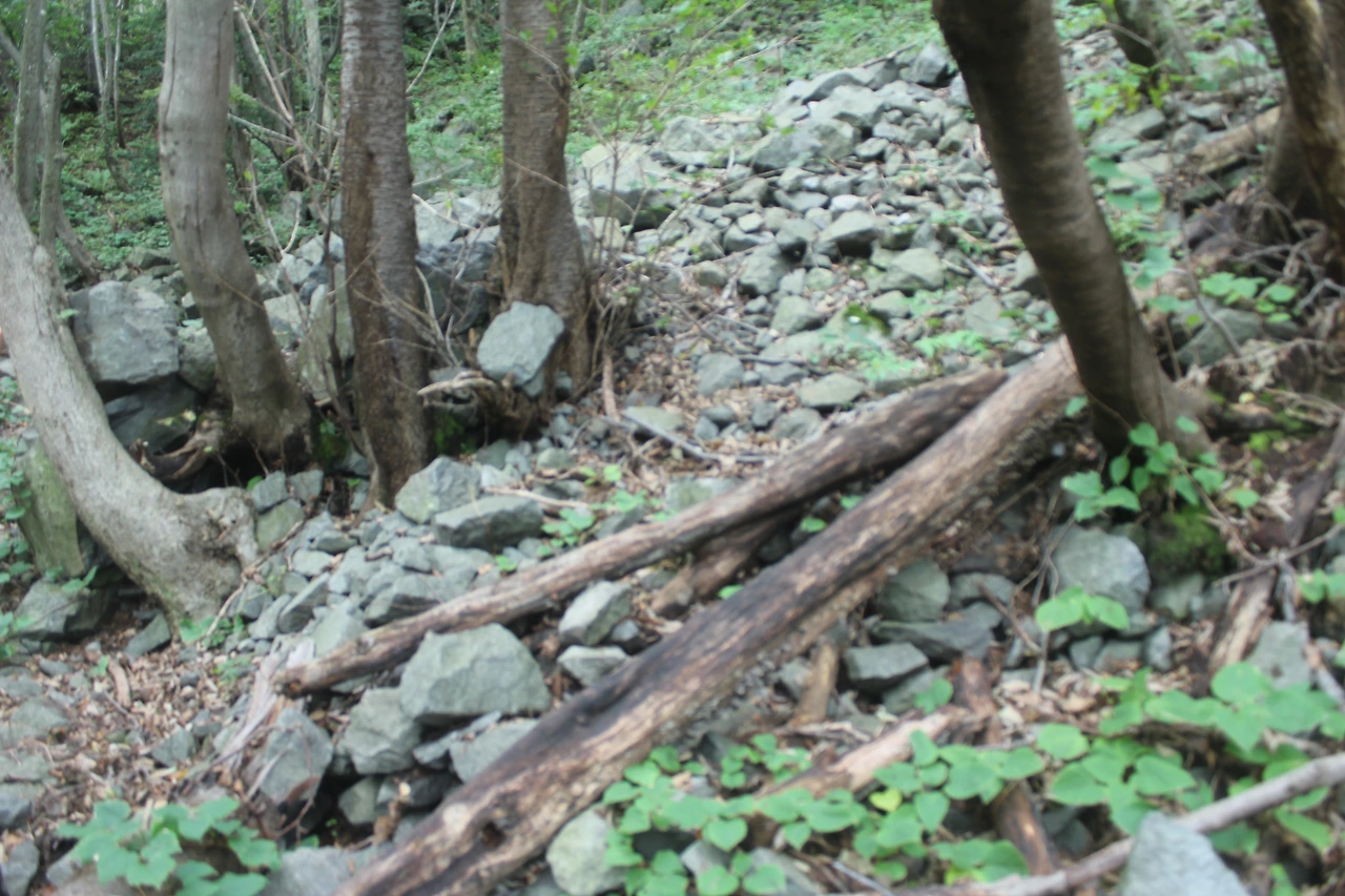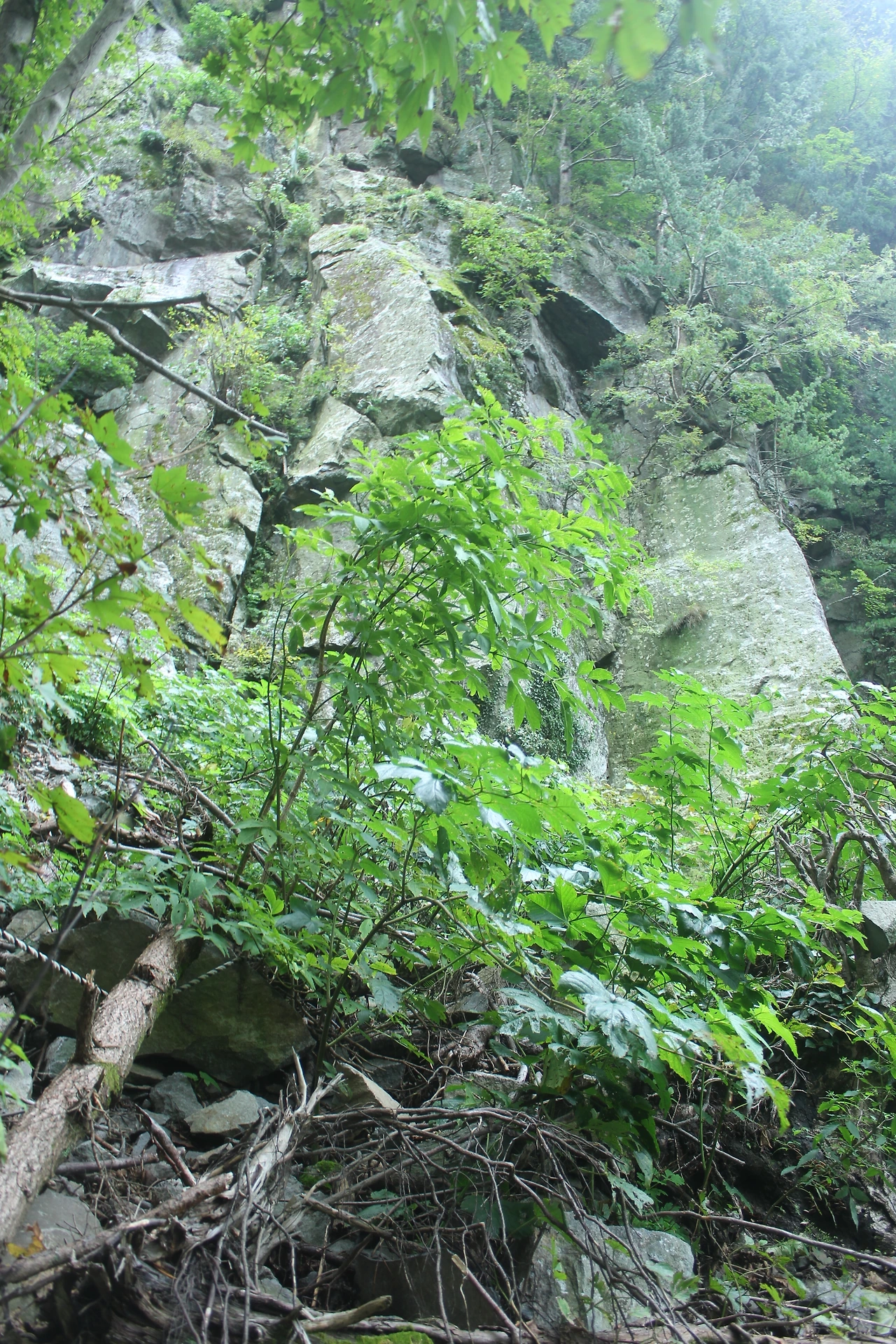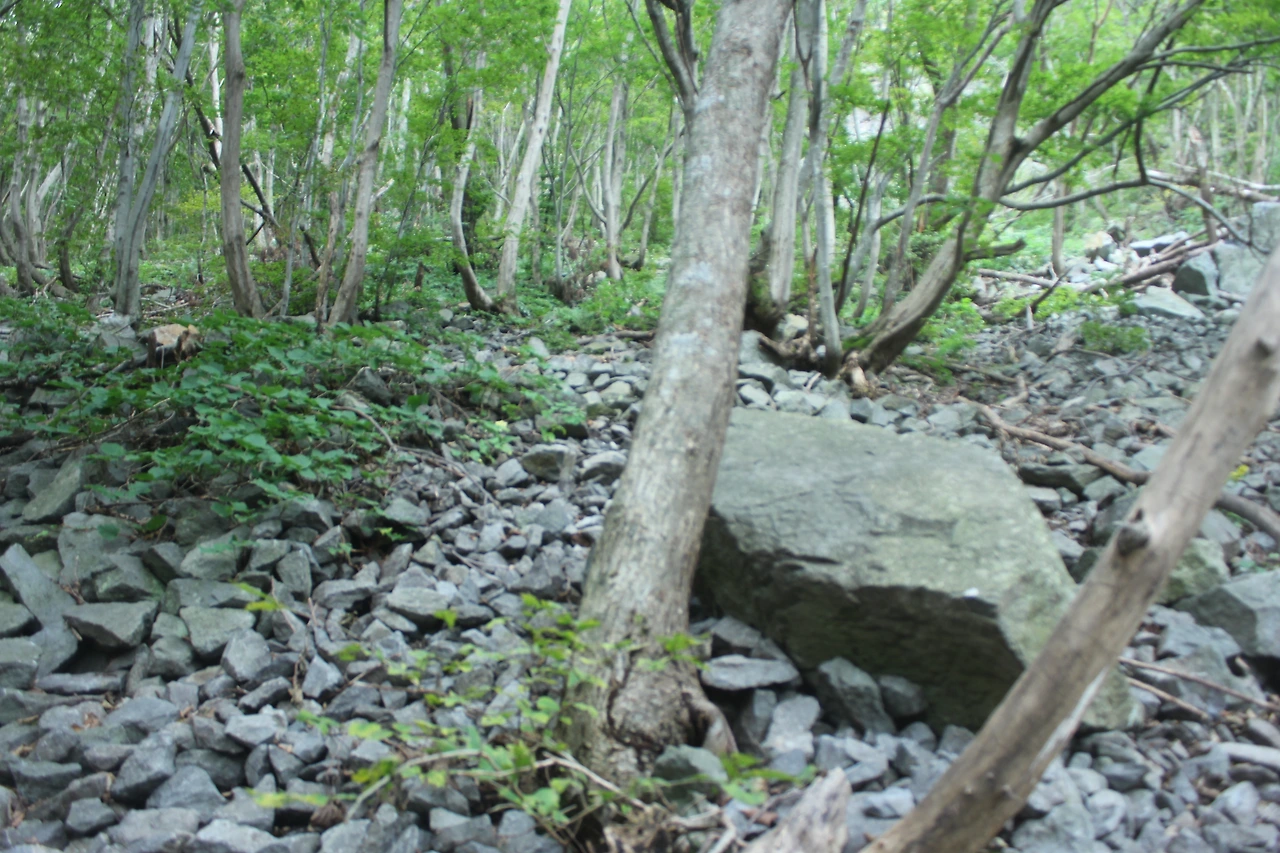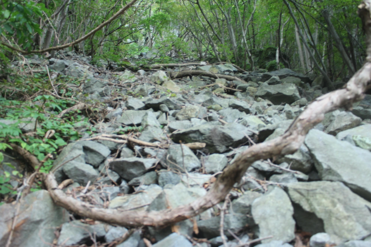 '관모봉'에서 돌들이 해체되어 깨어지면서 흐르고 있다.