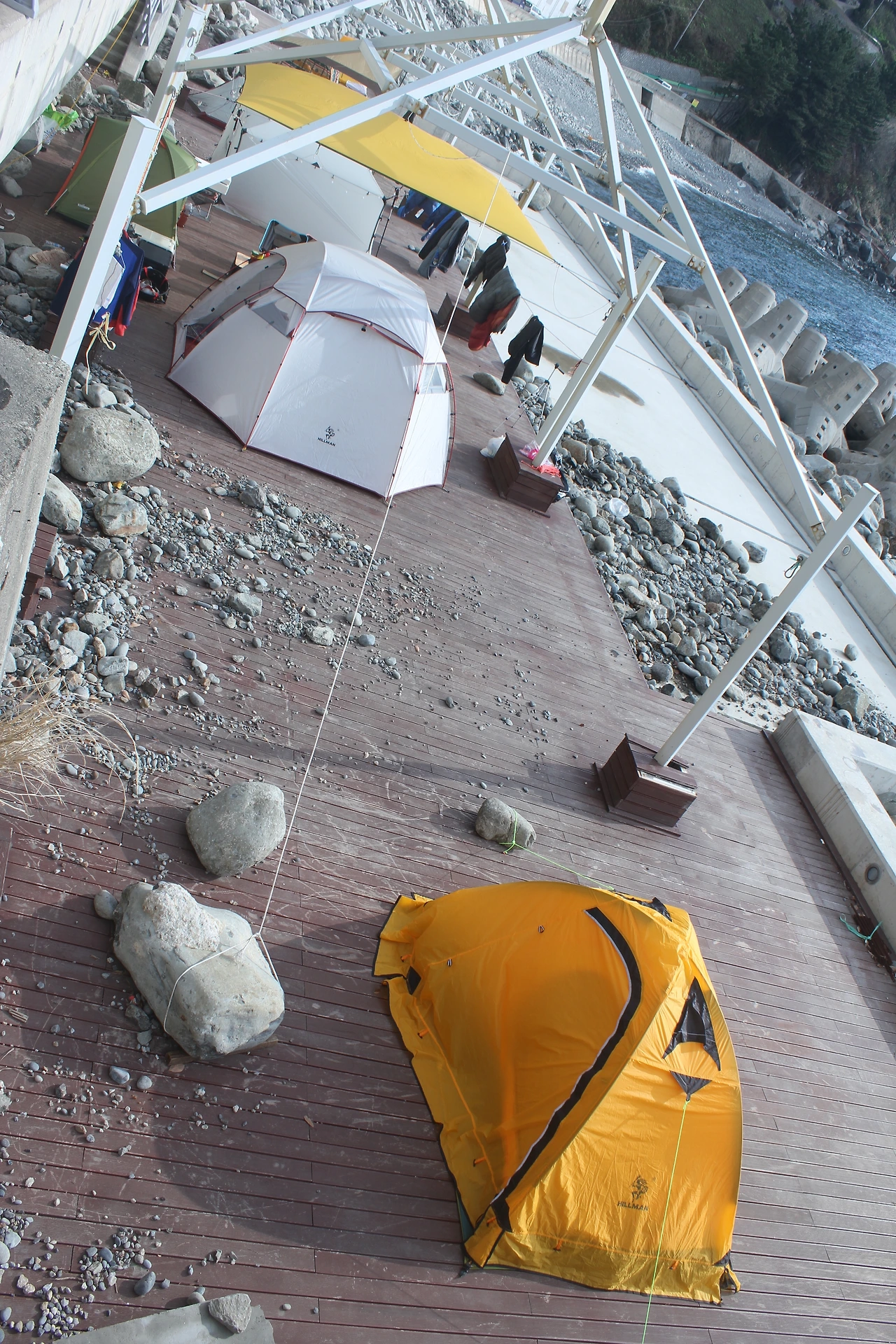 사동 해수욕 풀 데크에 펼쳐놓은 텐트로 오니 낮보다 식구들이 늘은 듯하다.