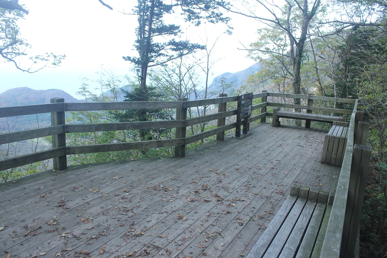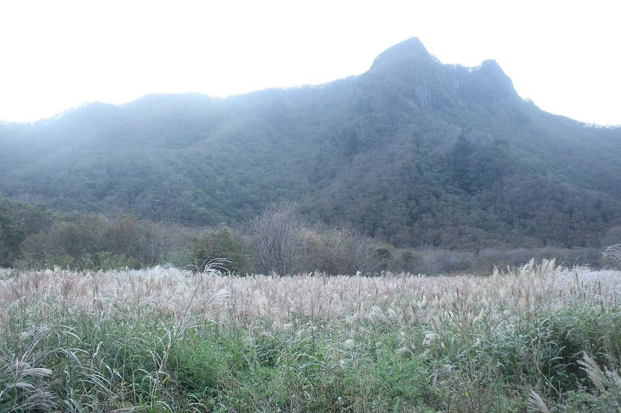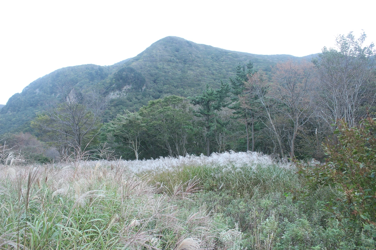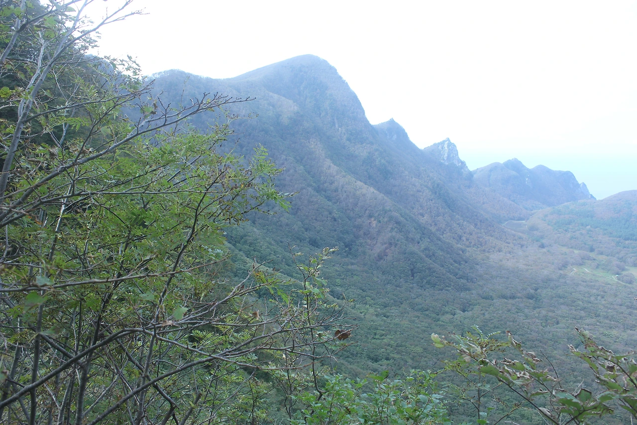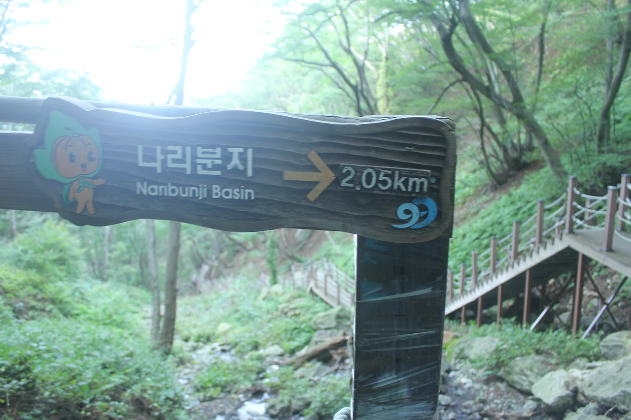 조금 내려가면 있는 '성인수 약수터'는 그냥 지나고 오래된 잘생긴 나무들이 자리 잡은 산길을 한 시간 넘게 내려가다 보니 '깃대봉'과 '나리분지' 그리고 '알봉'과 '송곳산' 이 있는 분지 형태의 아름다운 공간이 마치 우리나라가 아닌 인도네시아 아름다운 섬나라에 와 있는 듯한 착각을 하게 만든다.