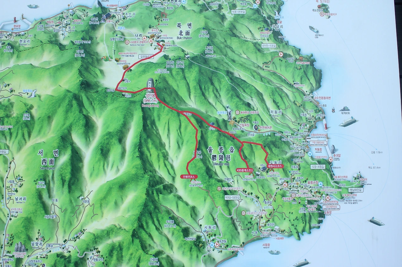새벽같이 일어나 태하에서 있는 첫 버스를 타고 천연기념물 제237호 '사동 흙 비둘기 자생지'가 있는 사동 해변에 베이스를 두고 그곳으로부터 걸어서 kbs 중계소 방면으로 '성인봉'으로 오른다.