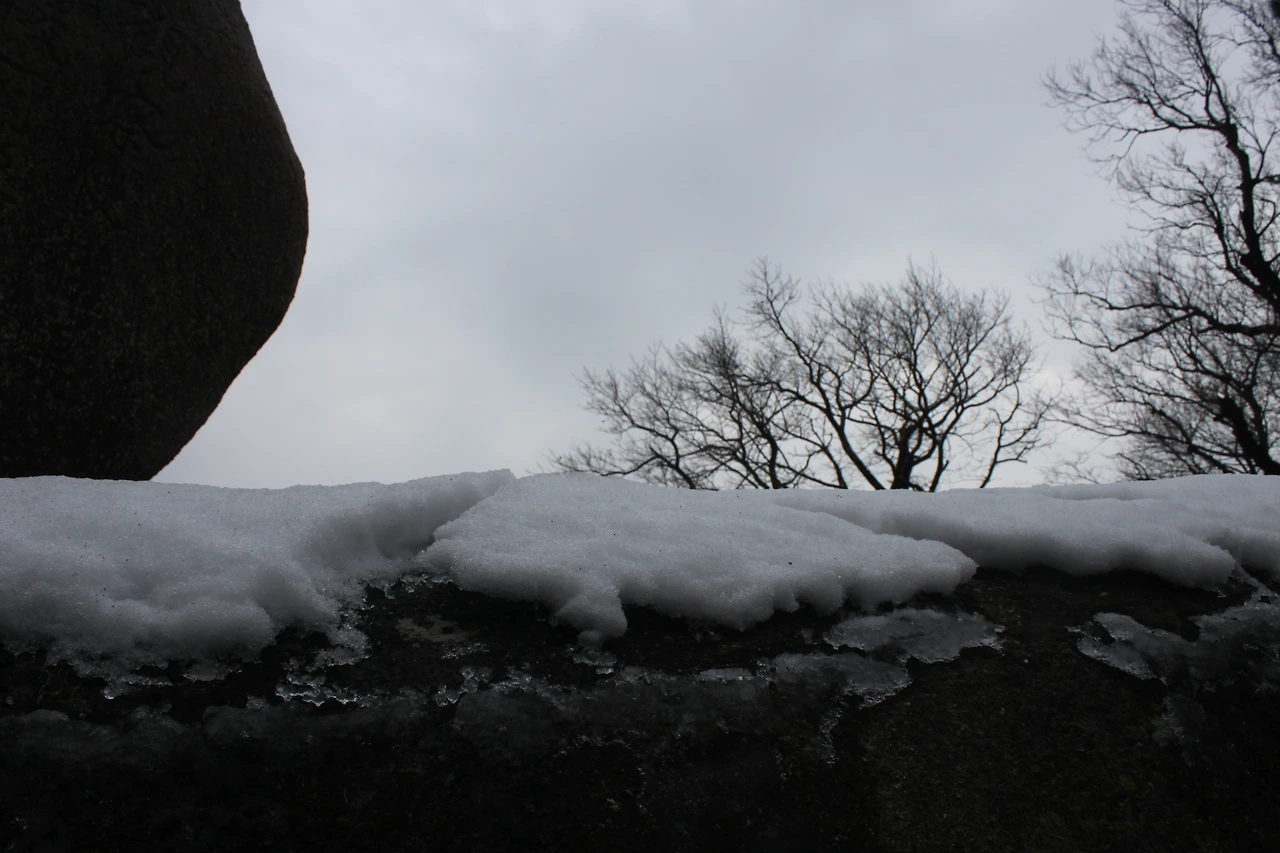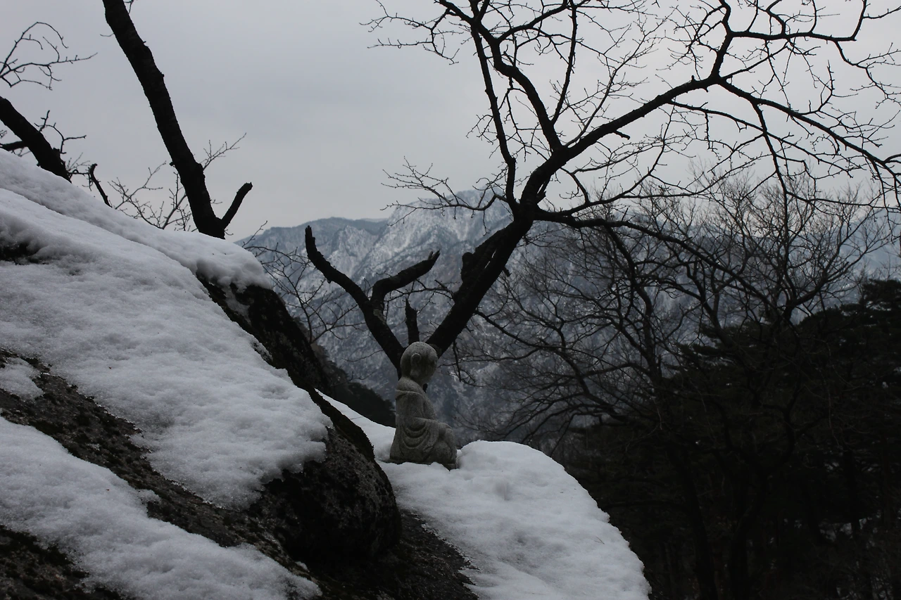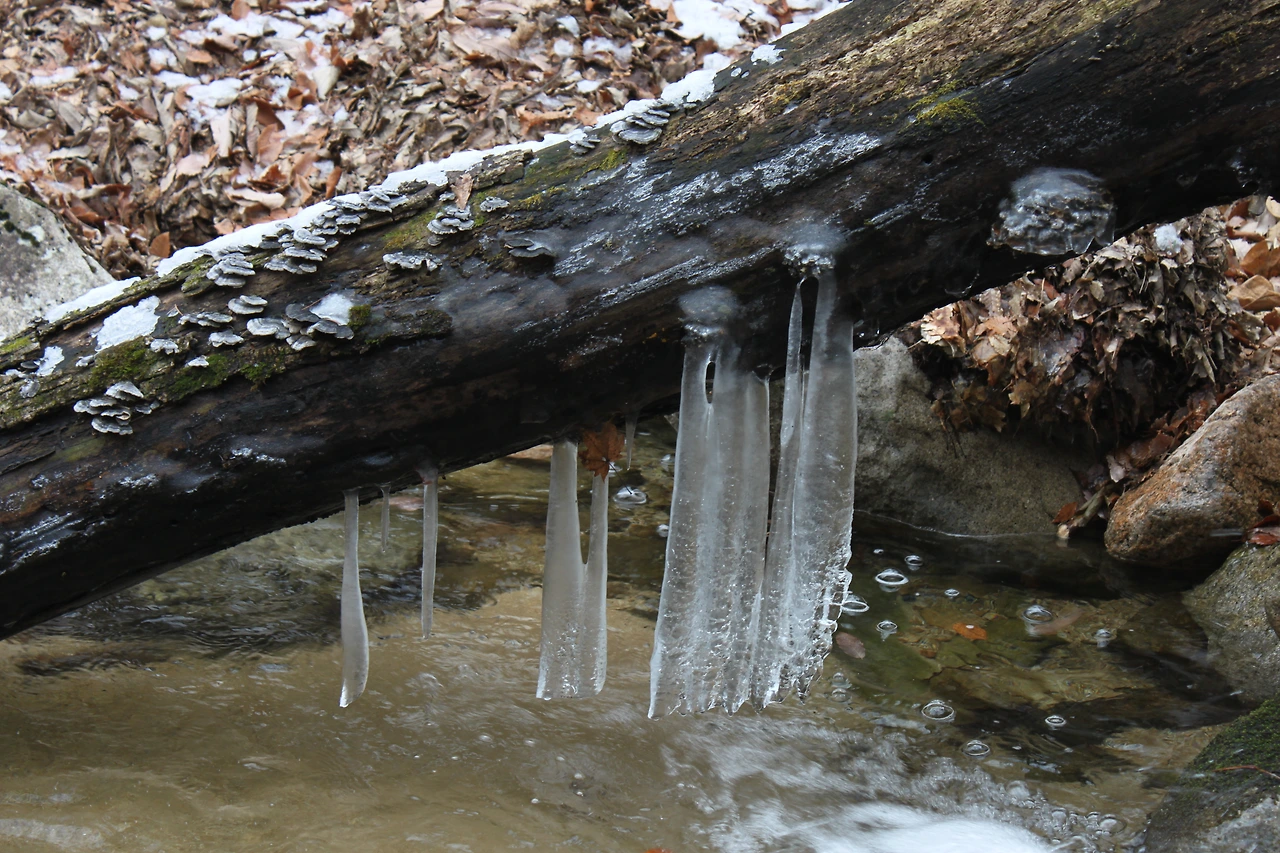 입구에서 멀지 않은 거리로 여유가 있을 것 같았지만 겨울 설산의 위험함을 익히 알고 있기에 조심조심 가려했는데 산은 역시 만인에게 평등하다. 오랜만에 간 설산은 나에게 기대에 부응하는 엉덩방아를 선물하셨고 더욱더 조심히 오르기 시작했다. 산의 초입은 아직 늦가을의 산처럼 바닥에 쌓인 낙엽과 시원한 계곡물의 존재감을 느끼고 시작했으나 중턱부터는 눈이 많이 왔었음을 보여주기 위해서 여기저기 쌓여있는 눈의 존재감을 과시했다.