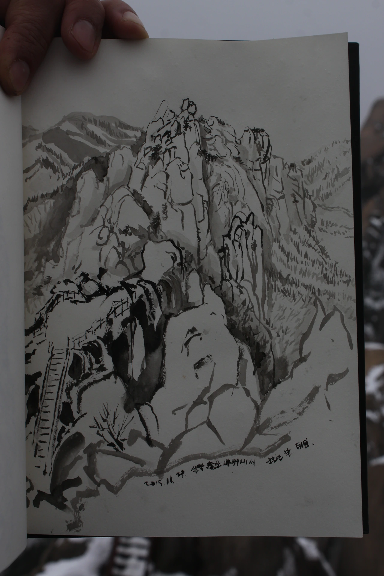 그 구석에 앉아 ‘울산바위’의 아름다움에 빠져 있자니 시간이 너무 아까운 생각이 들어 스케치북을 펼쳐 들었다. 사람들이 너무 많이 오가는 바람에 조금 창피하기도 했지만 눈발이 날리면서 사람들의 체류시간을 줄여주니 나 역시 맘이 급해지기 시작해서 채색 없이 먹선만으로 울산바위의 얼굴을 떠 왔다.