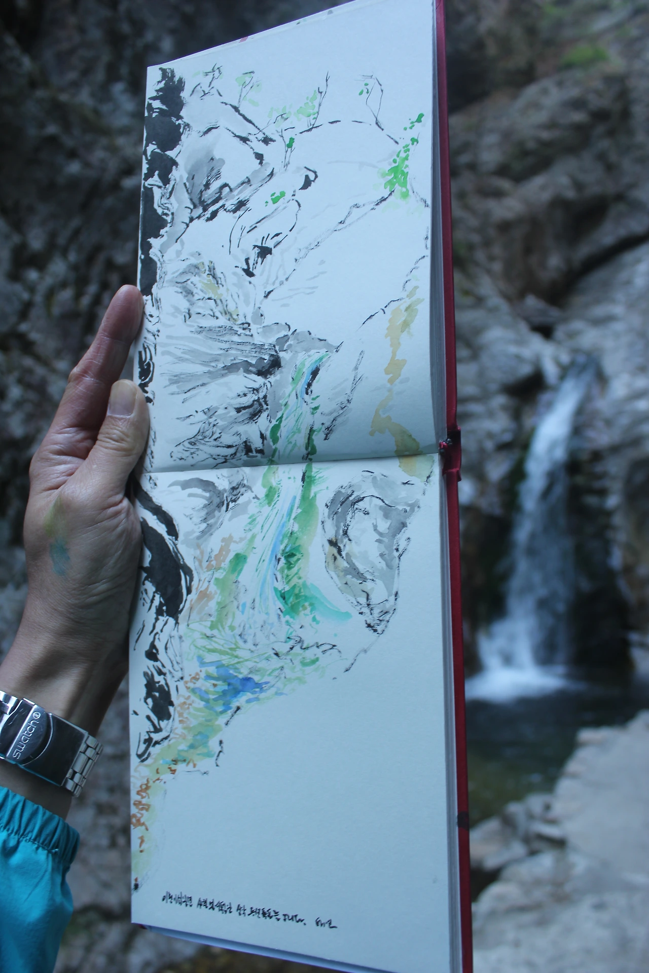 그 폭포 앞에 앉아 떨어지는 물소리를 들으며 스케치를 한다.