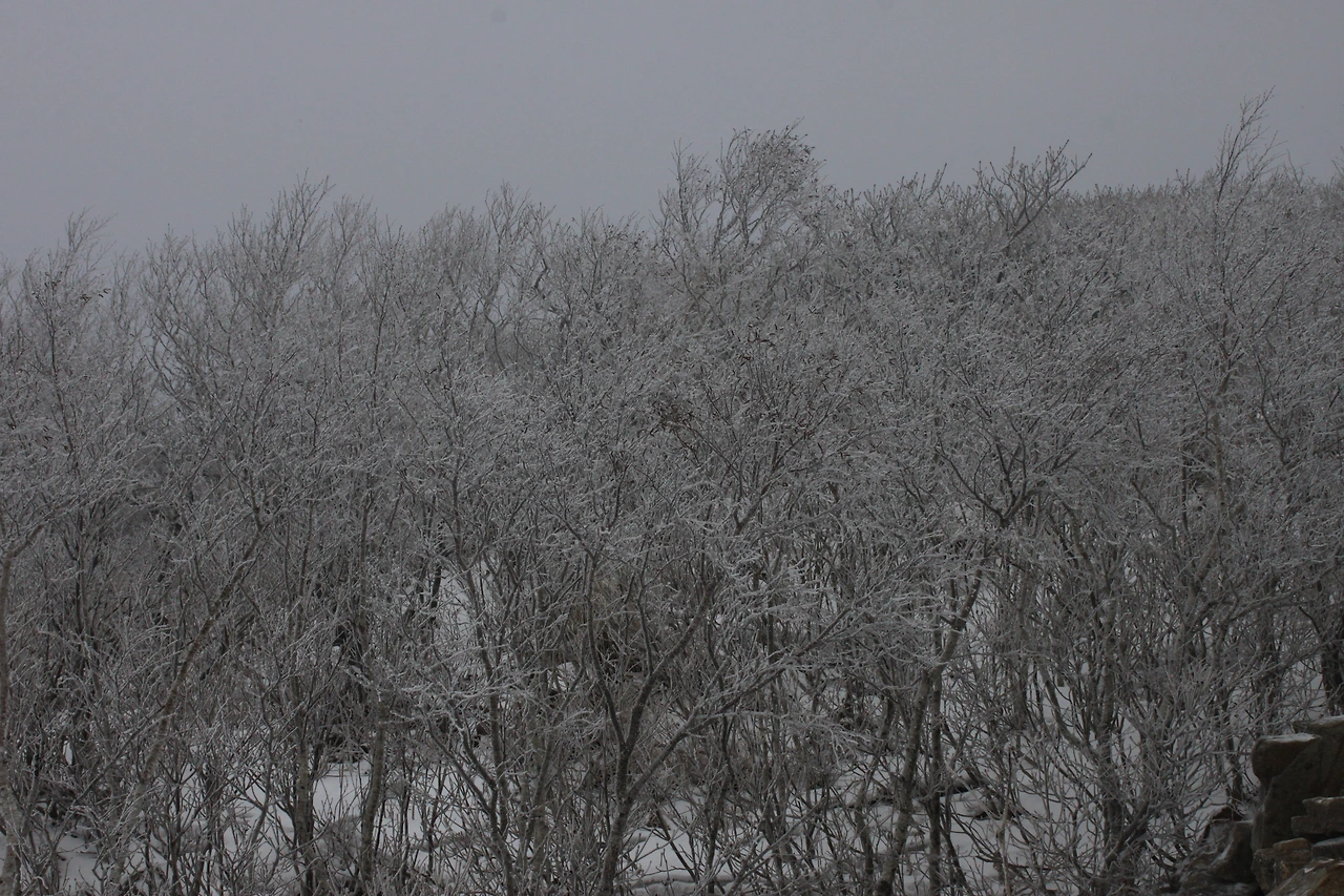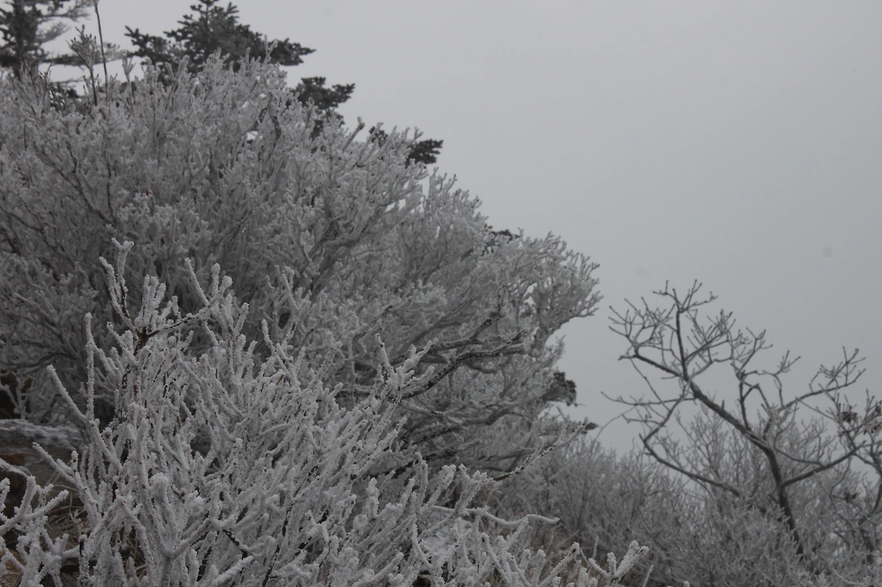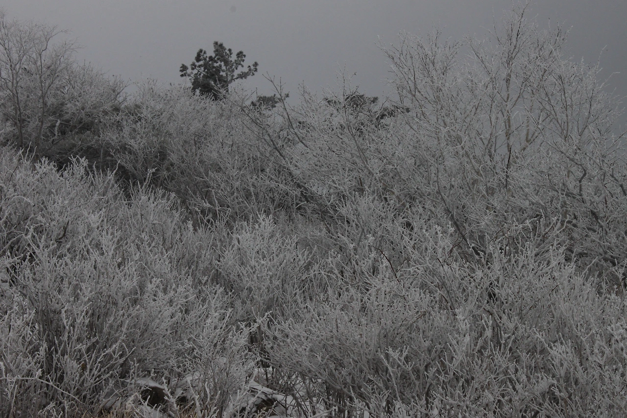 새벽이슬이 얼어서 나무에 빛을 발하며 만들어낸 '상고대'에 아침부터 흩날리는 눈이 범벅이 되어 맛있는 눈의 모습을 재현하고 있었다.