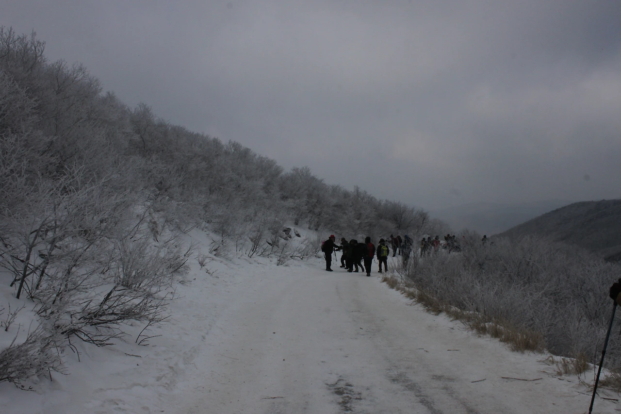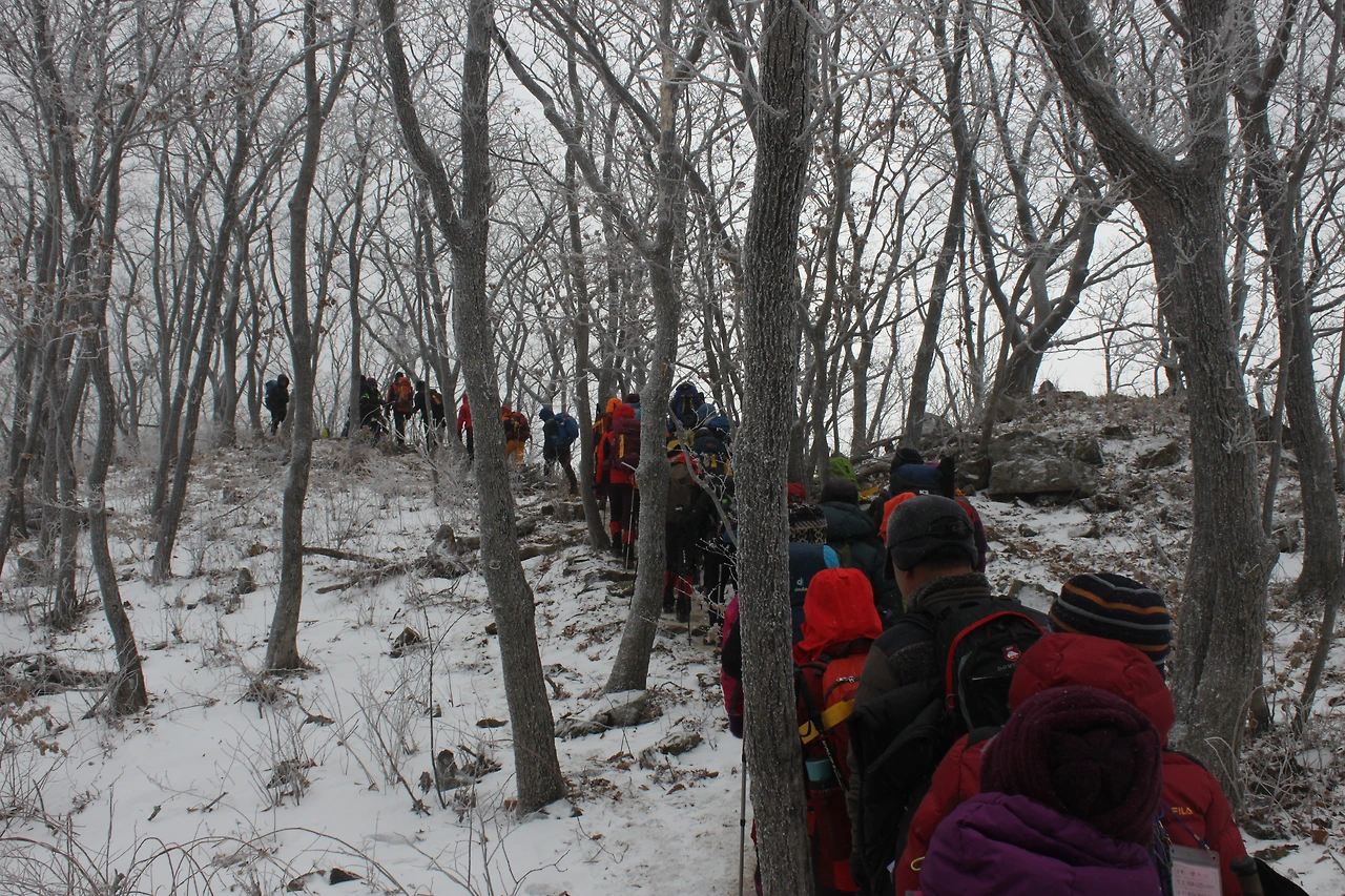 게다가 마지막 산봉우리인 ‘은대봉‘이 기다리고 있었다. 일행과 조금 거리를 두며 척후병으로 먼저 가면서 10분 간격으로 통화를 한다. 사람들은 막힘이 없으나 산의 오름길이 숨을 가파르게 한다. 오르고 올라 ’은 대봉’에 입성, 30여분을 남겨두고 산을 내려가기 시작한다. 중간에 벗었던 아이젠도 몇 번 미끄러지면서 다시 찰 수밖에 없다.