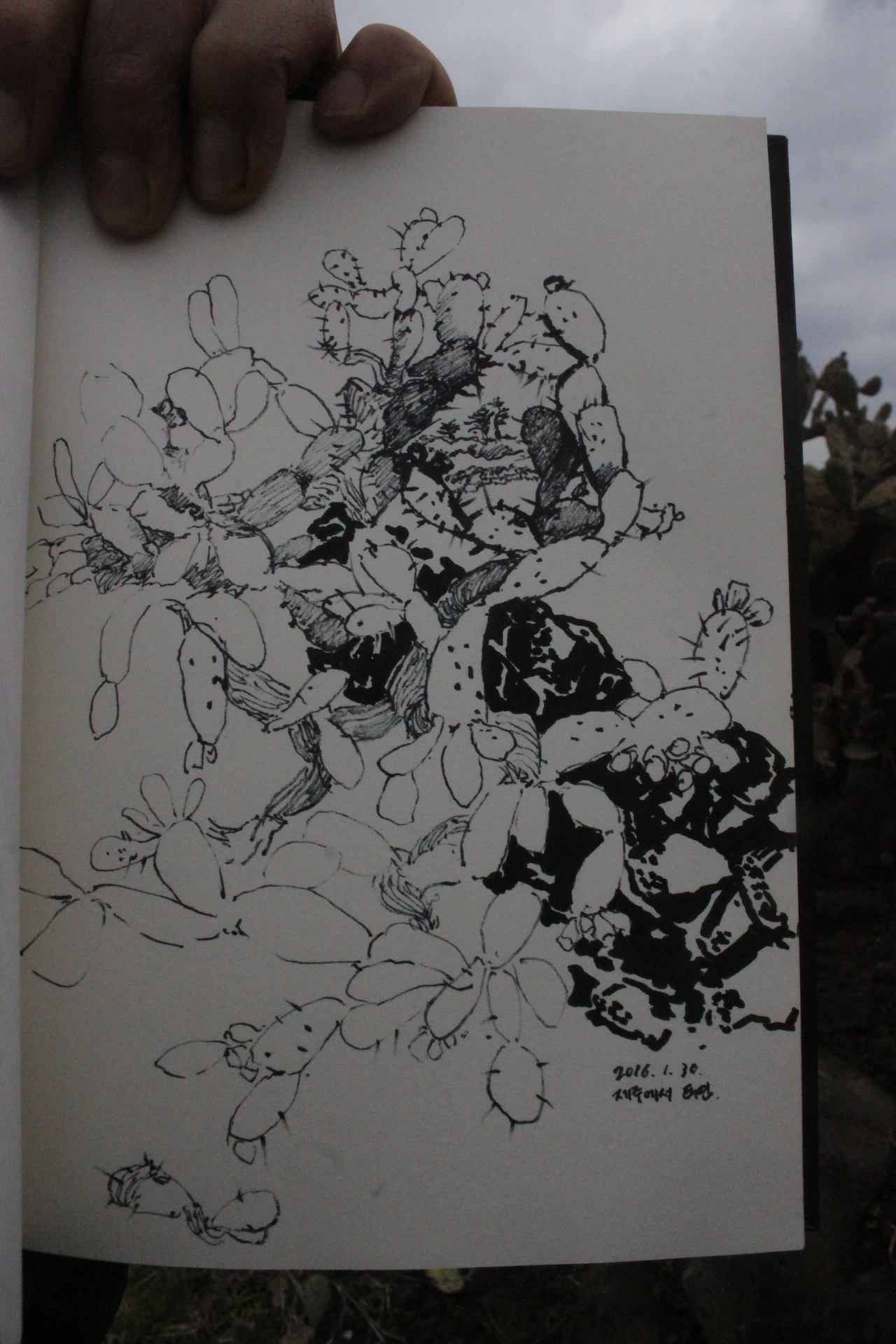 무아지경에 빠지며 스케치를 한 후 친구에게 전화를 하니 이미 한참을 앞서 가 있는 상황, 여유롭게 걷는 것도 좋겠다는 생각이었지만 기다리는 친구와의 간격을 좁히기 위해 서둘러 걸었다. 자생지와 연결되어 있는 길의 안내판을 통해서 이곳 선인장의 유래를 보고, 바닷가 돌 틈에서 자생하는 끈질긴 선인장의 자생력에도 감탄한다.